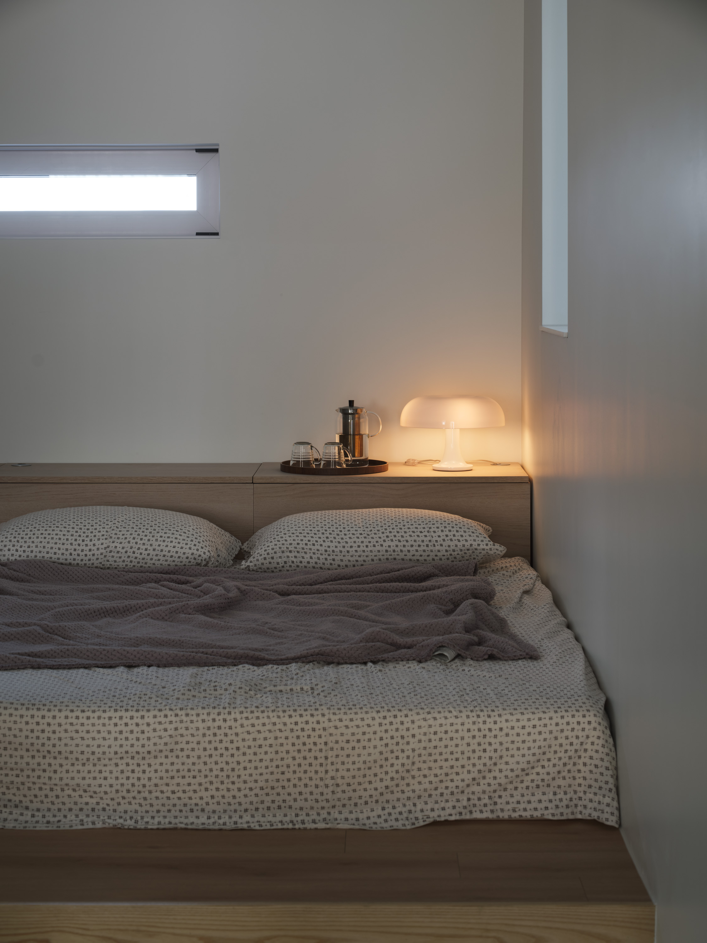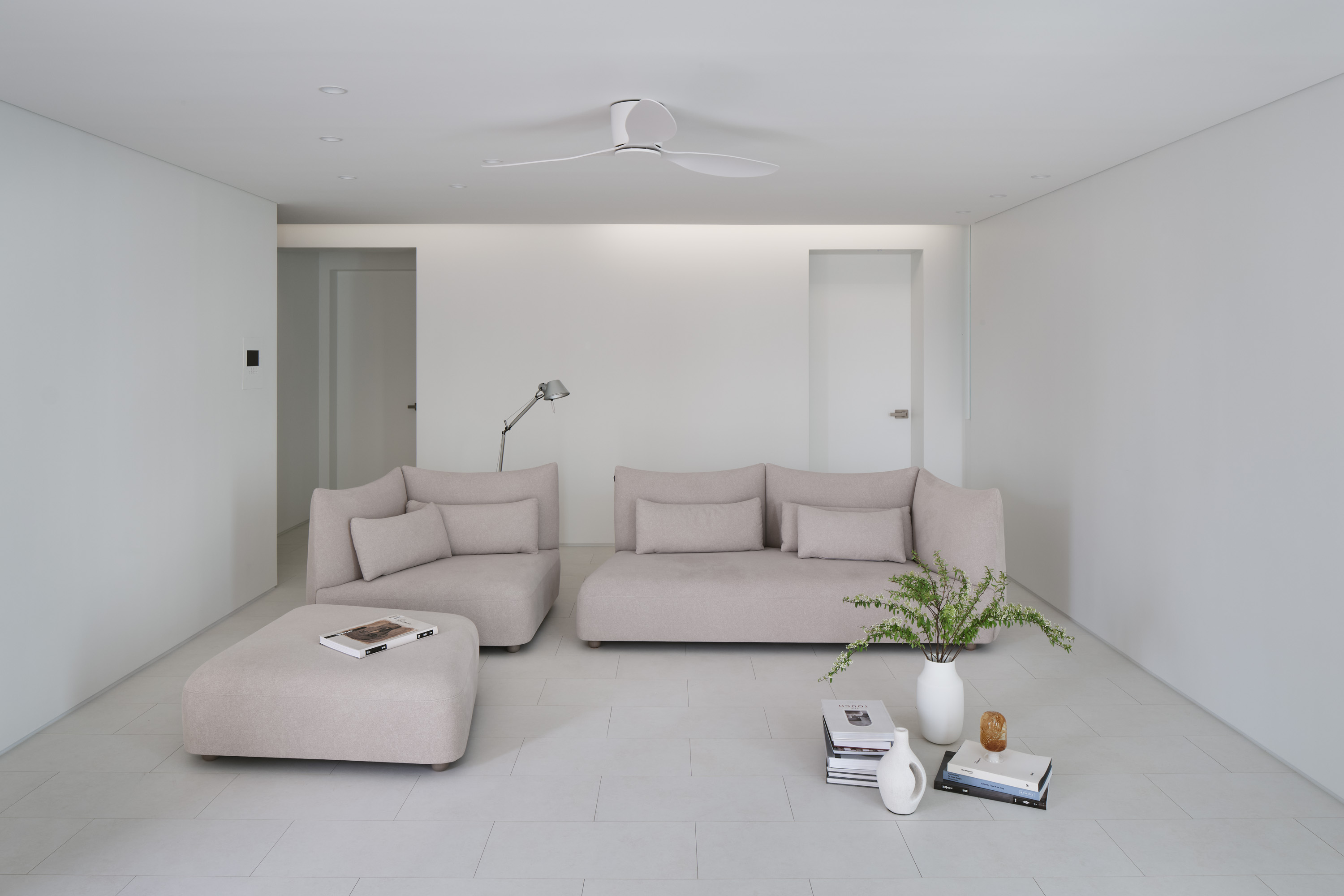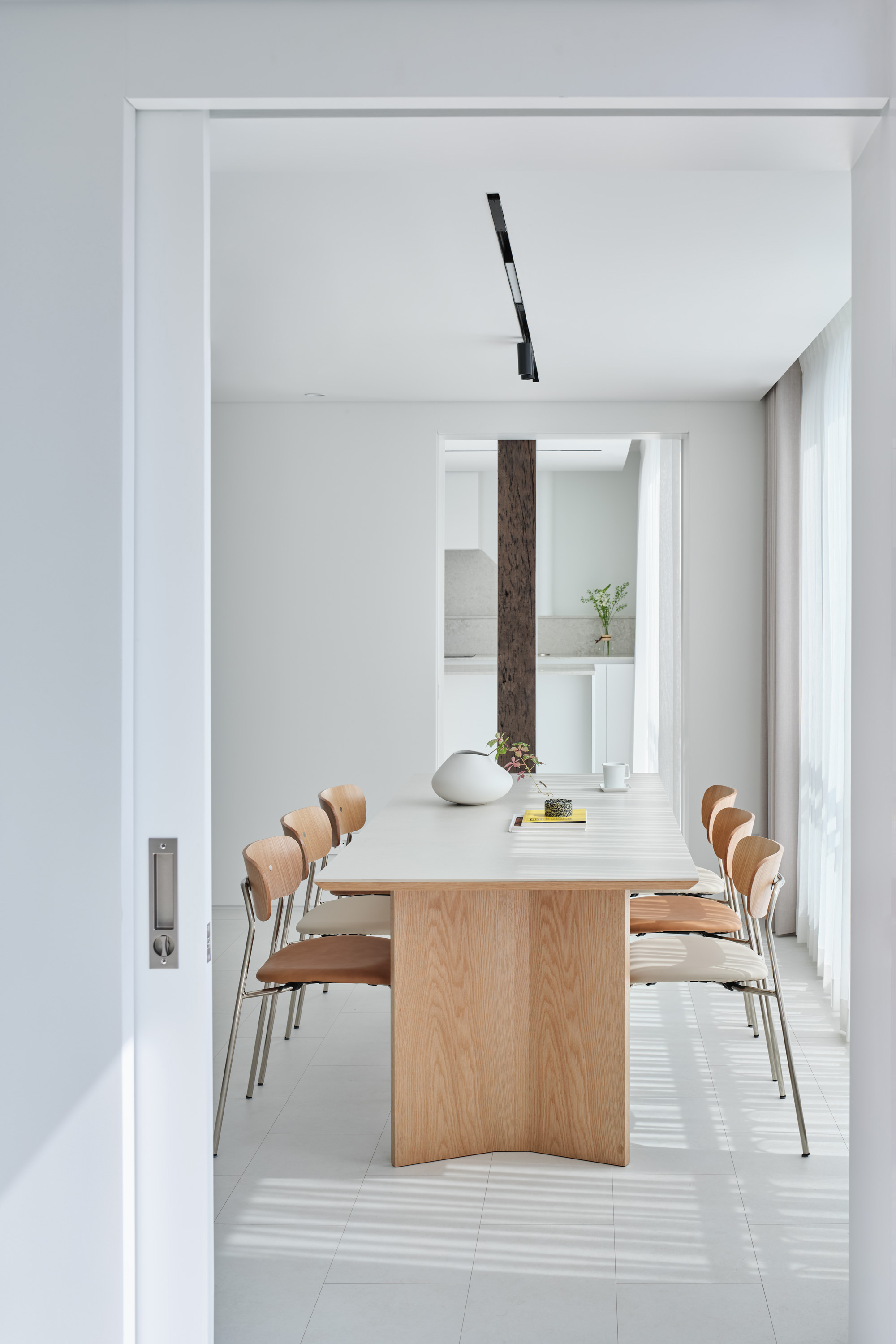 현대의 아파트 구조는 치열하게 바뀌어 왔다. 식사와 요리는 가족, 친구들과 공유하는 즐거움이 되었고 주방과 식당은 주거의 중심이 되었다. 침실은 일반적인 침대 생활과 함께 특성화된 개별 실로 자리 잡았다. 디자이너는 빛을 절제하는 것이 오히려 장점이 될 수 있는 침실을 북측으로, 손님을 맞이하고 가족들이 모여서 시간을 나눌 수 있는 주방을 남측으로 배치했다. 세탁실은 드레스룸과 연계성을 높이고, 스타일러는 현관 가까이에 배치하여 외투를 정리하는 위치를 정의한다. 확장된 발코니는 서재와 주방으로 접근하는 기존 동선을 살려서 앙필라드(Enfilade) 형식으로 배치했다. 우수관은 동선을 가로막는 장애물에서 새로운 오브제로 해석할 수 있도록 디자인했다.