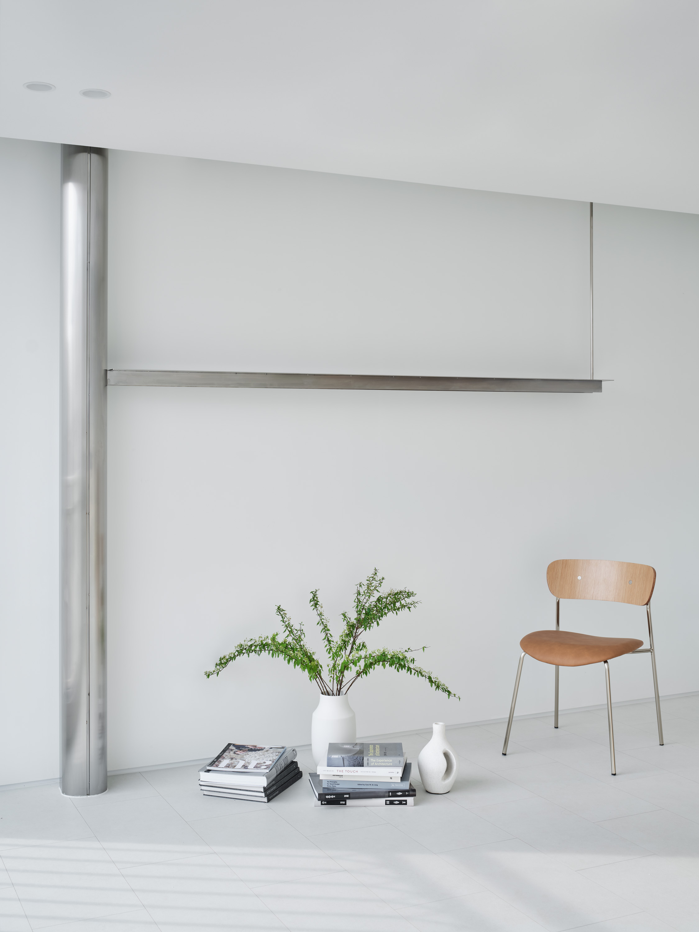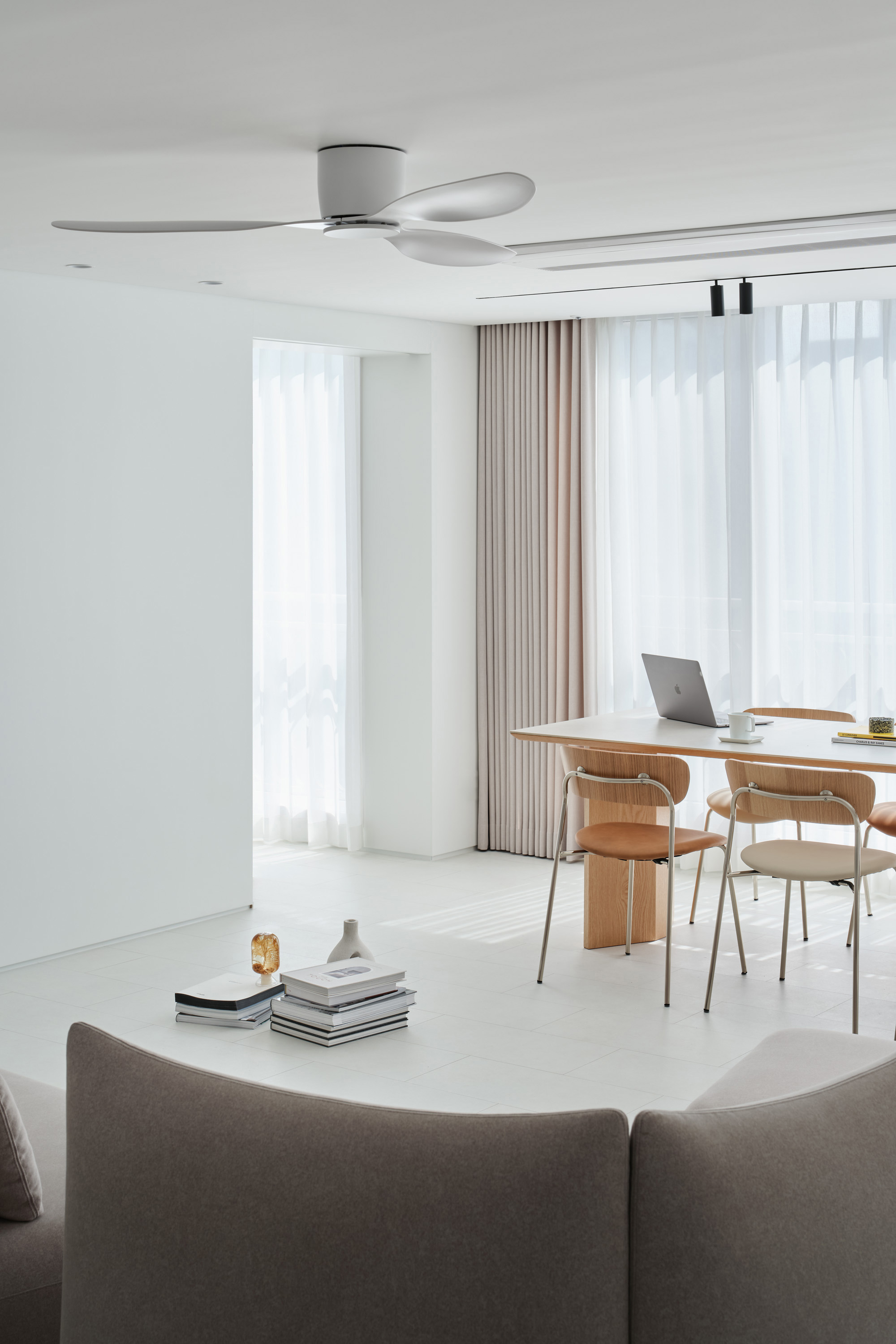 The layout of modern apartments has changed dramatically. Cooking and dining have become activities enjoyed with family and friends, making the kitchen and dining area central to the home. Bedrooms have become specialized individual rooms accommodating typical use of beds. The designers placed the bedrooms on the north side, where the restraint of light can be an advantage, and the kitchen on the south side, to welcome guests and serve as a family gathering space. The laundry room is integrated with the dressing room, and the styler appliance is placed near the entrance to establish the location for organizing outerwear. The expanded balcony maintains the traditional flow towards the study and kitchen and is arranged in an enfilade style. The rainwater pipes are designed to be reinterpreted from obstacles of circulation to new objects of design interest.