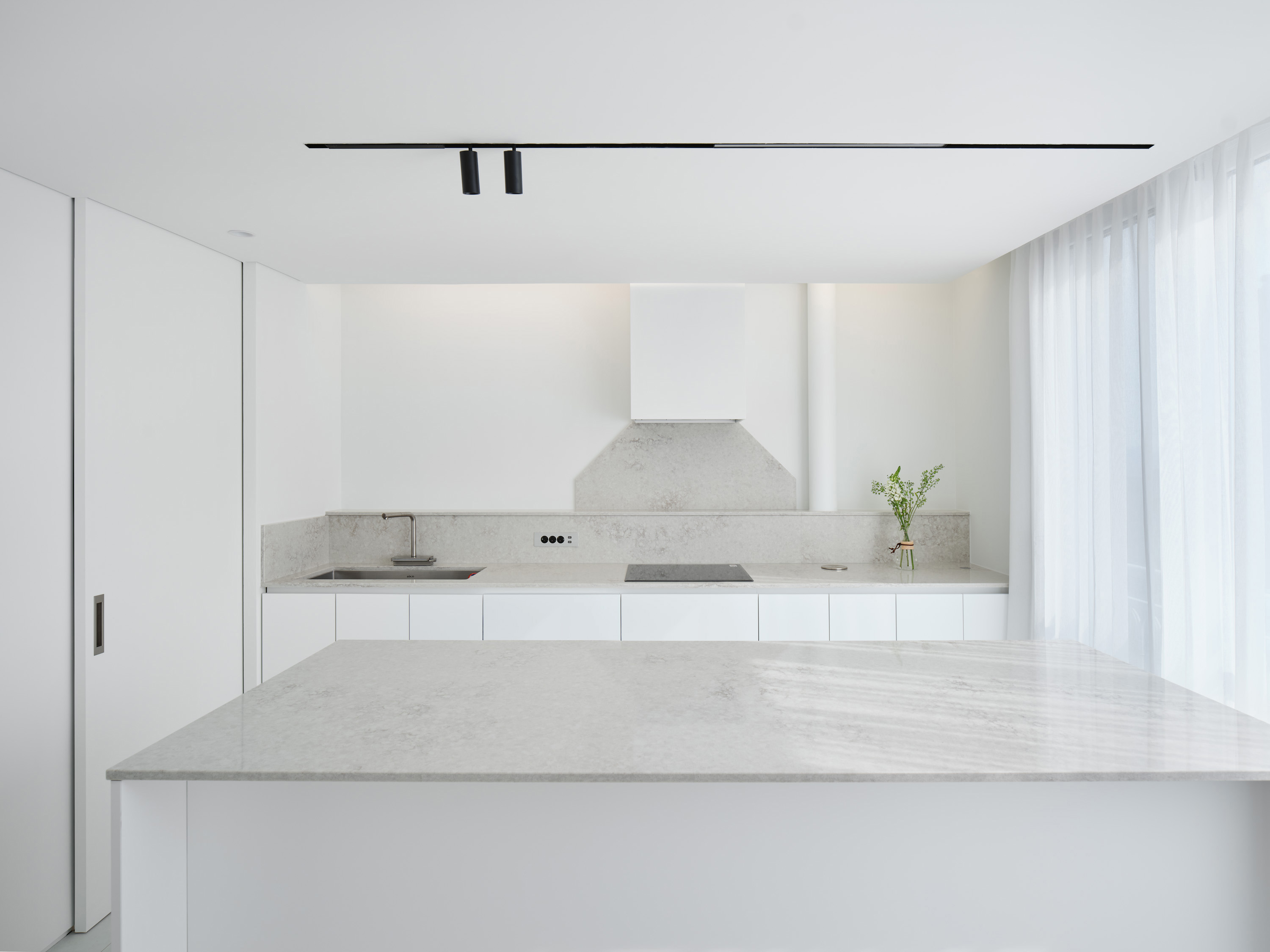 현대의 아파트 구조는 치열하게 바뀌어 왔다. 식사와 요리는 가족, 친구들과 공유하는 즐거움이 되었고 주방과 식당은 주거의 중심이 되었다. 침실은 일반적인 침대 생활과 함께 특성화된 개별 실로 자리 잡았다. 디자이너는 빛을 절제하는 것이 오히려 장점이 될 수 있는 침실을 북측으로, 손님을 맞이하고 가족들이 모여서 시간을 나눌 수 있는 주방을 남측으로 배치했다. 세탁실은 드레스룸과 연계성을 높이고, 스타일러는 현관 가까이에 배치하여 외투를 정리하는 위치를 정의한다. 확장된 발코니는 서재와 주방으로 접근하는 기존 동선을 살려서 앙필라드(Enfilade) 형식으로 배치했다. 우수관은 동선을 가로막는 장애물에서 새로운 오브제로 해석할 수 있도록 디자인했다.