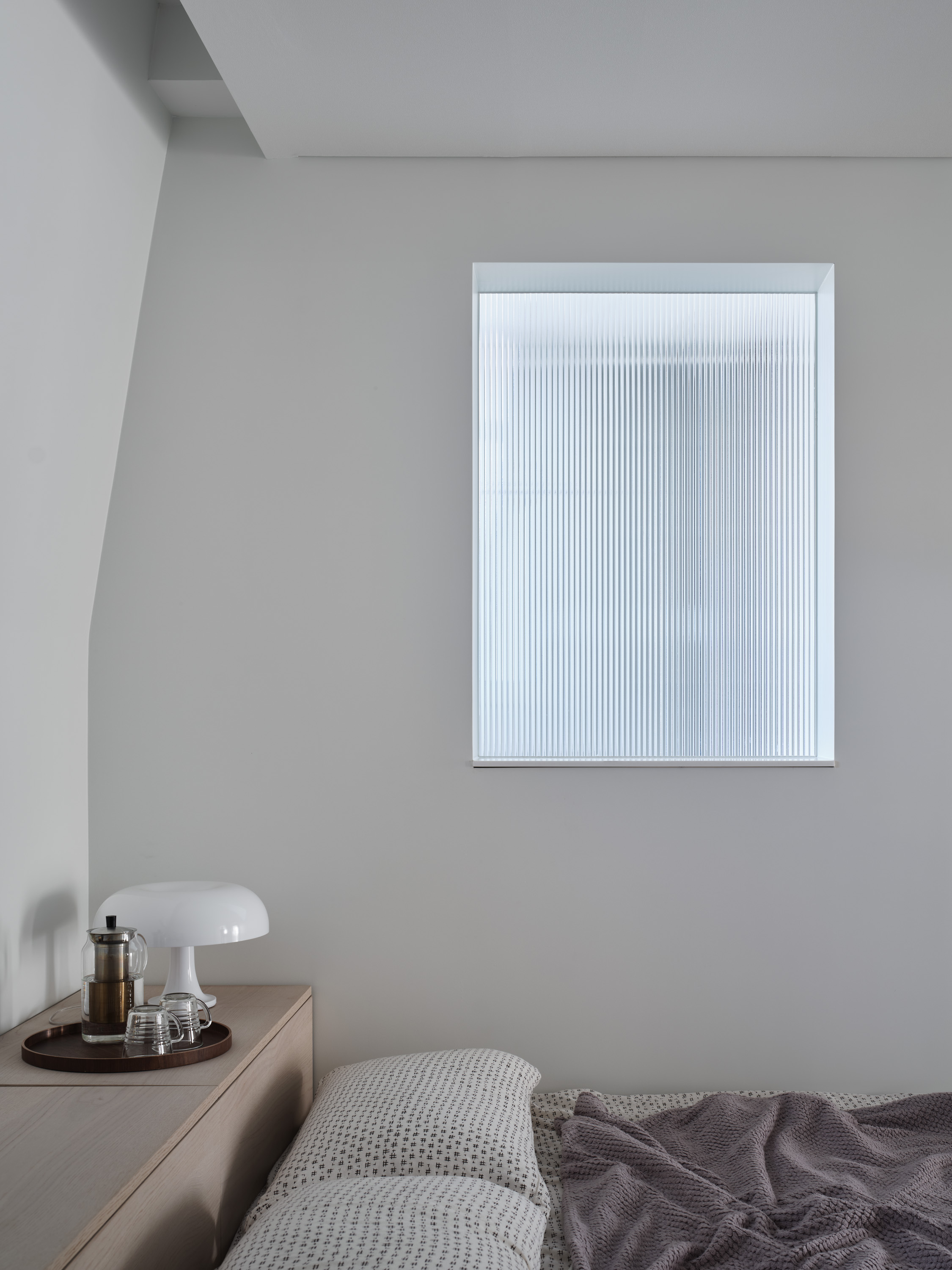 The layout of modern apartments has changed dramatically. Cooking and dining have become activities enjoyed with family and friends, making the kitchen and dining area central to the home. Bedrooms have become specialized individual rooms accommodating typical use of beds. The designers placed the bedrooms on the north side, where the restraint of light can be an advantage, and the kitchen on the south side, to welcome guests and serve as a family gathering space. The laundry room is integrated with the dressing room, and the styler appliance is placed near the entrance to establish the location for organizing outerwear. The expanded balcony maintains the traditional flow towards the study and kitchen and is arranged in an enfilade style. The rainwater pipes are designed to be reinterpreted from obstacles of circulation to new objects of design interest.