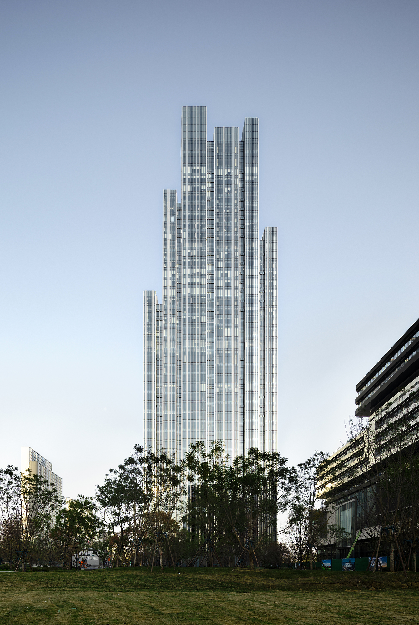 The Oppo Technology and Research Center Tower is located in the southern part of Chengdu, China, and serves as a research building for the mobile phone manufacturer Oppo. This project plays a significant role in the master plan of the Singapore-Sichuan Hi-Tech Innovation Park. The 42-story structure stands out among the surrounding low-rise buildings, enhancing its recognition. The perpendicular grooves along the building break down its large volume, while the “lantern” space at the top creates an effect of the upper part blending into the sky. The architect used a series of vertical curtain wall systems of varying widths, creating a dynamic and delicate pattern through the glass. The fluctuating depths of the mullions cast shadows on the facade, positively impacting the surrounding environment.