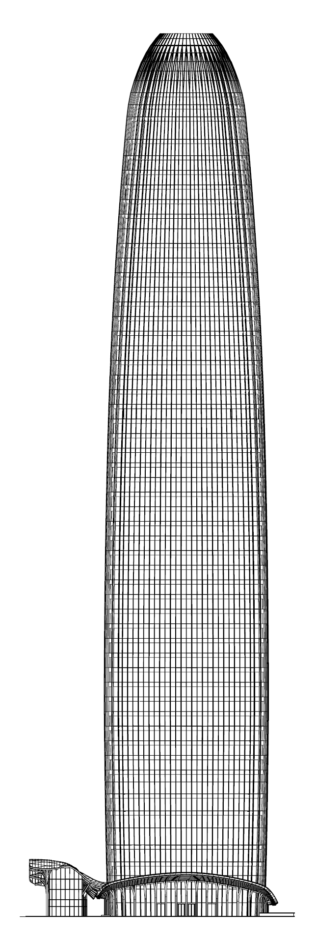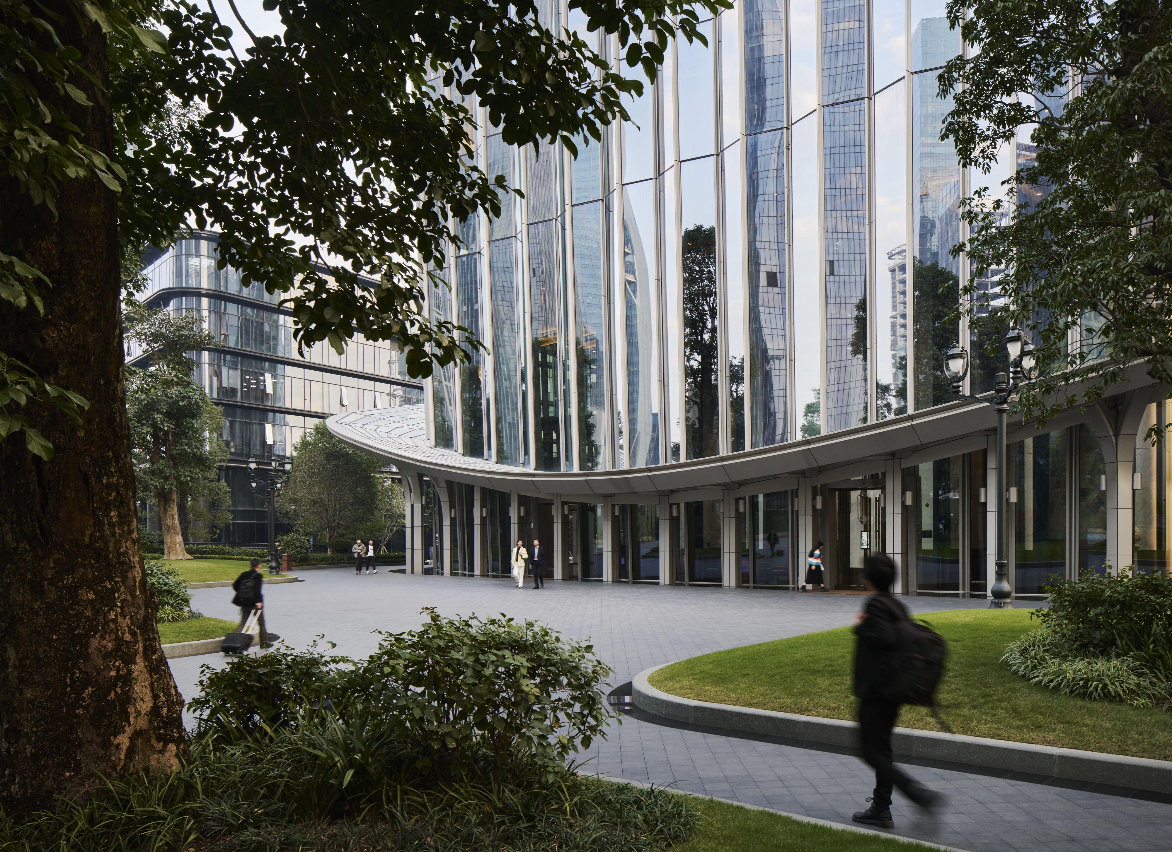 The Star River headquarters, added to the business district on Pazhou Island in Guangzhou, is a reimagined skyscraper that combines green spaces, covered walkways, and retail and commercial facilities. Historically a trade hub, Pazhou Island is emerging as a modern commercial center, and the new Star River headquarters symbolizes this transformation. From a distance, the building's wrinkled facade tapers upward in a parabolic shape, creating vertical planes of light and shadow that add to its uniqueness. The Star River headquarters is located near other high-rises designed by SOM, the Guangzhou Chamber of Commerce, and the SANY Irotech Pazhou. These buildings collectively redefine Pazhou's skyline, integrating the landscape and public spaces while introducing a new dimension of office architecture that strengthens the urban fabric of the Chinese city.