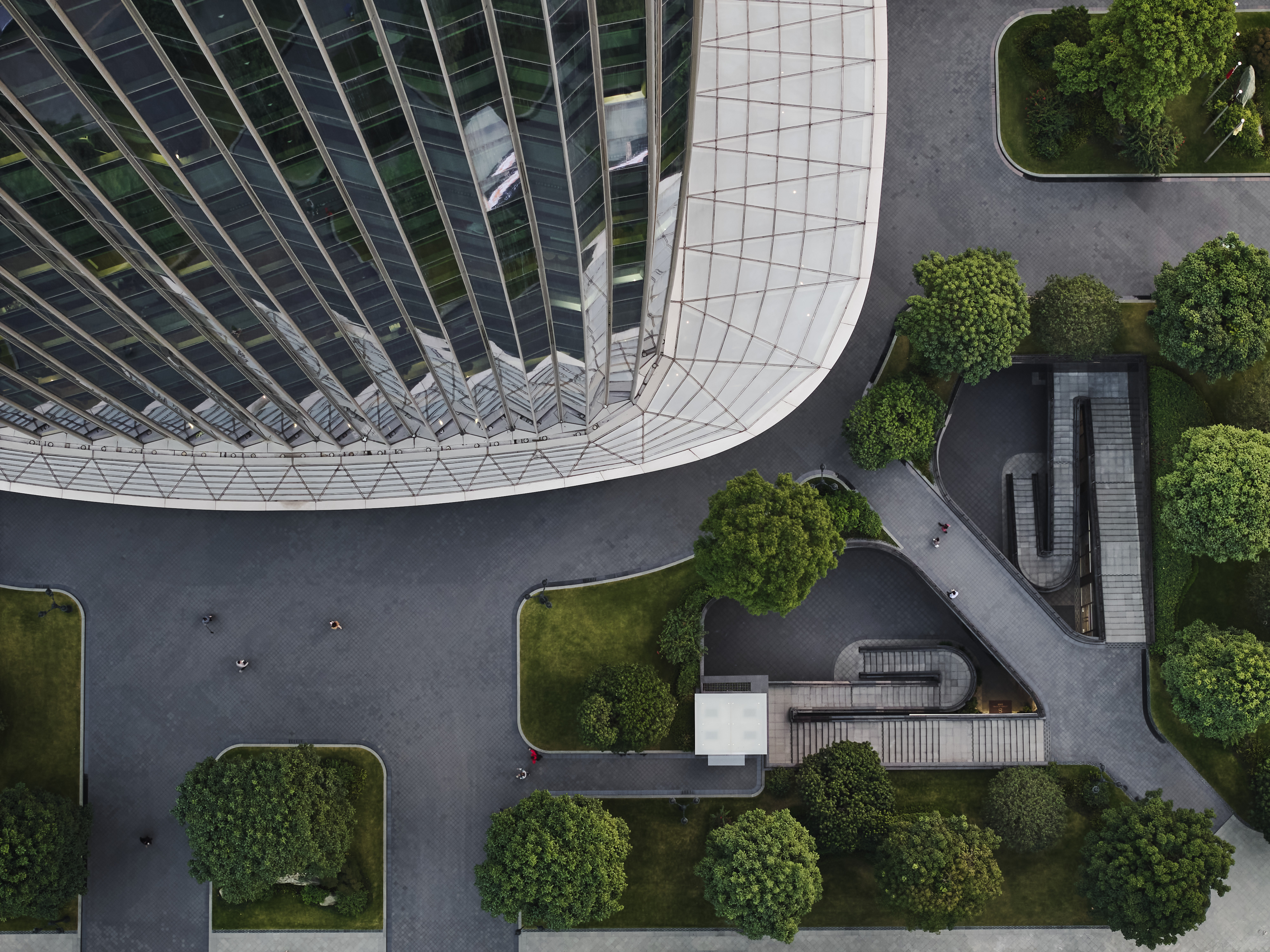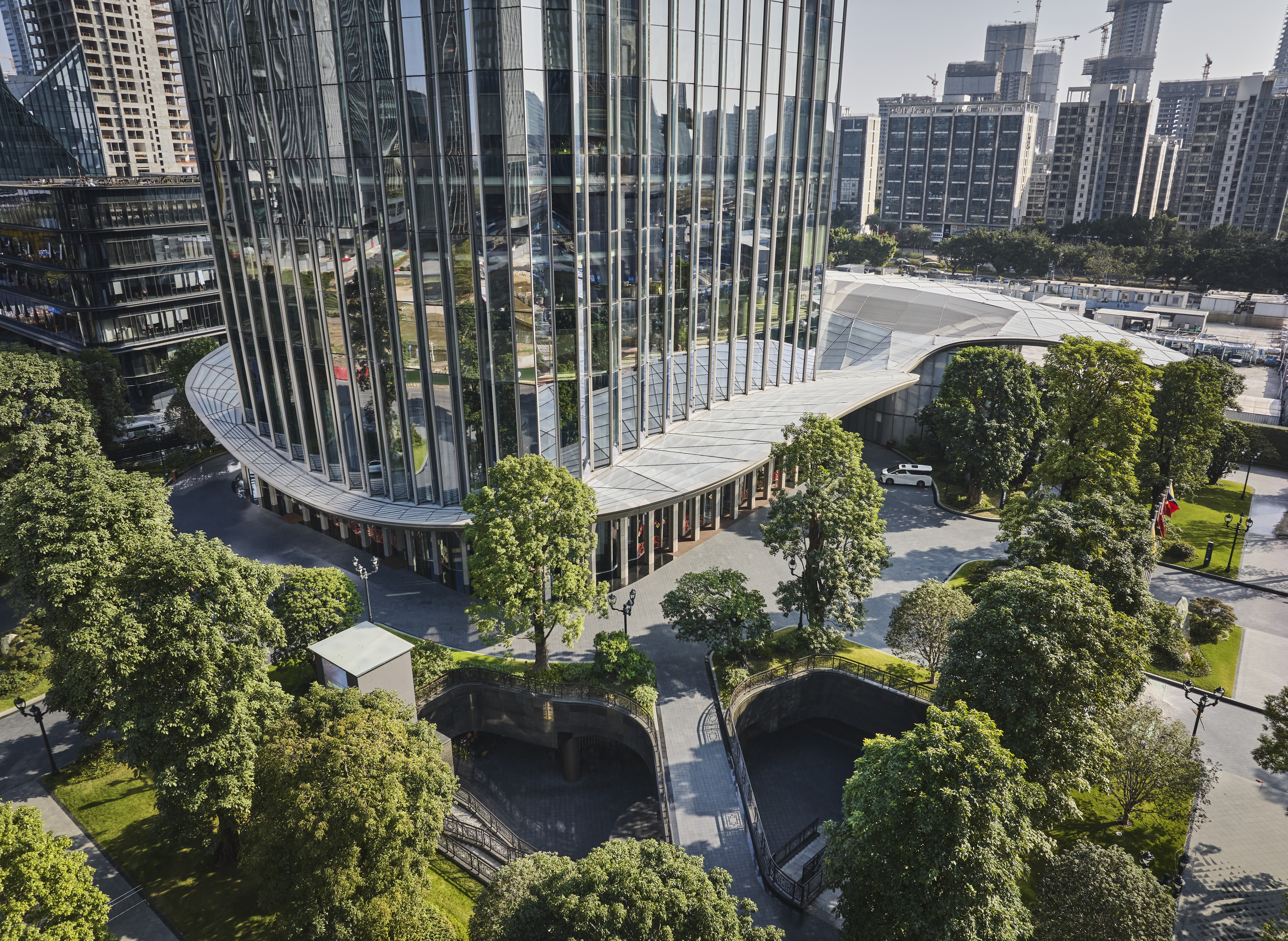 The lobby of the Star River headquarters functions as a modern public plaza, radially surrounded by lush natural landscaping and glass. The building's signature canopy extends over the block's edge to conceal mechanical rooms while also serving as an arcade roof for pedestrians. The terraced entrance, carved into the ground, connects to various retail stores and the subway. The building's tapering profile helps reduce wind loads and the rounded corners feature bright and open floor plates without columns, offering views of the Pearl River.