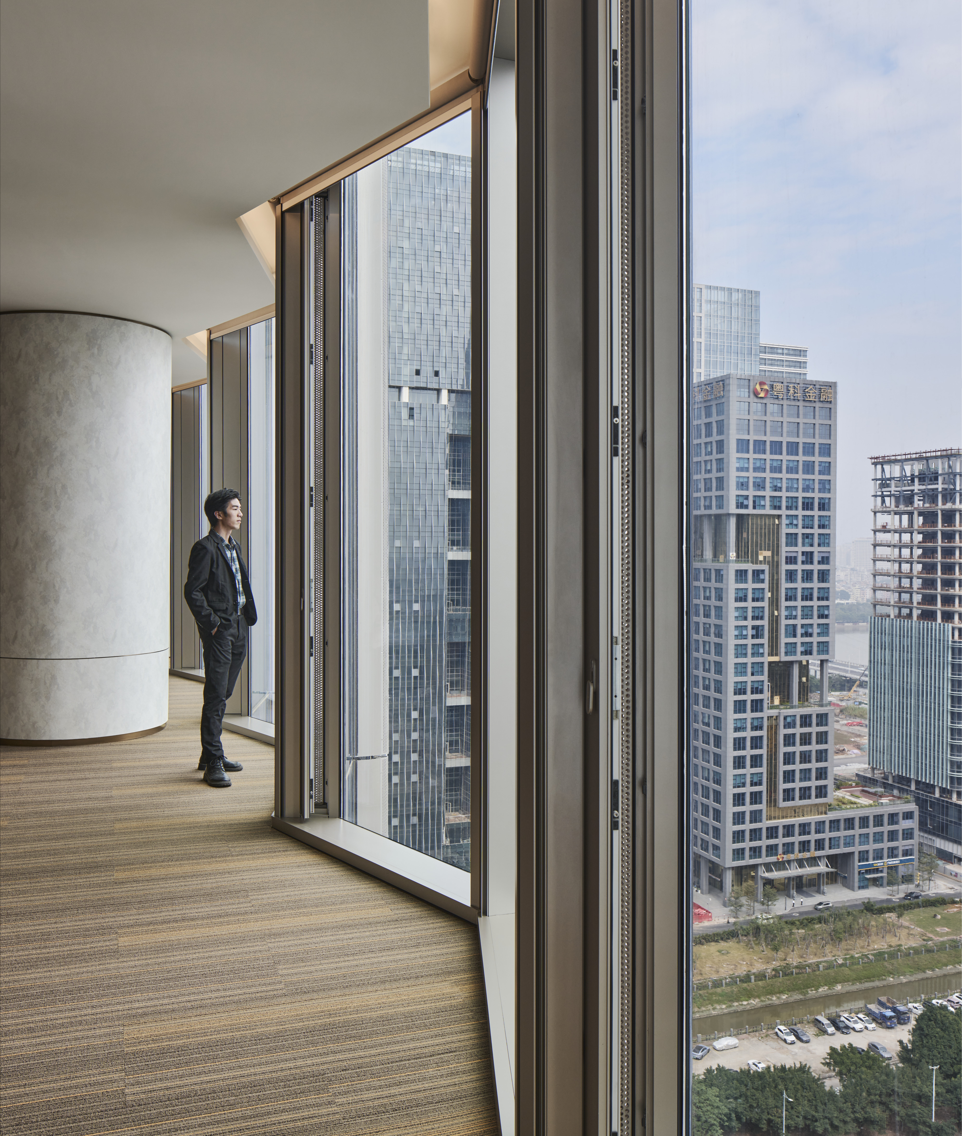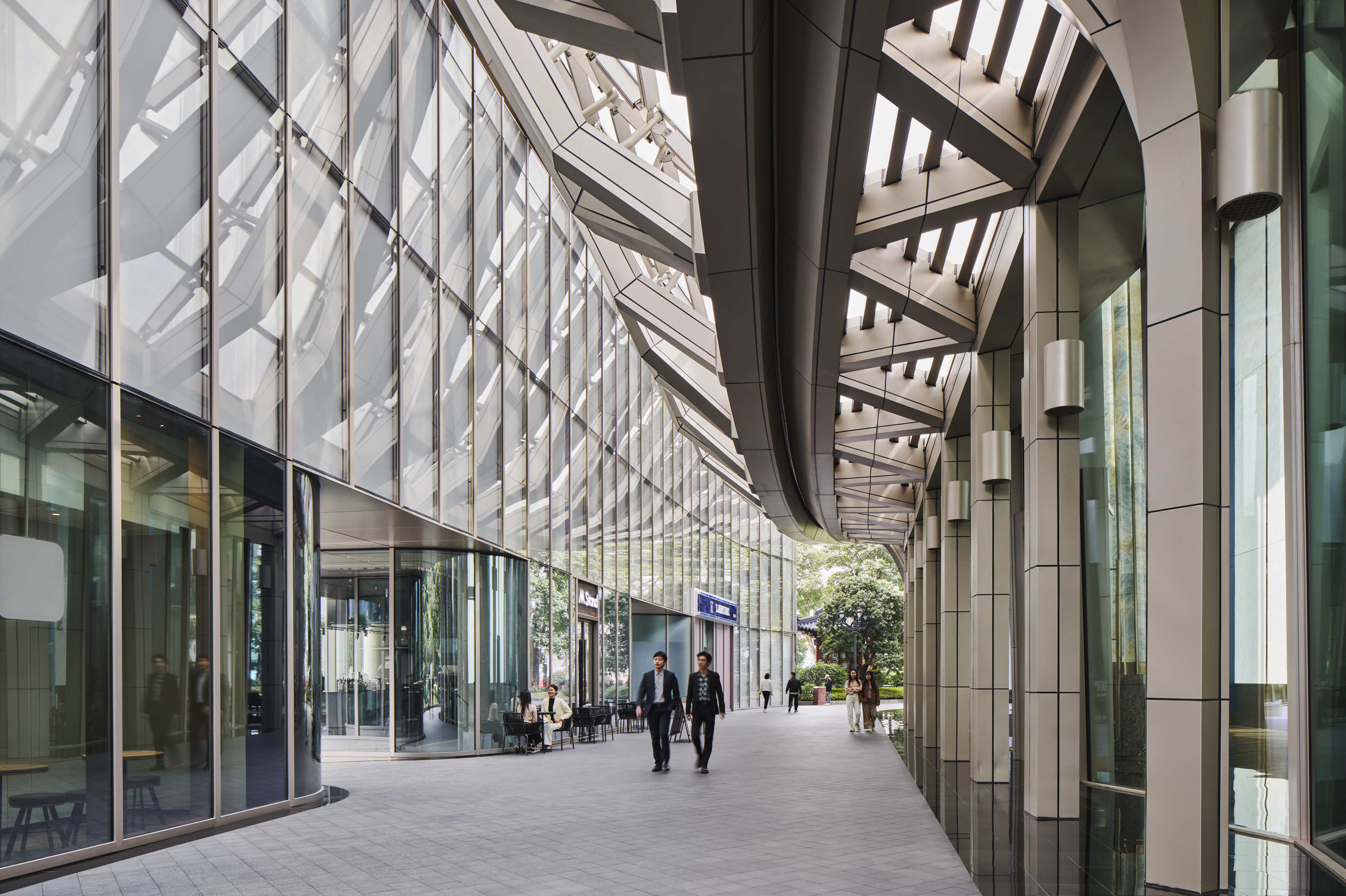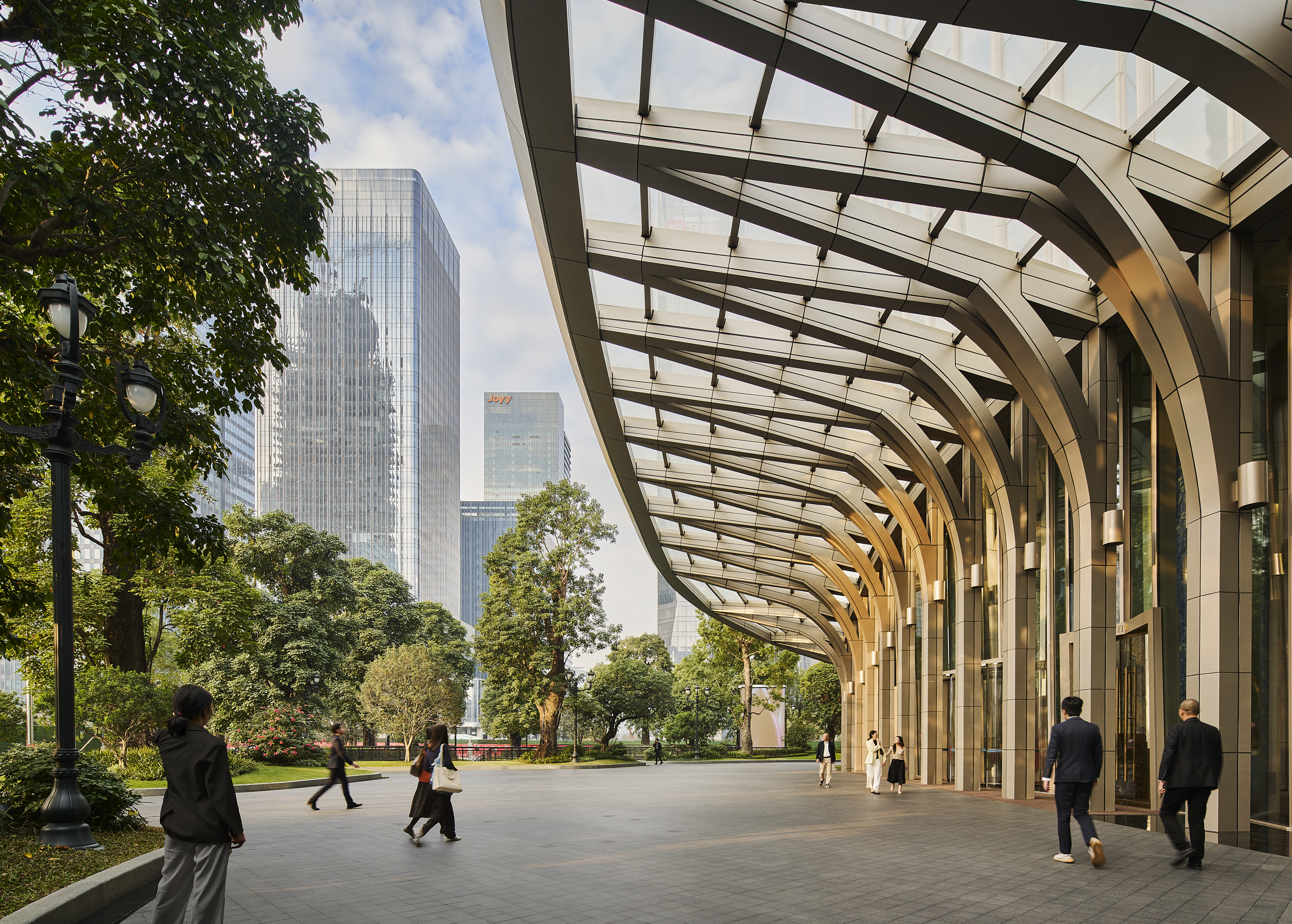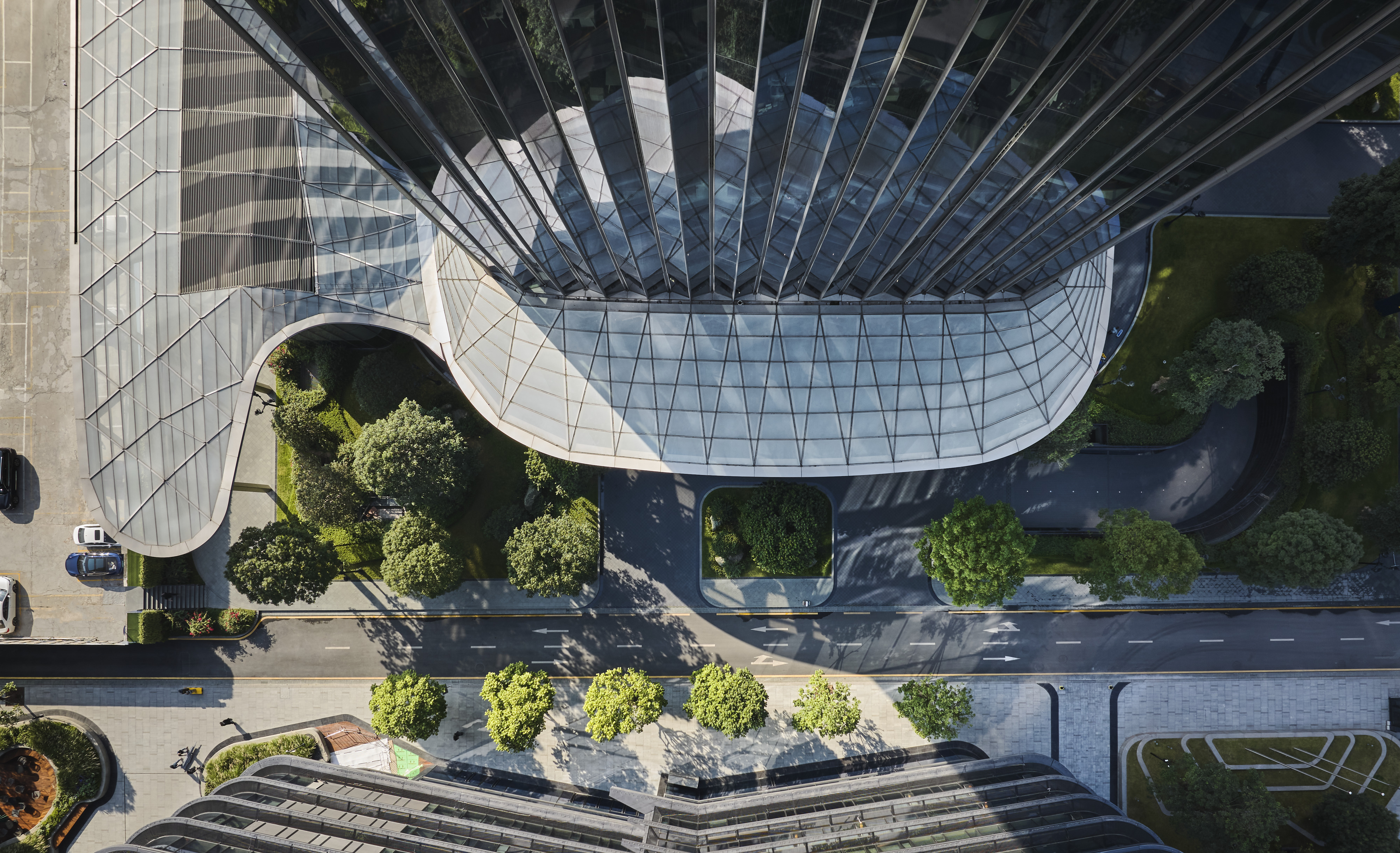 The Star River headquarters, added to the business district on Pazhou Island in Guangzhou, is a reimagined skyscraper that combines green spaces, covered walkways, and retail and commercial facilities. Historically a trade hub, Pazhou Island is emerging as a modern commercial center, and the new Star River headquarters symbolizes this transformation. From a distance, the building's wrinkled facade tapers upward in a parabolic shape, creating vertical planes of light and shadow that add to its uniqueness. The Star River headquarters is located near other high-rises designed by SOM, the Guangzhou Chamber of Commerce, and the SANY Irotech Pazhou. These buildings collectively redefine Pazhou's skyline, integrating the landscape and public spaces while introducing a new dimension of office architecture that strengthens the urban fabric of the Chinese city.