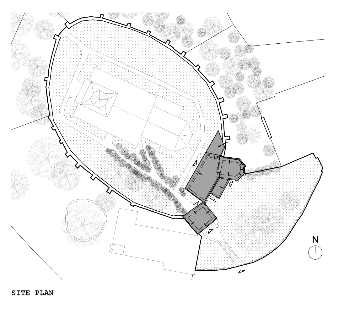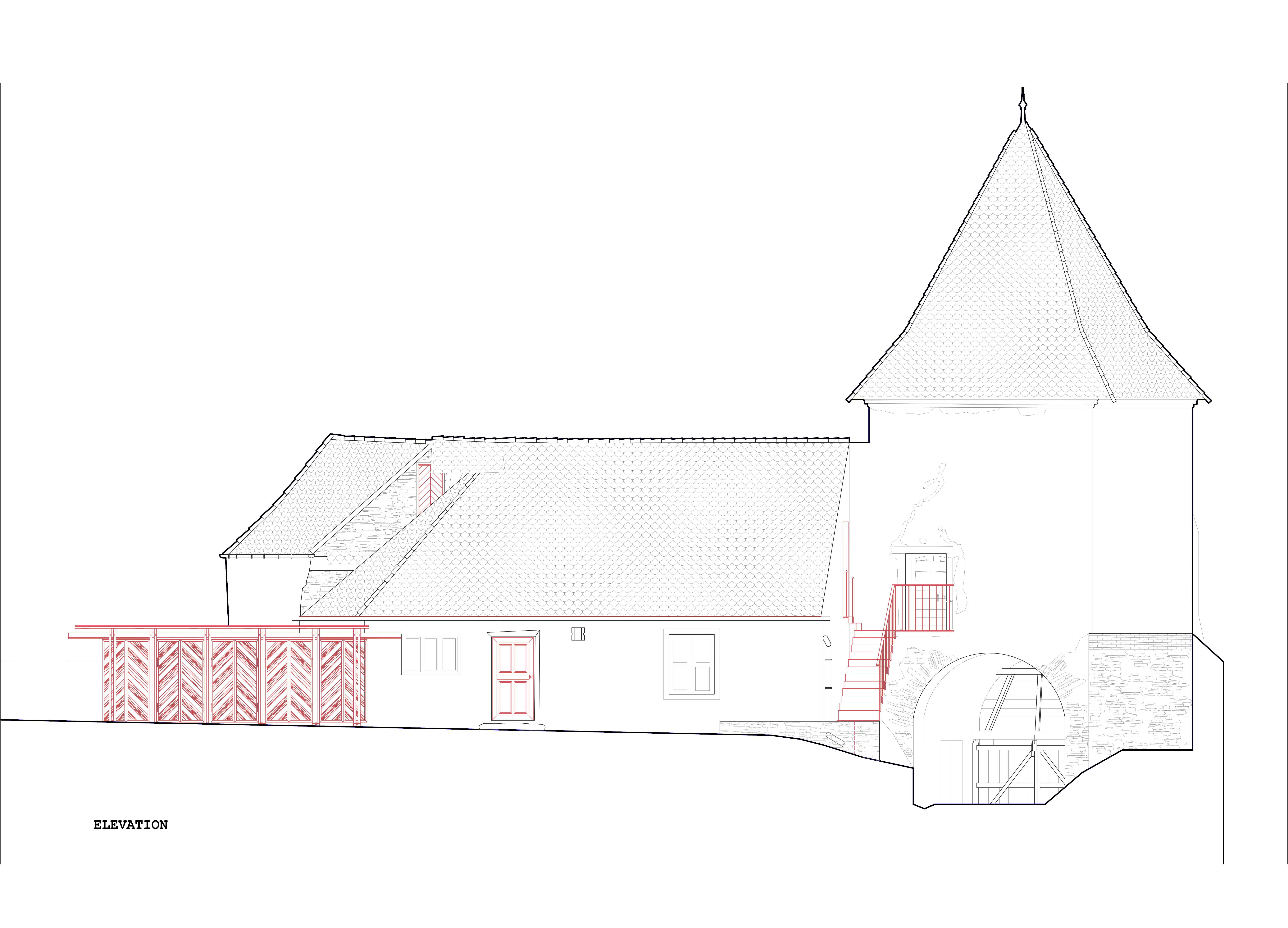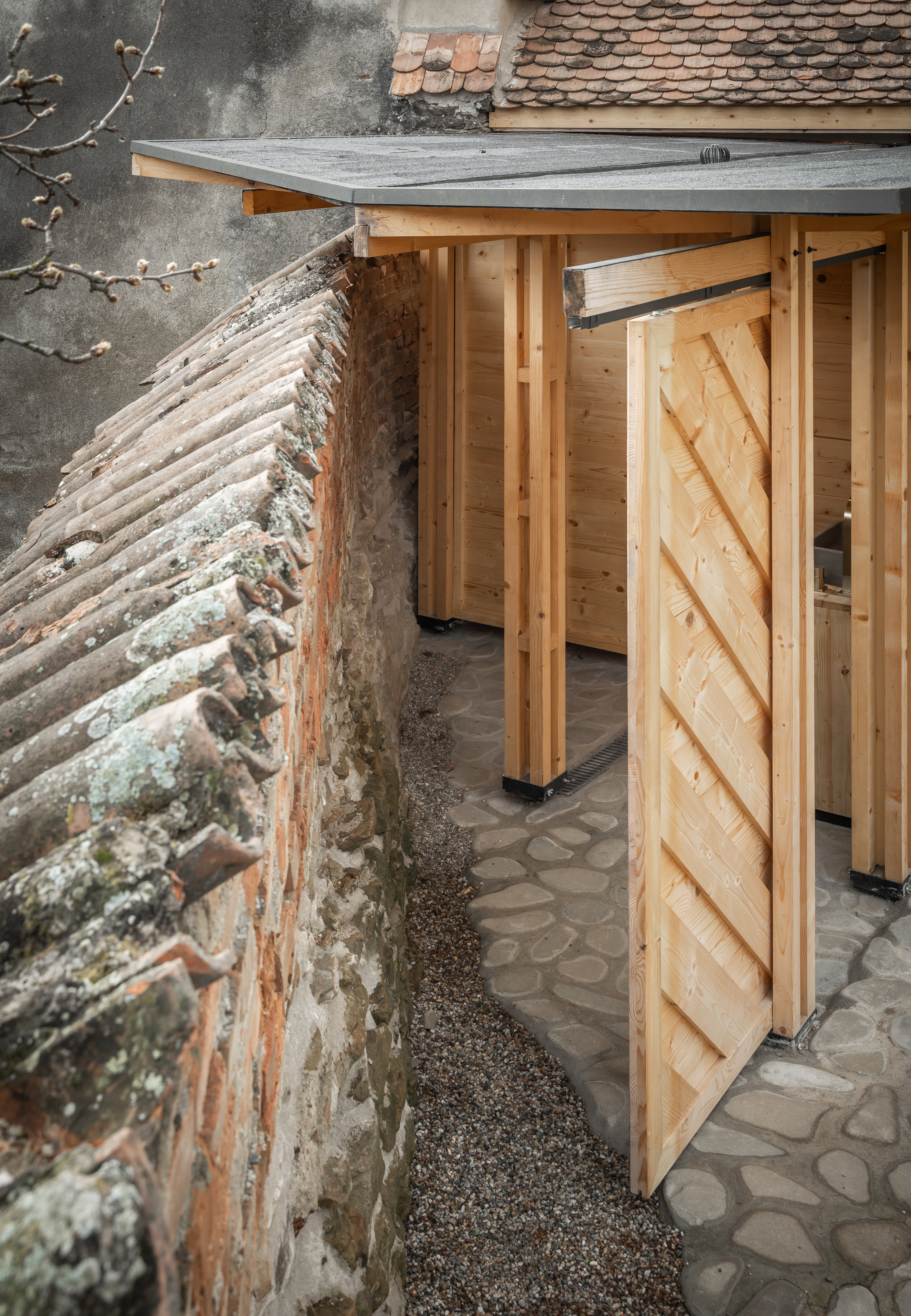 Increasing visitor numbers necessitates additional spaces. We propose a temporary wooden pavilion outside, integrated with the existing structure but standing out through contrast. This pavilion revitalizes the courtyard with an orthogonal structure that complements medieval masonry architecture.