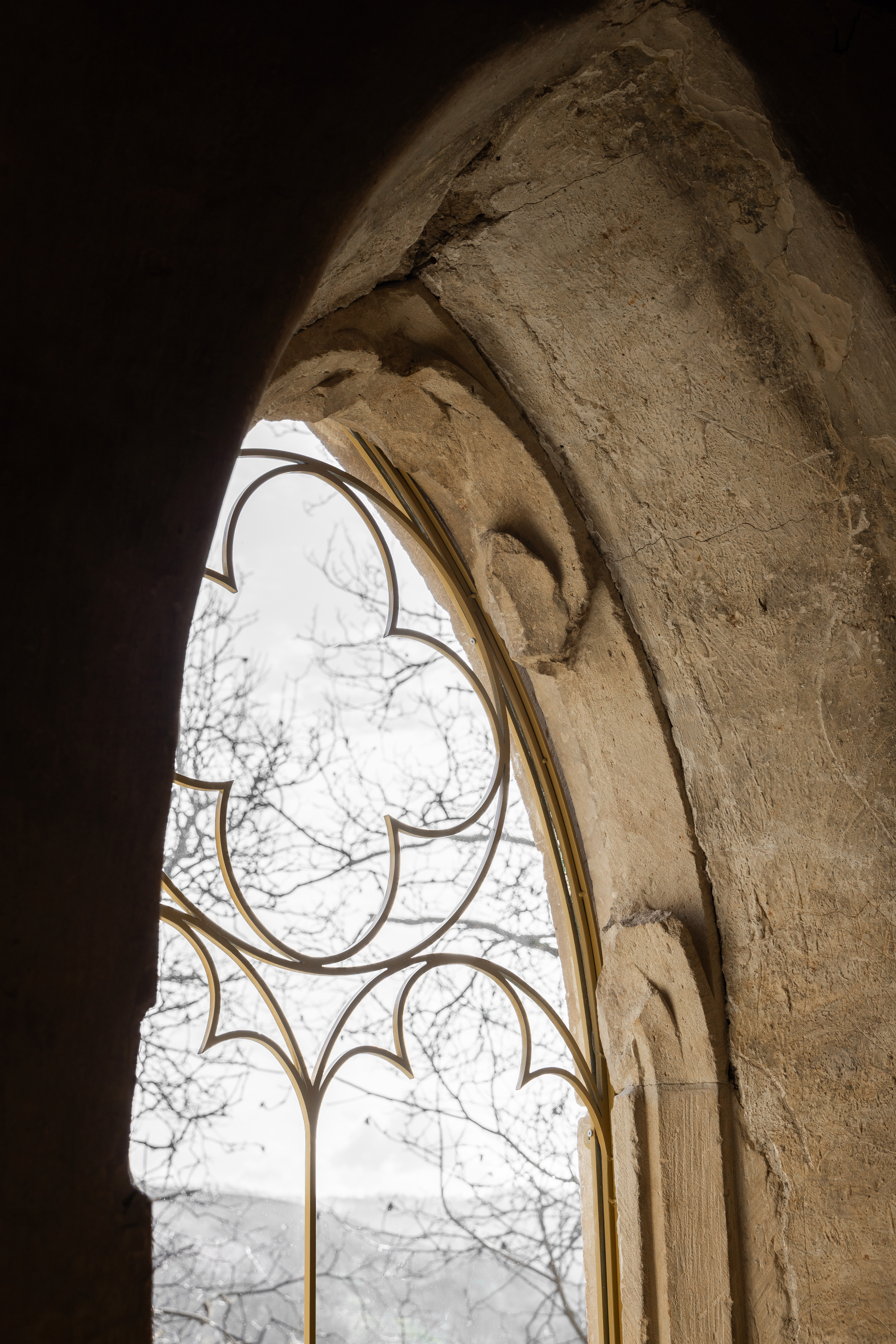 The main directions are conserving the existing structure and preserving its historical value. Artistic components, like the partially destroyed Gothic windows of the chapel, are treated rigorously to enhance their significance without obscuring them. We opted for a thin-profile frame to reconstruct the original design without substituting the original material, fulfilling technical requirements while preserving the historical value.