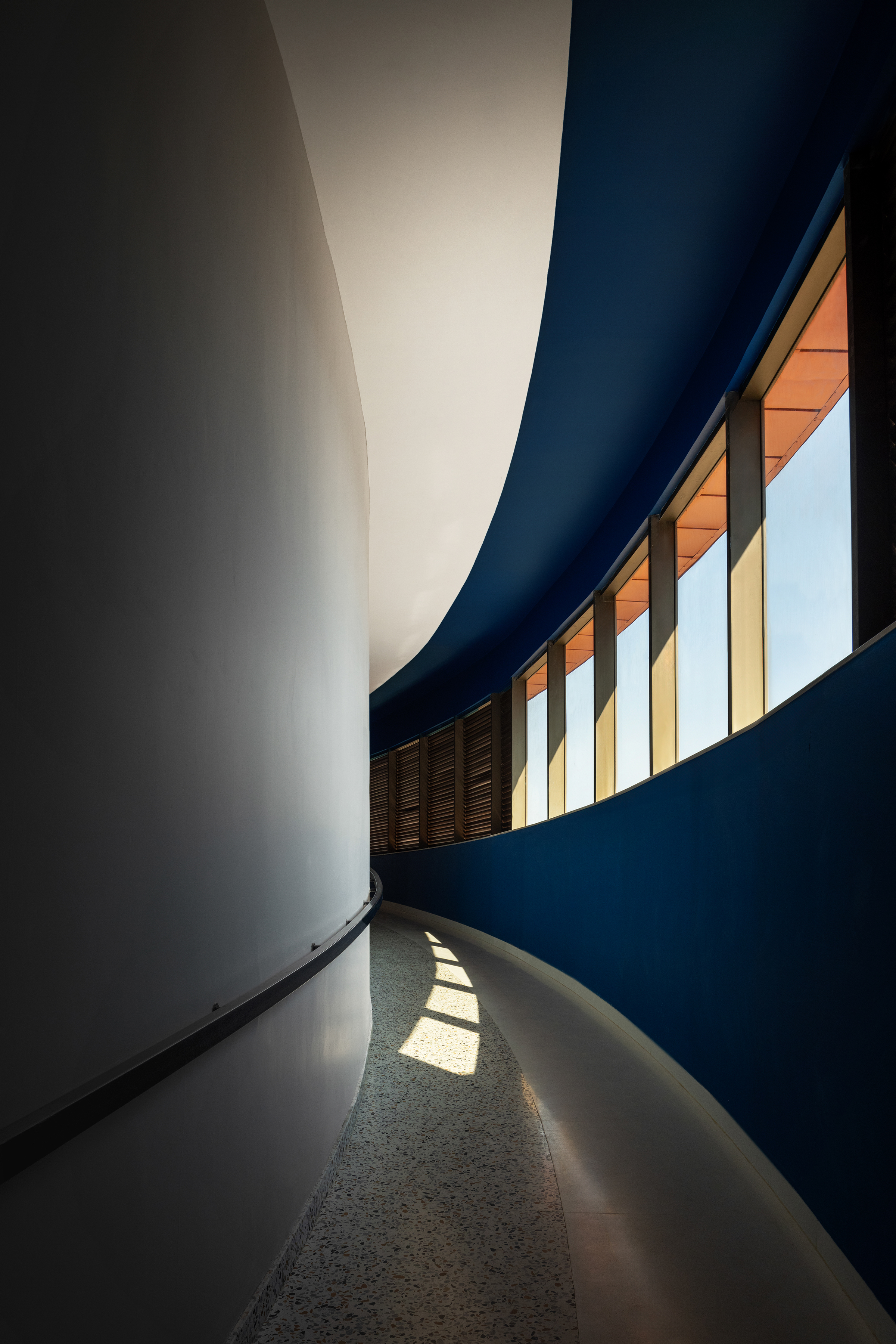 드라마틱한 느낌을 더하기 위해 내부에 다양한 패턴을 만들어 단순한 모양을 조작한다. 오렌지의 색조는 서까래의 패턴으로 구성되어 있고 의자의 경사는 모서리가 사라지고 형태가 외부에 반응하게 만든다. 서까래의 배경인 음향 패널은 차음재에 적합하다. 동심원의 빛 디테일이 돋보이는 천장은 공간의 전반적인 특성에 기여한다.