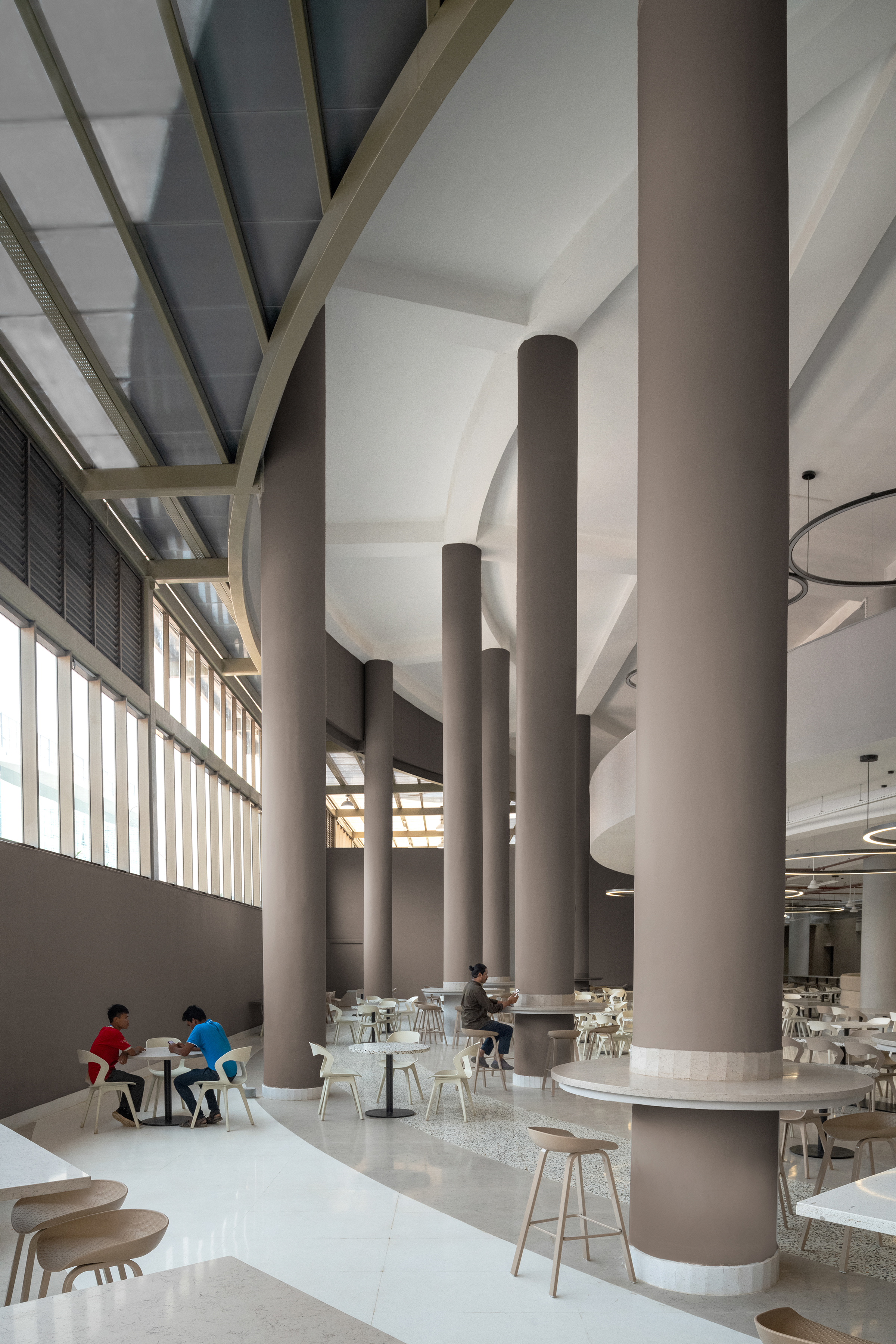 강철로 렌더링된 금속 프레임워크는 복합재 지붕을 지지하는 지붕 트러스에 고정되어 구조적 무결성과 안정성을 보장한다. 견고한 프레임워크와 둘러싸인 형태의 대비는 주황색의 동심원 고리로 강조된다. 시각적 병치는 구조물의 건축적 중요성을 강조하고 캠퍼스 환경 내에서 활기찬 허브로서의 정체성을 강화한다.