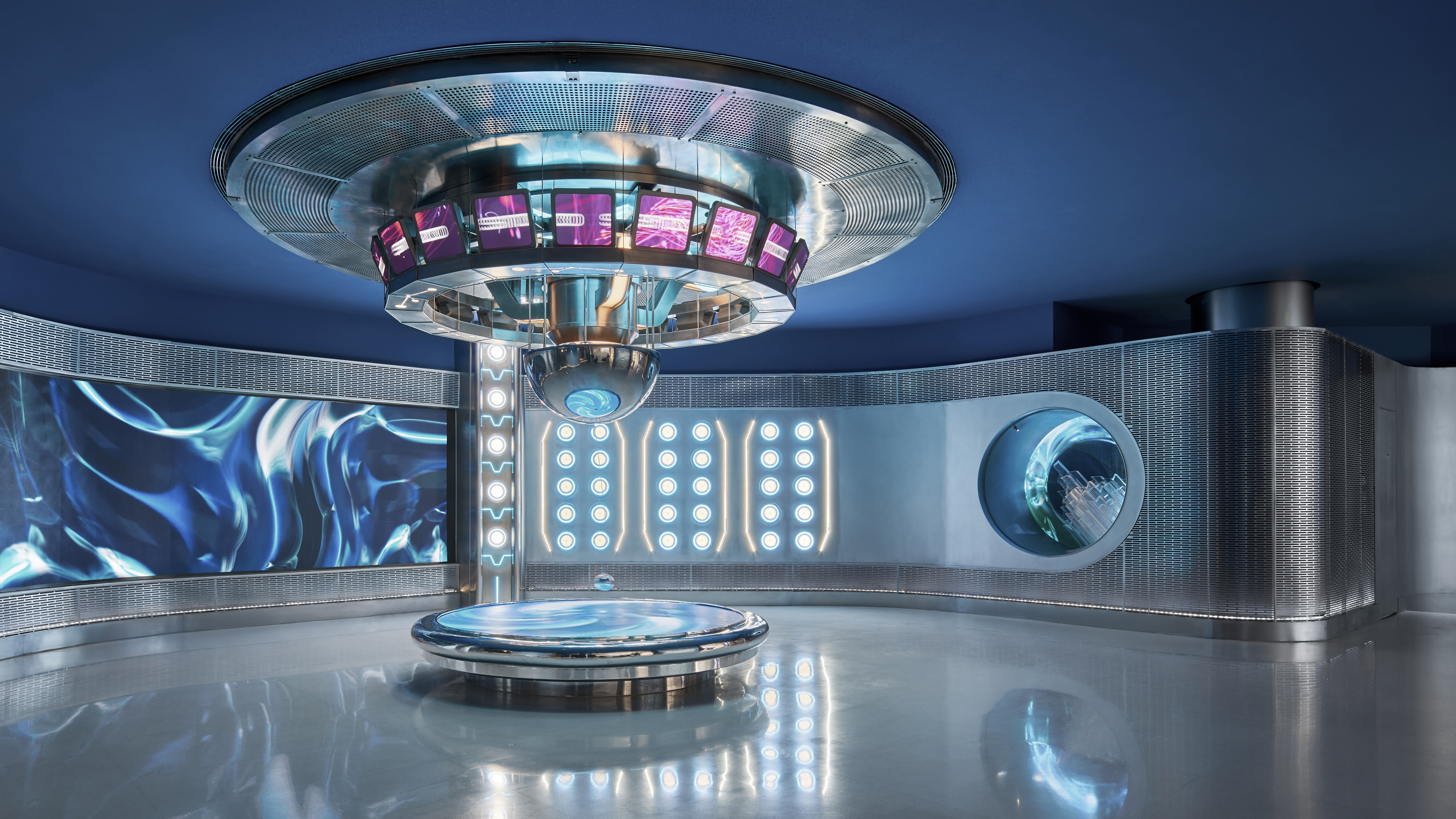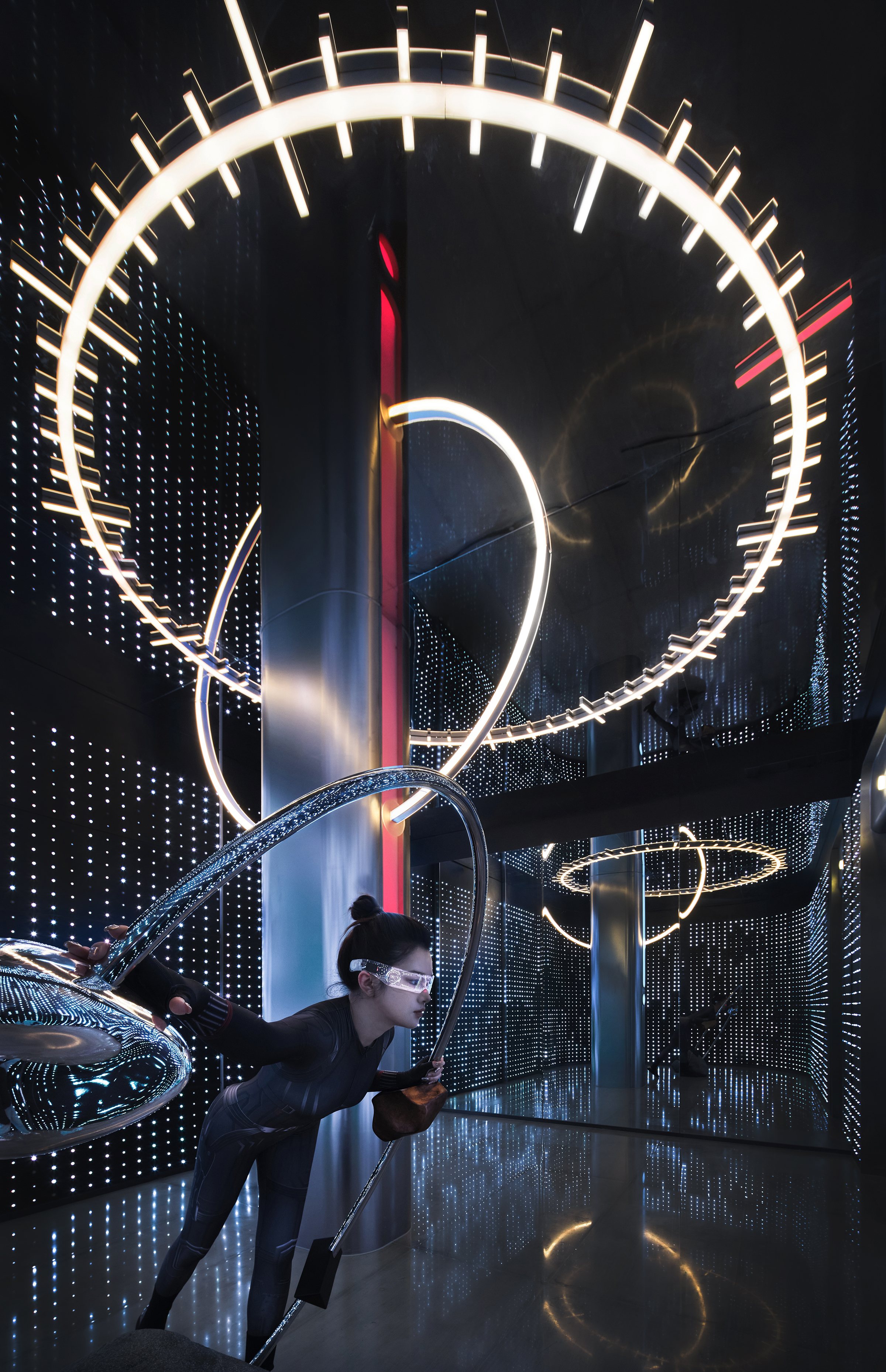 "All matter originates from a force which brings the particle of an atom to vibration and holds them together. Behind this force exists a conscious and intelligent mind. This mind is the matrix of all matter." The entire space is constructed with various types of circles, forming a field in physics. The curved stainless steel wall panels reflect light, injecting flowing energy into the space. When touched with fingers, the LED screens display different visual effects and change with different angles of observation, allowing deeper interactions between viewers and the space. This space emphasizes human presence despite the modern technological ambience.