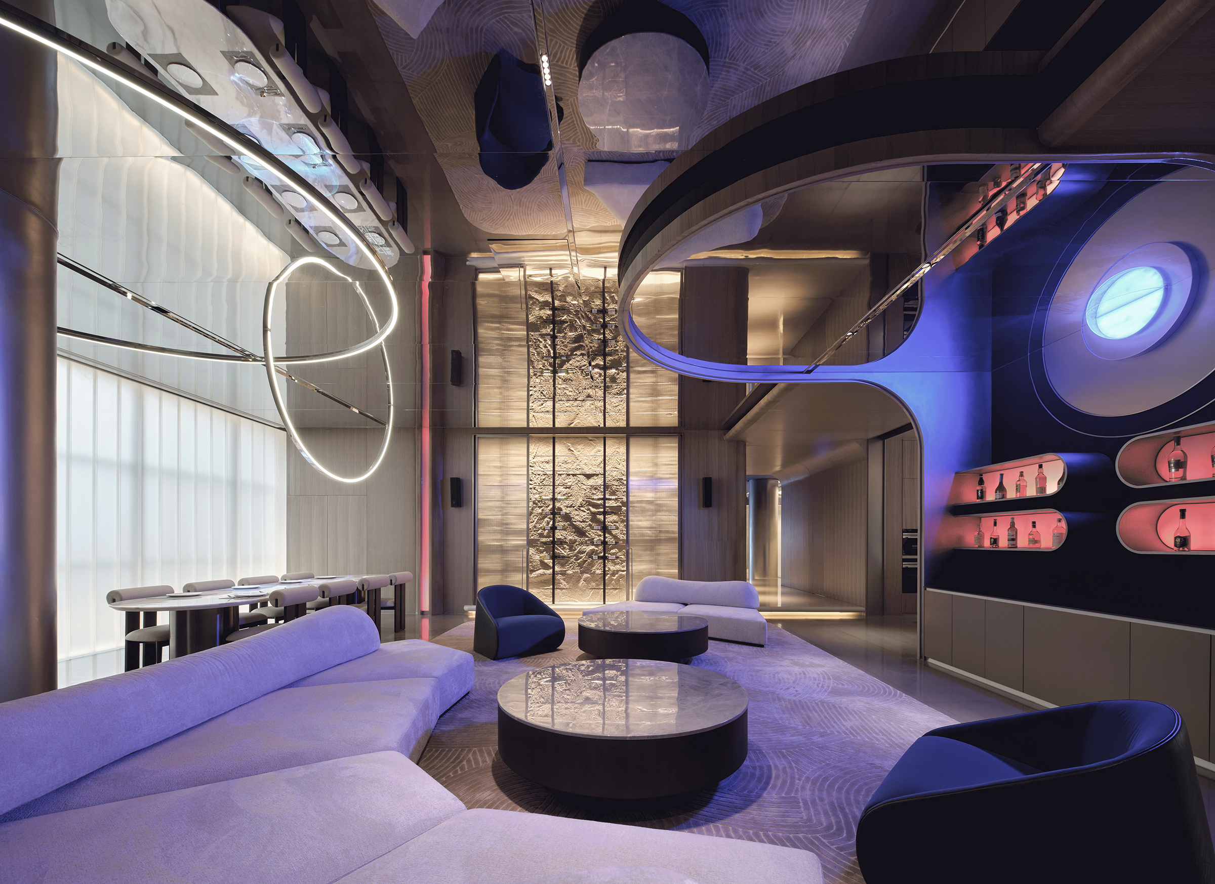 The side glass walls present the traditional cosmology of “round heaven and square earth”. The black stone floor creates a profound effect reminiscent of the earth through the reflection and projection of lights. Breaking traditional furniture forms, the designer arranges the tables in the multifunctional hall in the form of scattered planets. Mobile tables and chairs can move like planets, changing the layout of the space for meetings, entertainment and other functions, thus offering guests a unique experience.