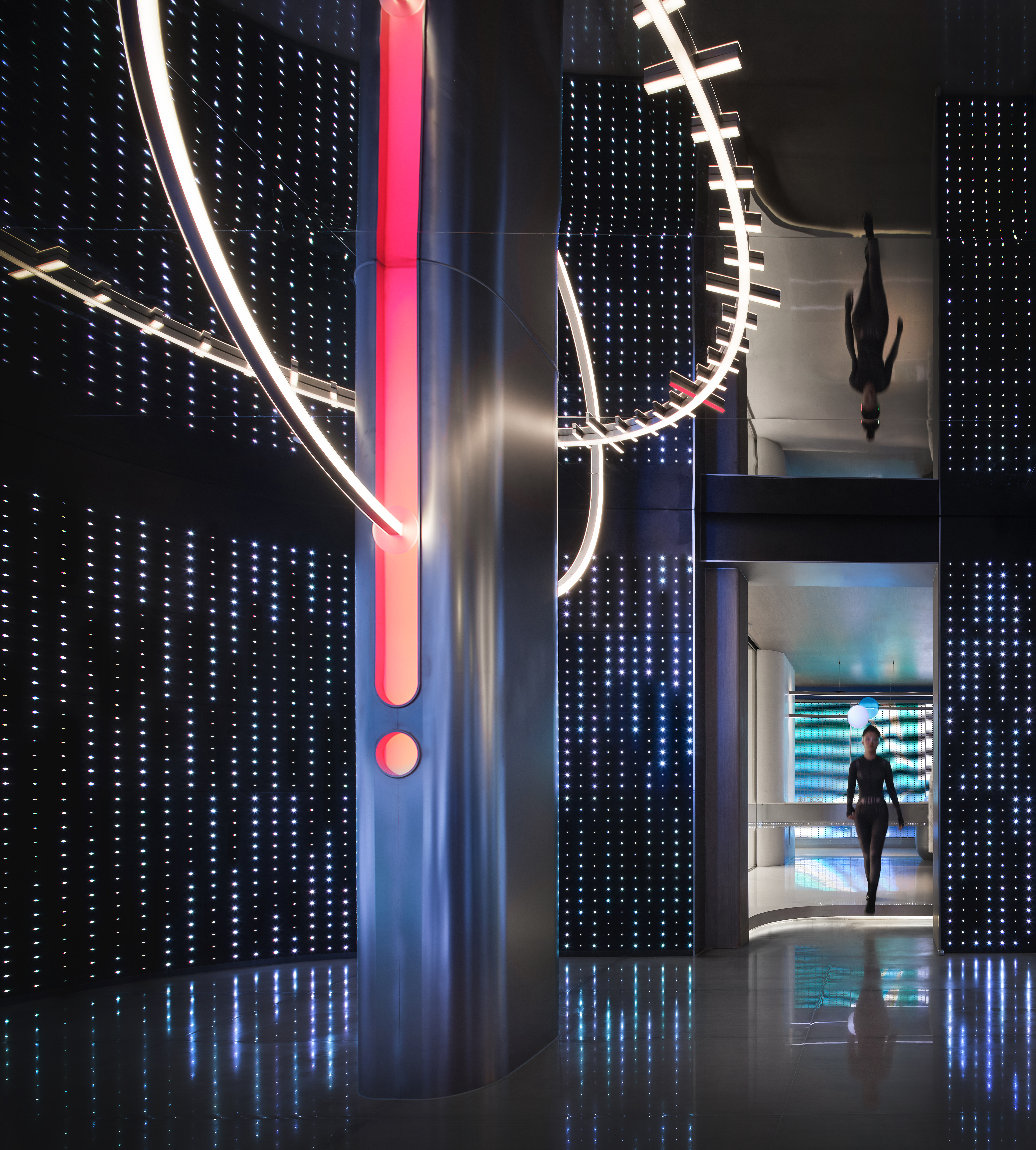 "All matter originates from a force which brings the particle of an atom to vibration and holds them together. Behind this force exists a conscious and intelligent mind. This mind is the matrix of all matter." The entire space is constructed with various types of circles, forming a field in physics. The curved stainless steel wall panels reflect light, injecting flowing energy into the space. When touched with fingers, the LED screens display different visual effects and change with different angles of observation, allowing deeper interactions between viewers and the space. This space emphasizes human presence despite the modern technological ambience.