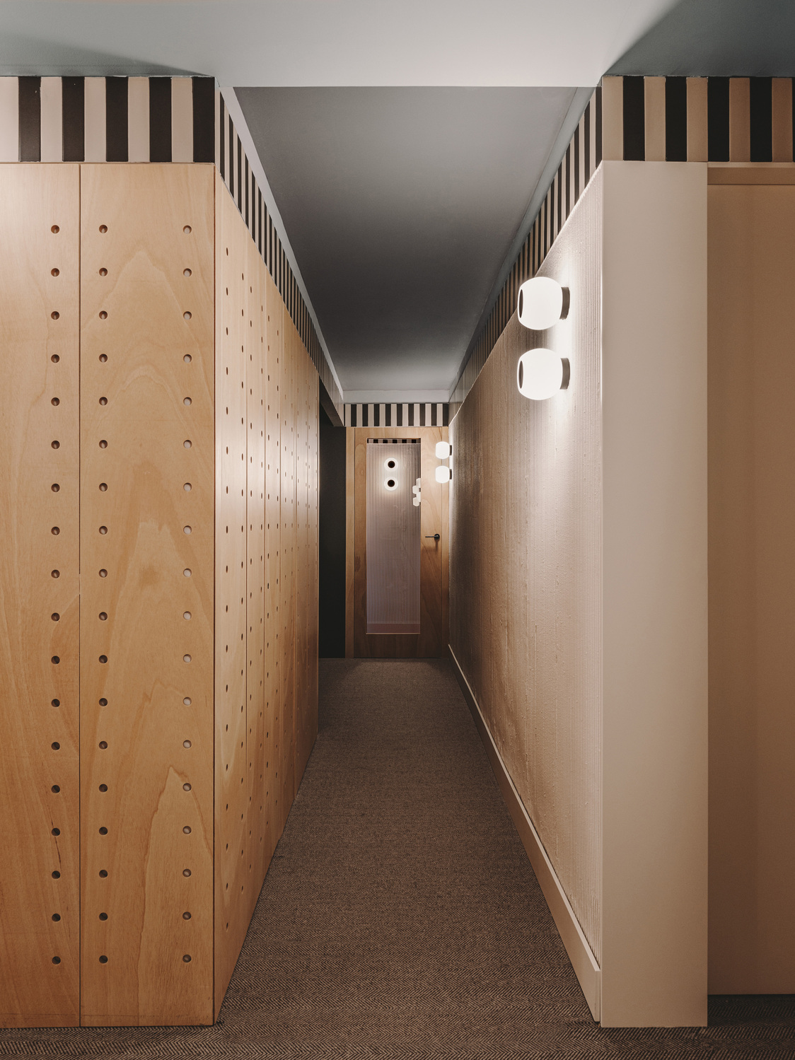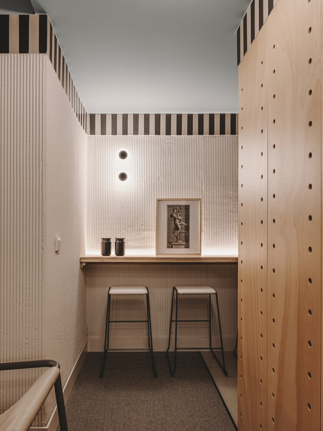Moreover, Viruta Lab has opted for deliberate imperfection, using blue tones paints to create depth and individual porcelain plaques in beige and black to regularize the project's height. Perforated marine wood and dark carpet on the floor add warmth and calmness to the space, while the lighting program proposes a play of indirect light to elevate the feeling of intimacy and comfort.