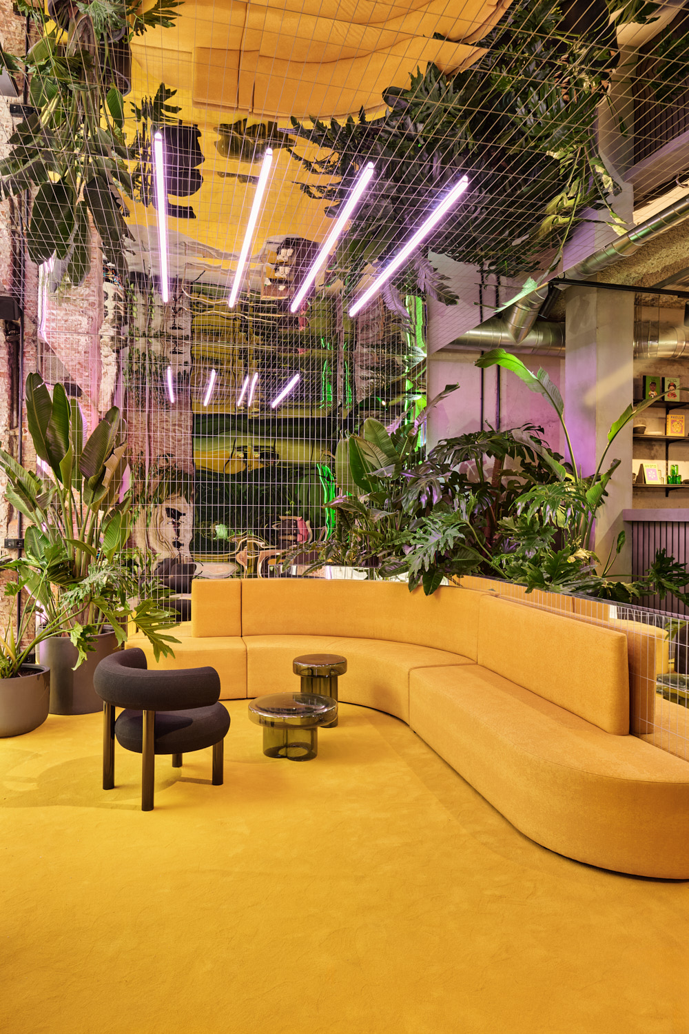 Upon entering the Lynk & Co Club Madrid, you are greeted by a cozy lounge area with a yellow sofa that invites relaxation and interaction. Mirrors and colored lights also create a dynamic and vibrant atmos-phere that invites you to discover every corner of the space.