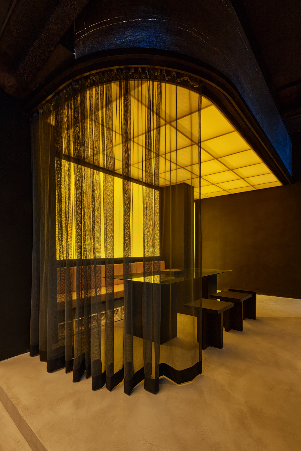 The other reference to Madrid can be seen in the fitting room designed with a fluorescent curtain that is lowered by pulling a rope and is inspired by the skirts of Las Meninas. Right behind it, the Lynk & Co 01 is presented in an environment that aims to represent the futuristic and technological concept of the vehicle.
