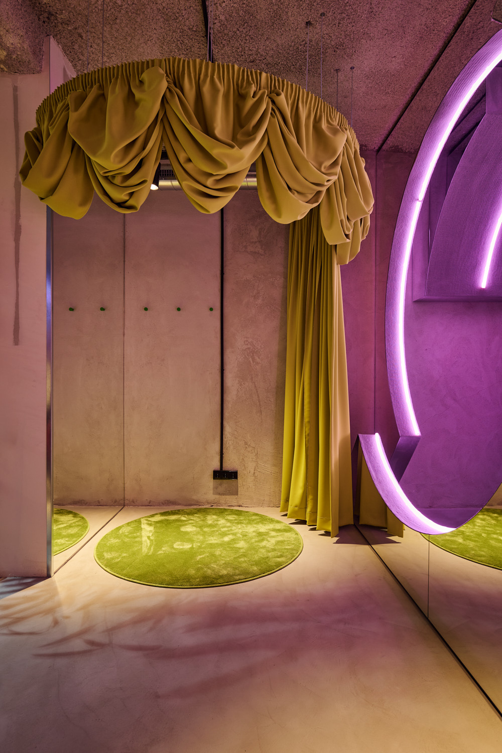 The other reference to Madrid can be seen in the fitting room designed with a fluorescent curtain that is lowered by pulling a rope and is inspired by the skirts of Las Meninas. Right behind it, the Lynk & Co 01 is presented in an environment that aims to represent the futuristic and technological concept of the vehicle.