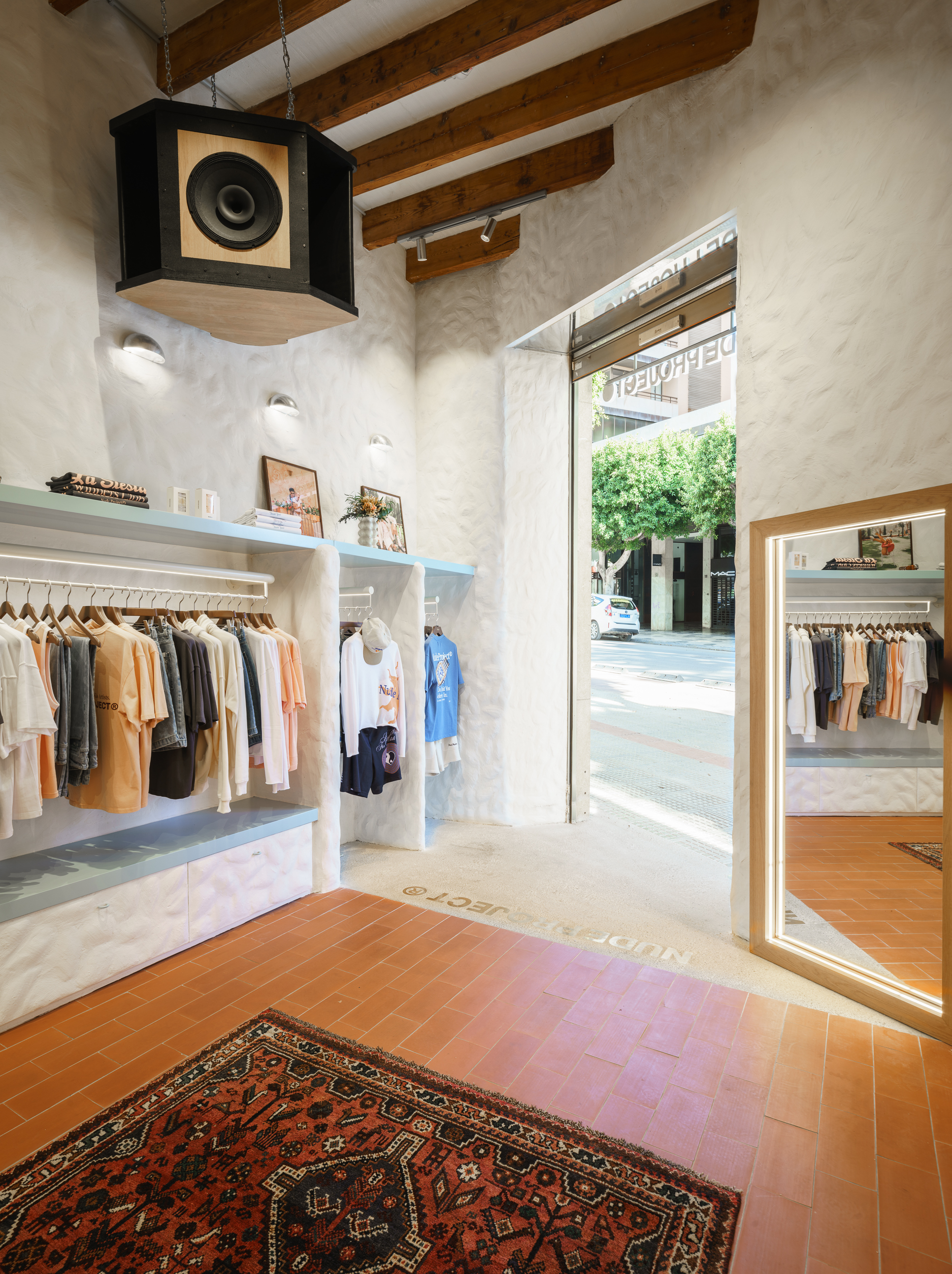 In this project, El Departamento has embraced uniqueness and creativity, establishing a dialogue between the authenticity and freedom of 1970s Ibiza and the freshness and youthfulness that define Nude Project. The new store, located at 5 Bartomeu de Roselló Avenue in Ibiza, draws inspiration from the vernacular architecture of a traditional payesa house. The studio has recreated organic-shaped walls made of lime and mortar, natural-looking terracotta floors and exposed wooden beam ceilings. These architectural elements are harmoniously combined with mid-century style acrylic tables and cozy Persian rugs, creating an eclectic atmosphere that breathes authenticity, warmth and modernity.