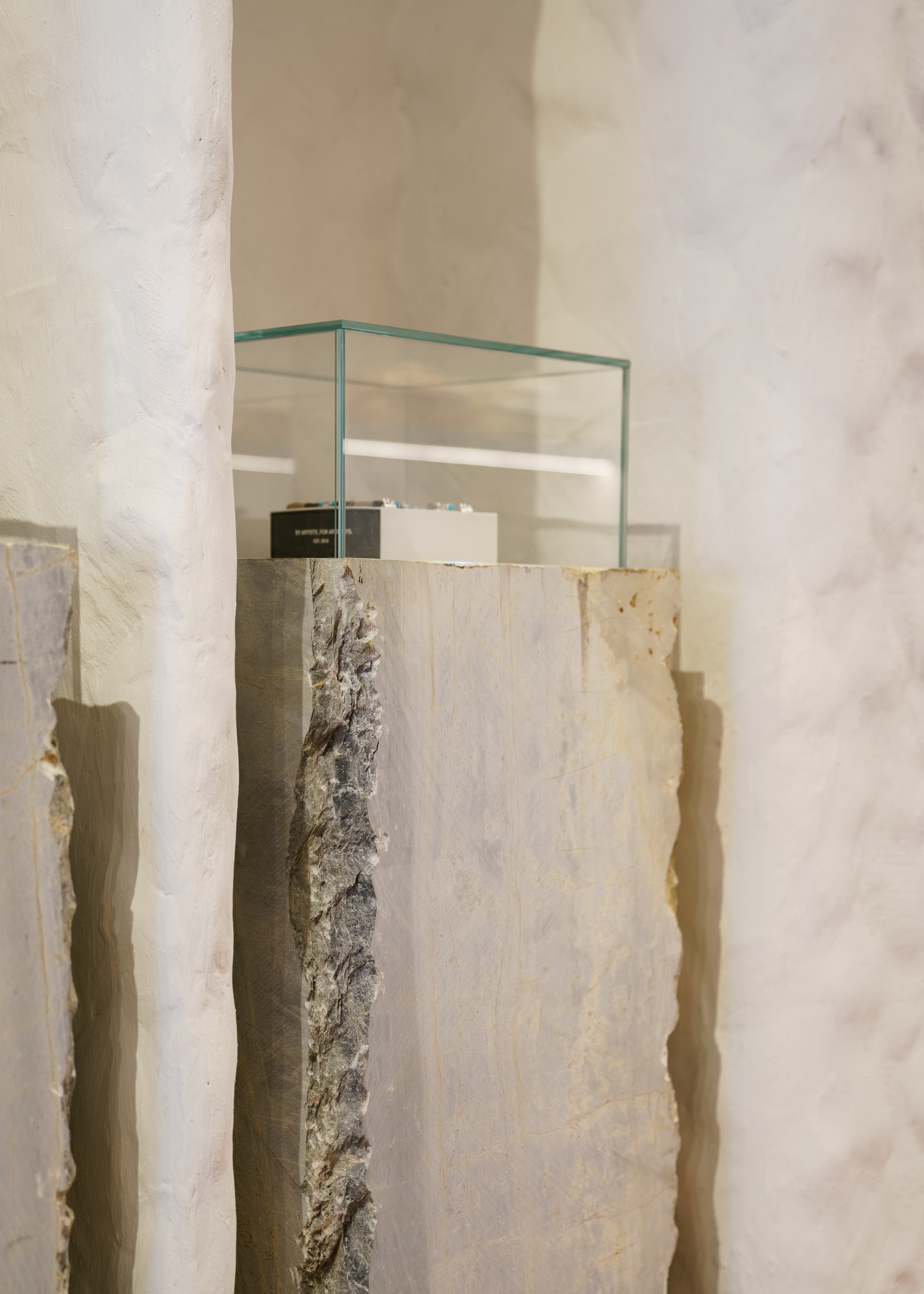 Premium outfits adorn the backdrop of the store, displayed on backlit showcases designed ad hoc in niche form to highlight the products. Additionally, within the store, El Departamento has created an oasis: an organic Krion structure with a friendly silhouette that delimits an exclusive reserved space. Inside, there is a sinuous velvet sofa that serves as a meeting point, as well as a fitting area with an almost celestial atmosphere enclosed by long blue curtains.