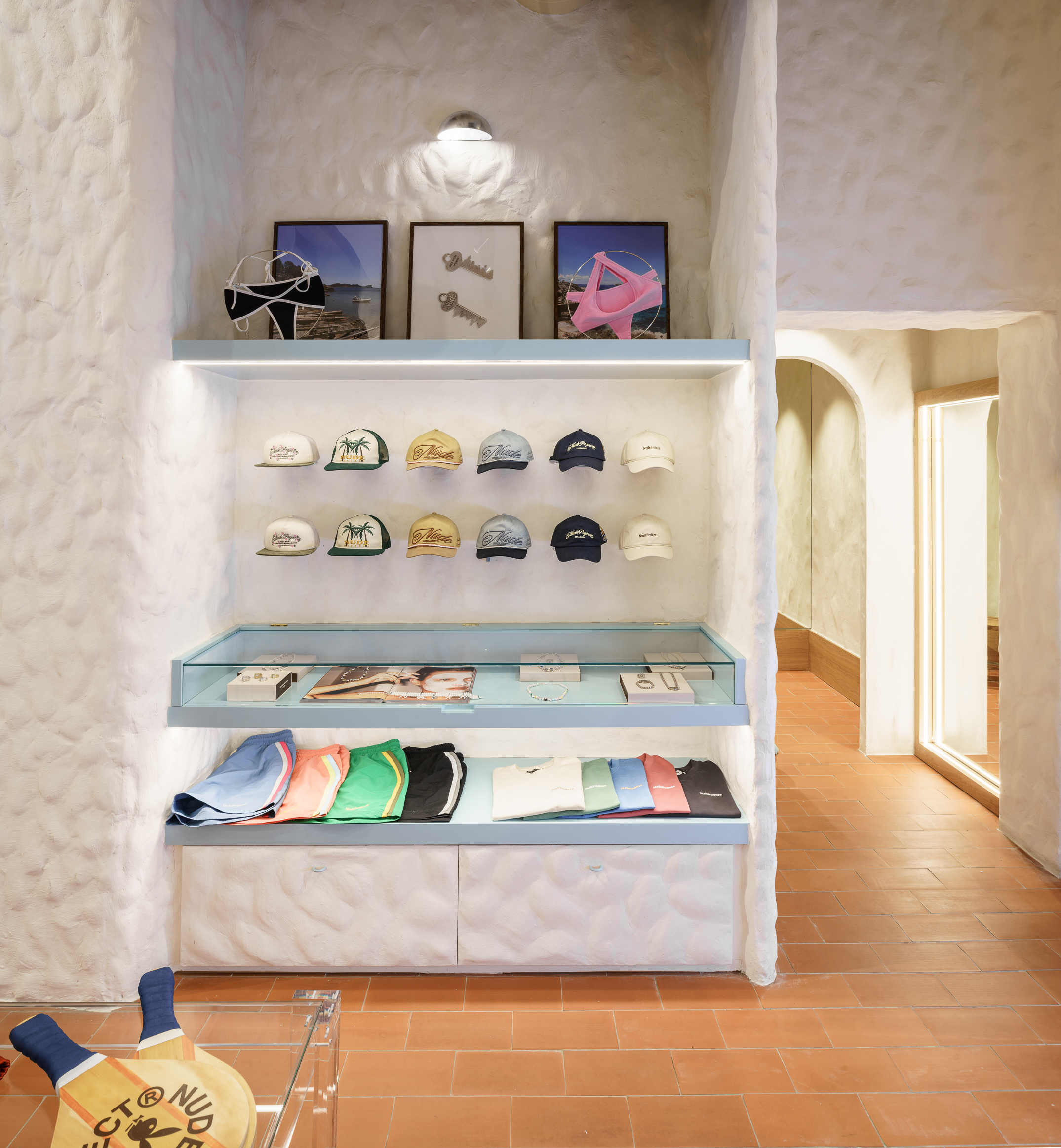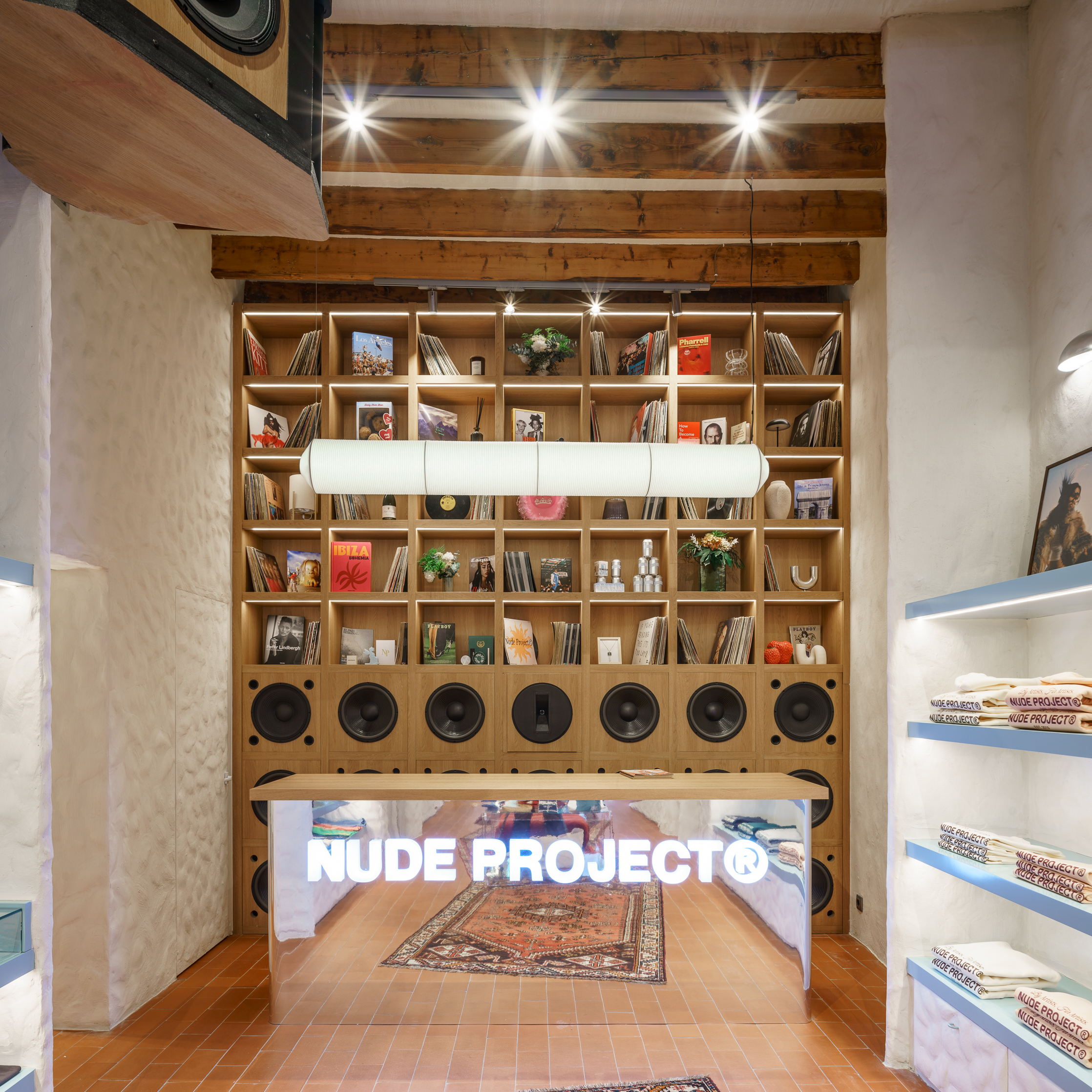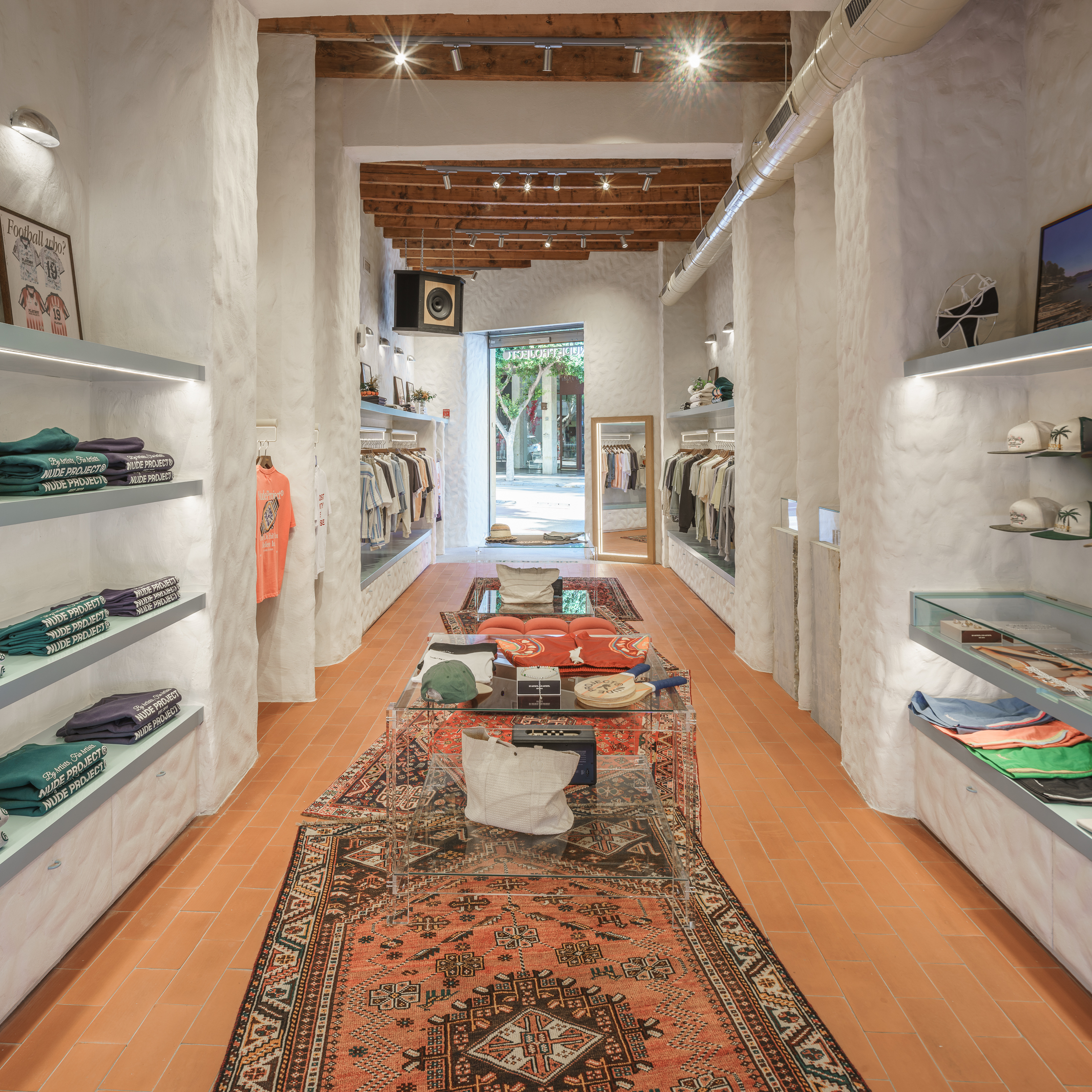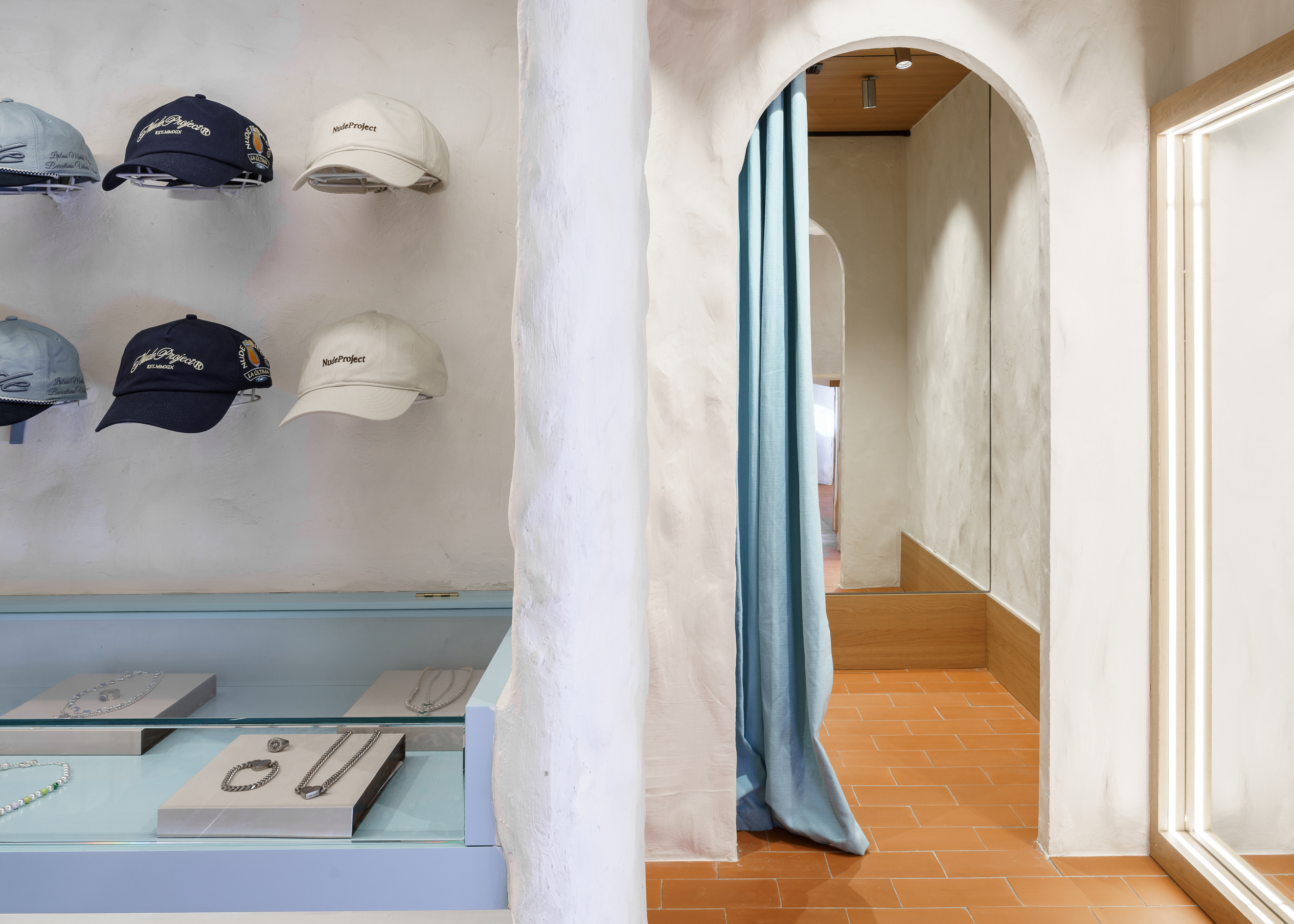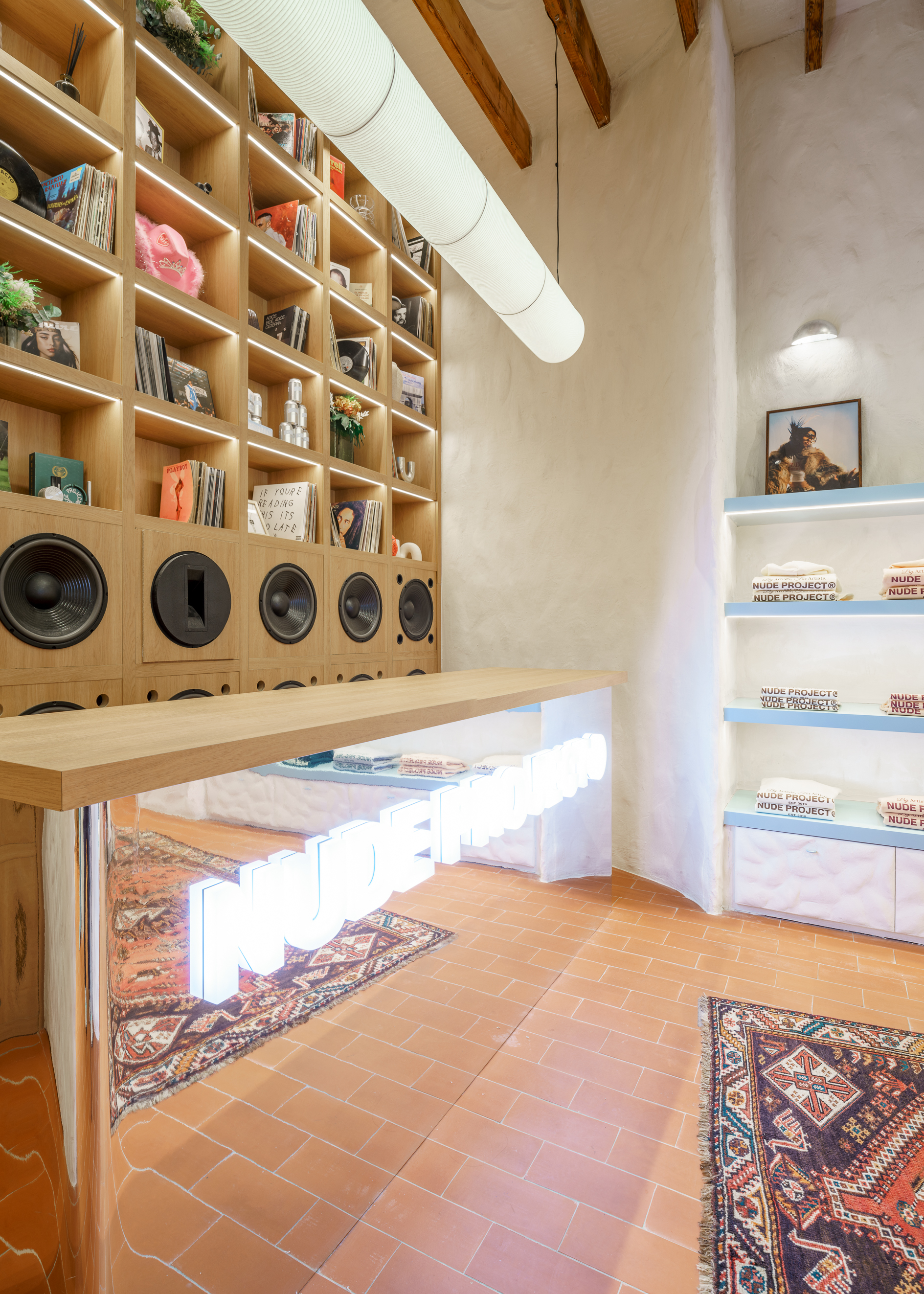 In this project, El Departamento has embraced uniqueness and creativity, establishing a dialogue between the authenticity and freedom of 1970s Ibiza and the freshness and youthfulness that define Nude Project. The new store, located at 5 Bartomeu de Roselló Avenue in Ibiza, draws inspiration from the vernacular architecture of a traditional payesa house. The studio has recreated organic-shaped walls made of lime and mortar, natural-looking terracotta floors and exposed wooden beam ceilings. These architectural elements are harmoniously combined with mid-century style acrylic tables and cozy Persian rugs, creating an eclectic atmosphere that breathes authenticity, warmth and modernity.