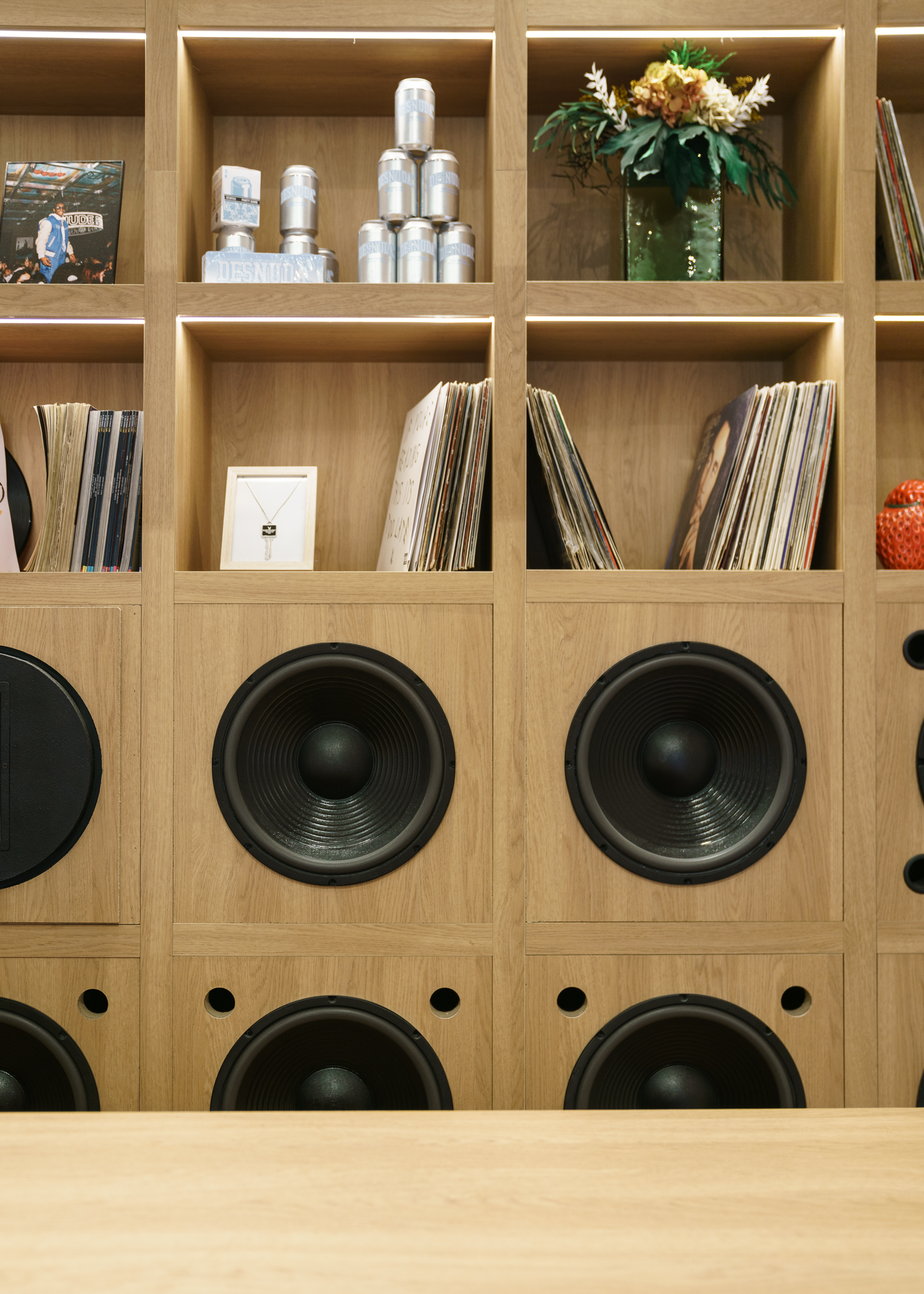 El Departamento’s creative team has completed the interior with a carefully curated selection of props, including a bookshelf with speakers, a collection of magazines, books, vinyl records and the iconic pink “cowboy” hat, a distinctive symbol of the brand.