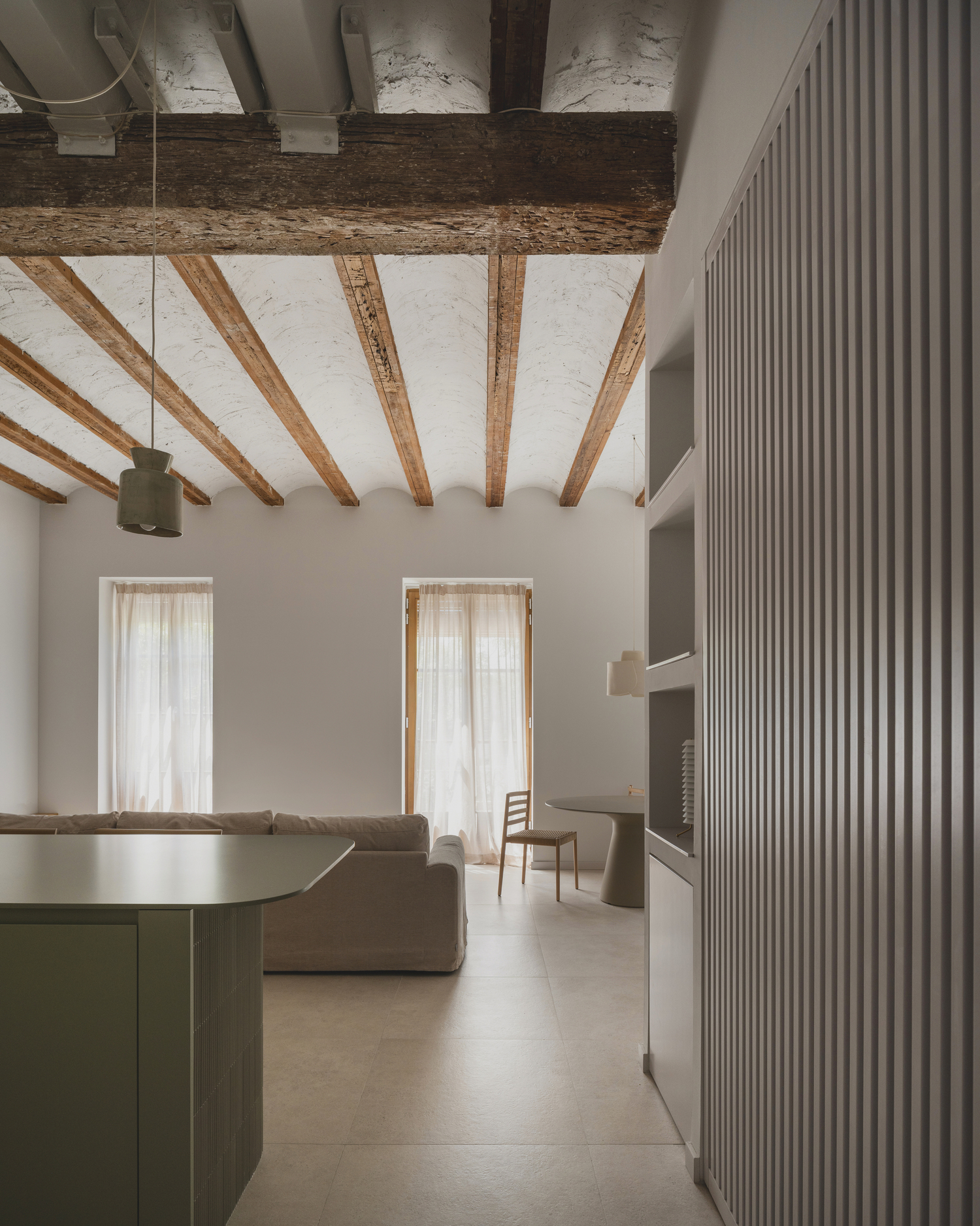 The continuous sand-colored floor ties together all corners of the house, evoking the long beaches of Bolonia in Cádiz. The day area is centered around a large, washed-green island, made with textured tiles and turquoise green Silestone, reminiscent of the movement of sea water. The kitchen, in neutral tones and oak wood, embraces the living room, unifying both spaces.