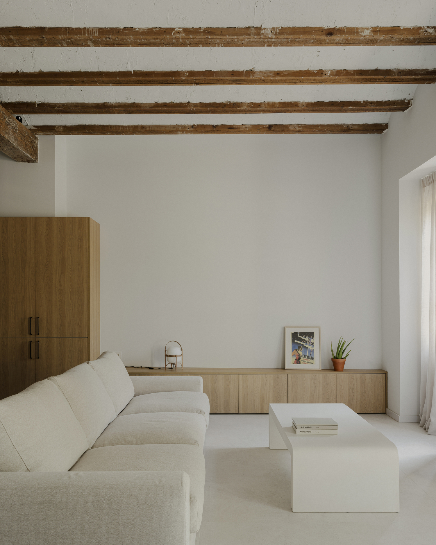 Technical architect and interior designer Paloma Bau, along with her team, approached this renovation and restoration project with a respectful perspective. They have crafted a new space that is a true homage to the Mediterranean, featuring textures and finishes that evoke the sea and beach. The house, originally dark and heavily partitioned, was stripped of unnecessary coverings, revealing a wooden beam structure and a load-bearing wall that divided the rear terraces.