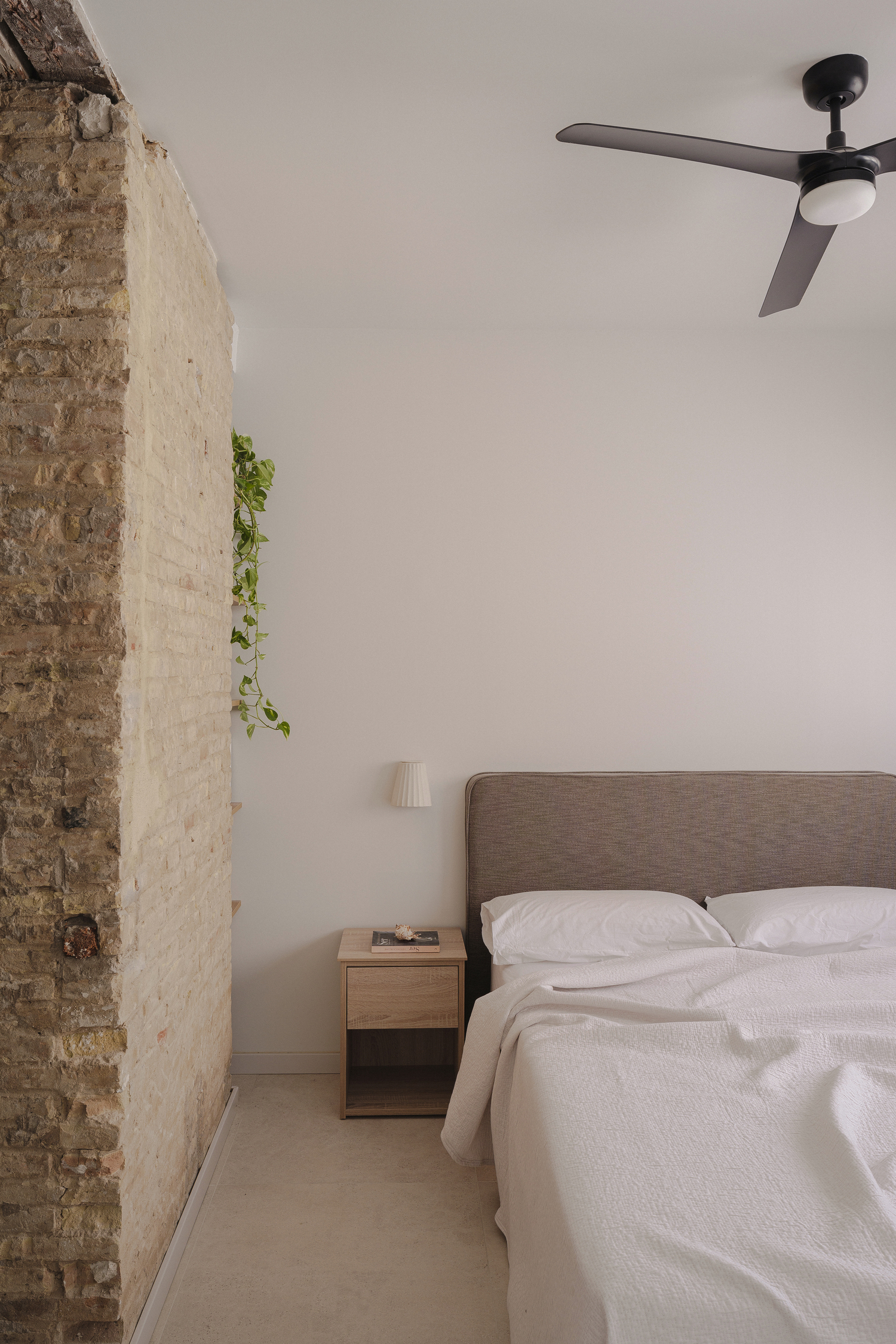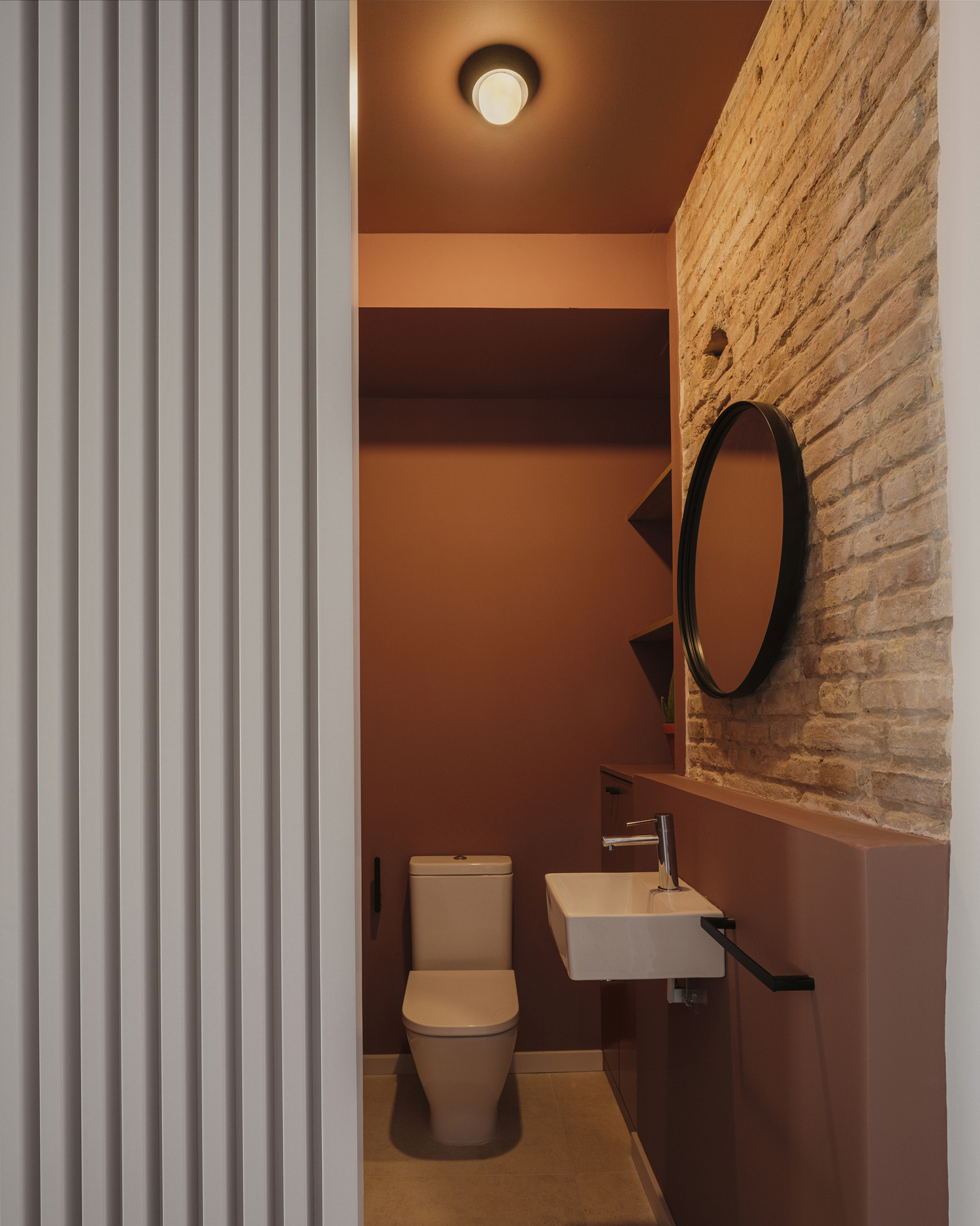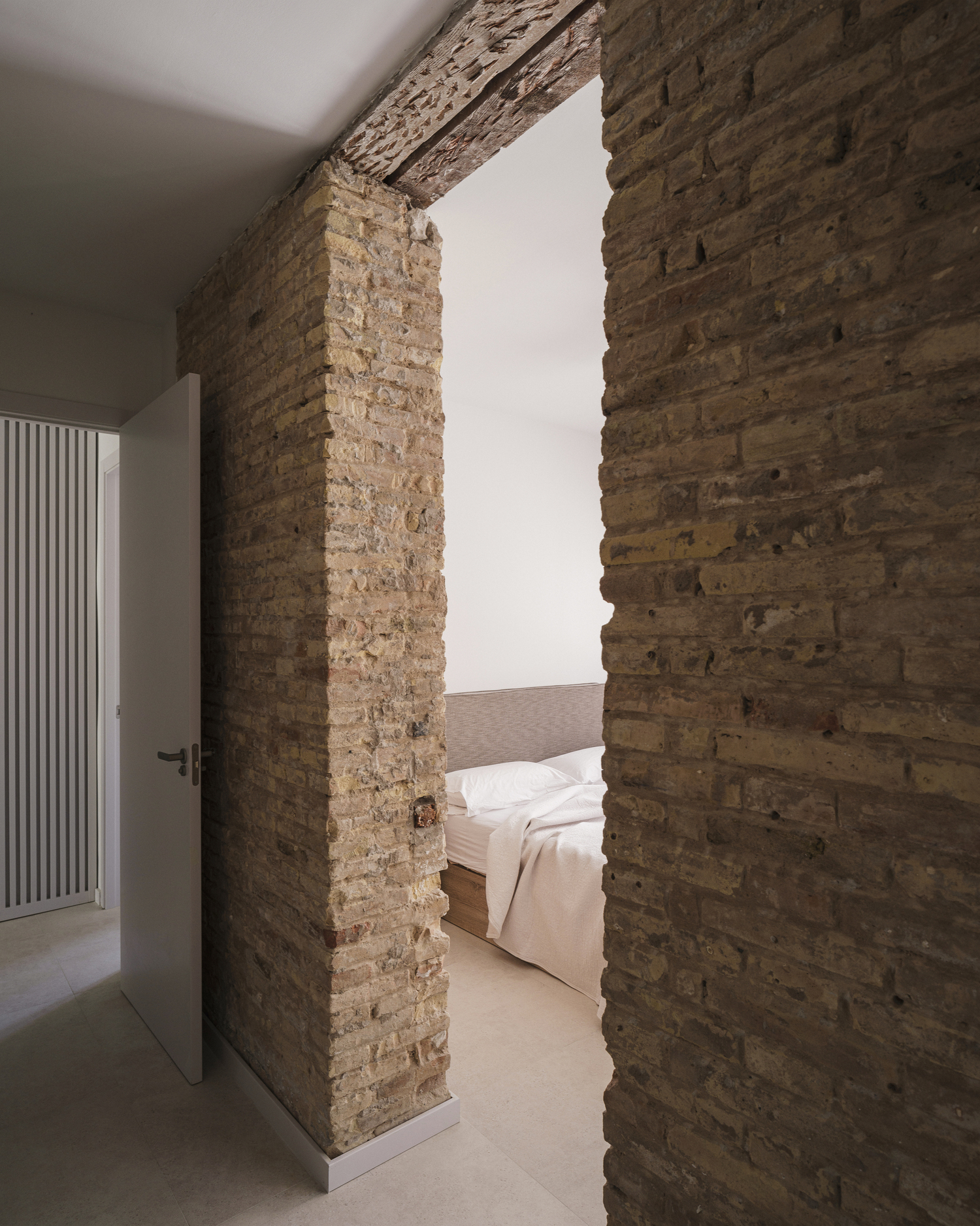 Additionally, the day area features a clever permeable paneling of lacquered wooden slats that hides a storage room for surfboards and a small bathroom inspired by Cala Rotja in Menorca. The private area of the house, consisting of an office and a bedroom with an en-suite bathroom and walk-in closet, retains the old reddish brick load bearing wall, whose original openings connect the walk-in closet with the bedroom and bathroom.