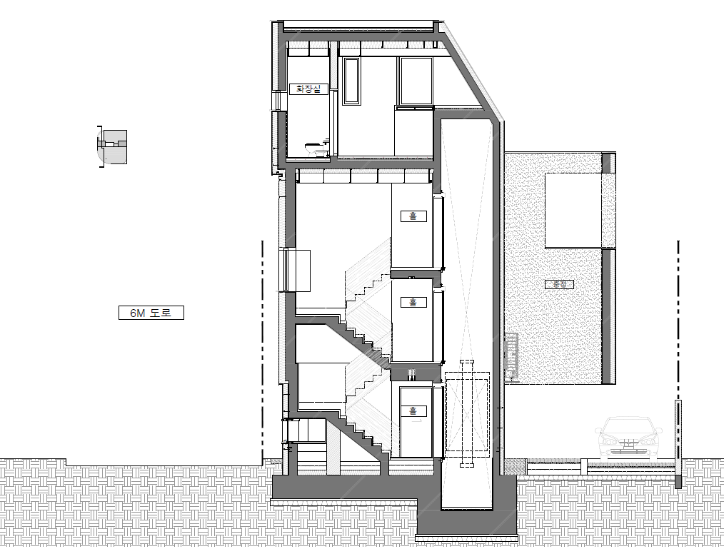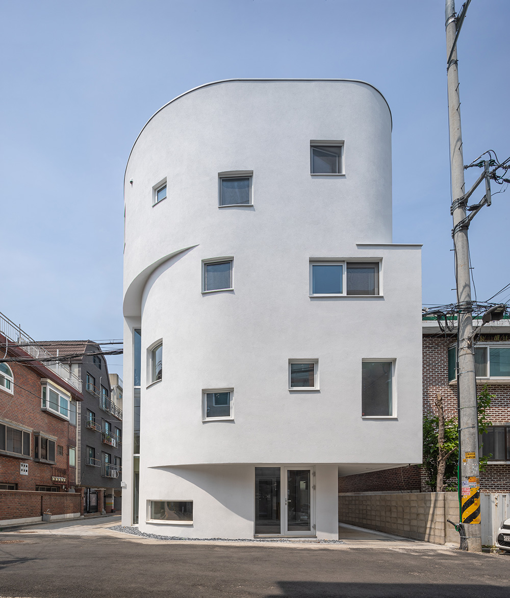 There is not a direct physical connection between the alleys and Itzae, but it maintains continuity by implementing visual connectivity with the existing neighborhood. The site is a corner lot with two sides facing the road. Utilizing the advantages of this corner, the shape of the house gradually changes subject to the direction of pedestrian's approach. The three curved masses at the corner subtly segment and then merge back into one. Depending on whether it is viewed from afar, passed by, or seen up close, it offers different setting for the neighborhood alley.