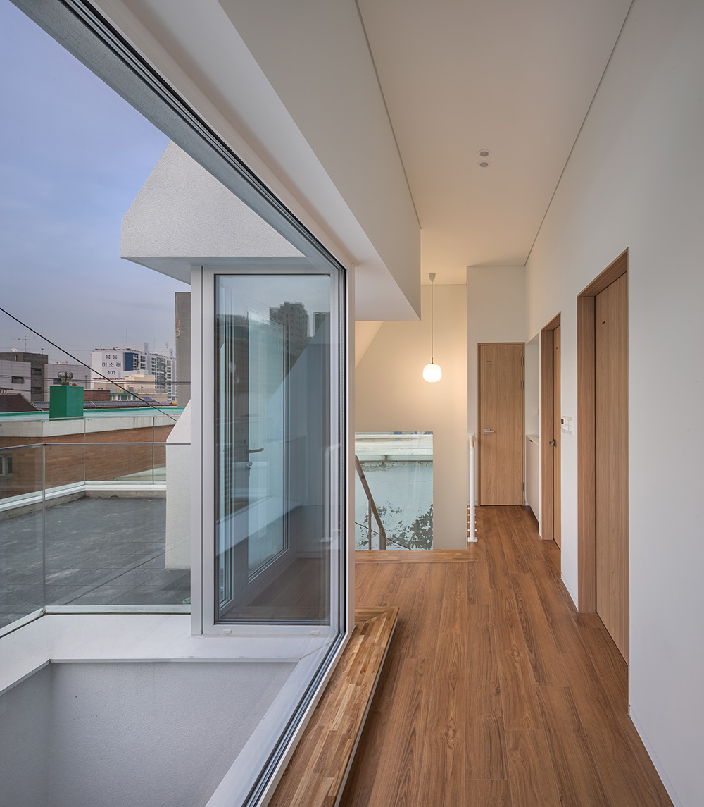 건축물 가운데는 전층으로 열린 중정이 핵심 공간이다. 일반주거지역의 차면창의 규제를 피해 내부에 중정과 통창을 설치하여 모든 층의 공간들이 중정 공간을 향해 열려있다. 벽을 향해 반사되는 간접광은 모든 공간에 빛을 공급하며, 세대 간의 시각적인 커뮤니티를 형성하는 잇재만의 공간이 된다.