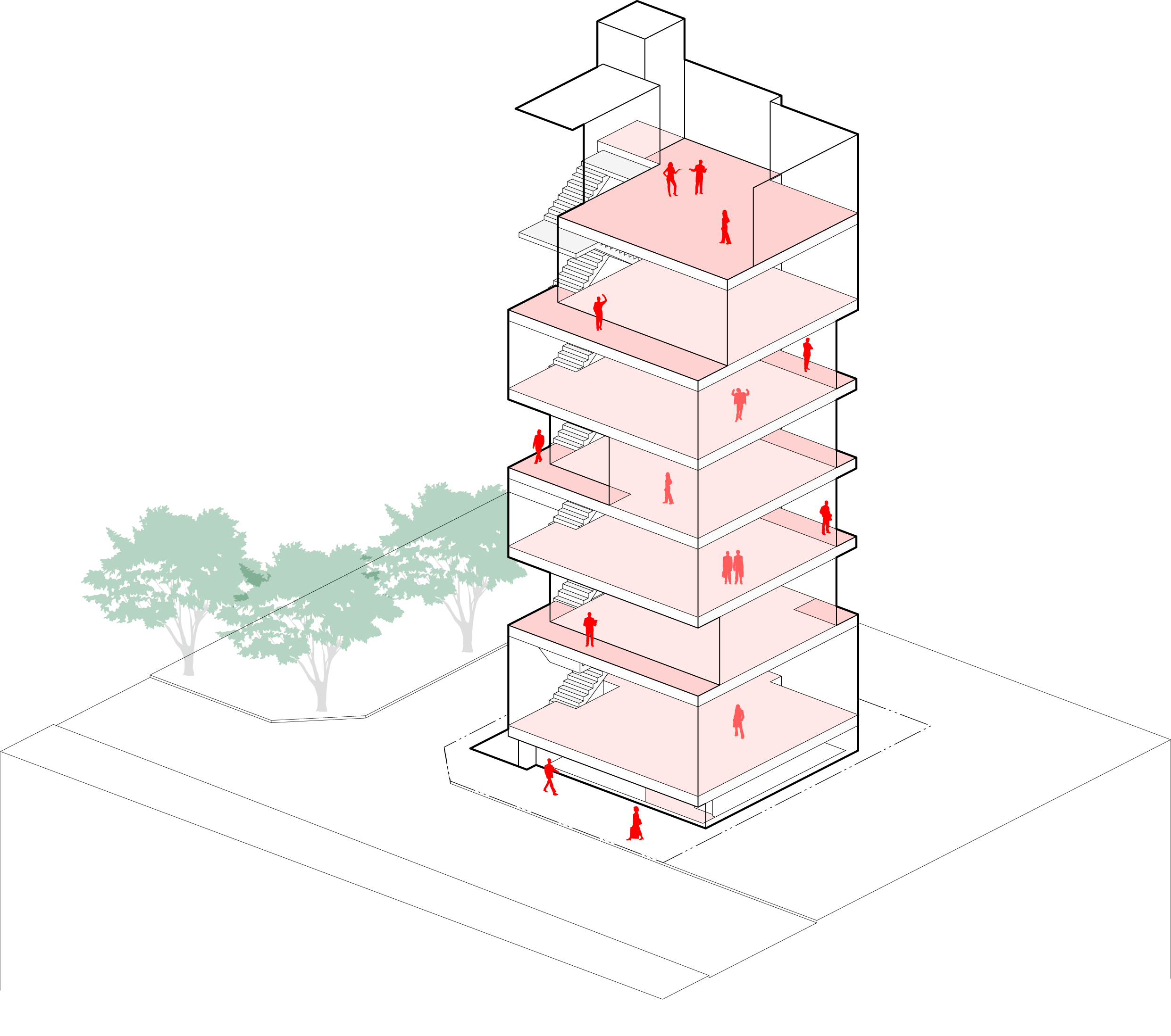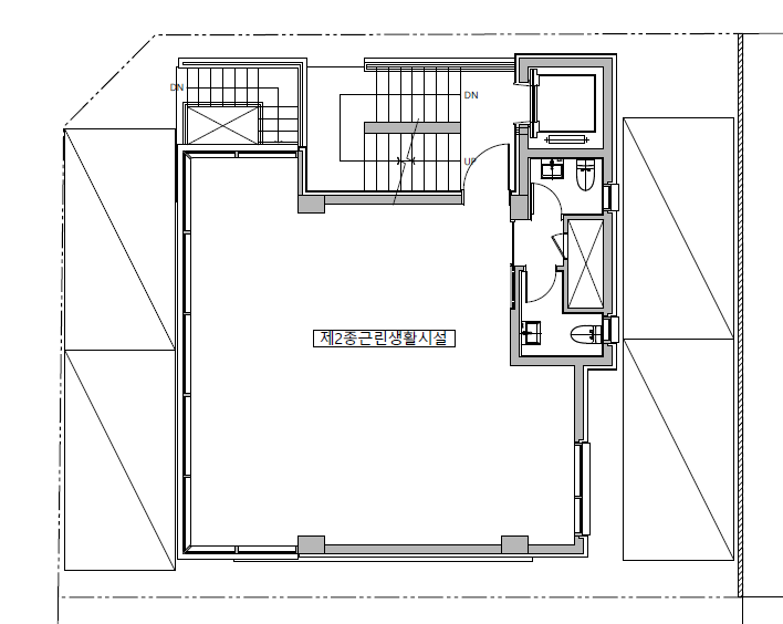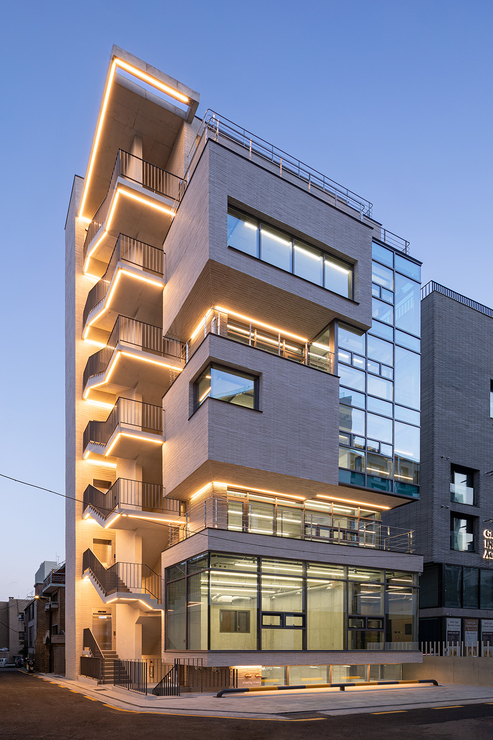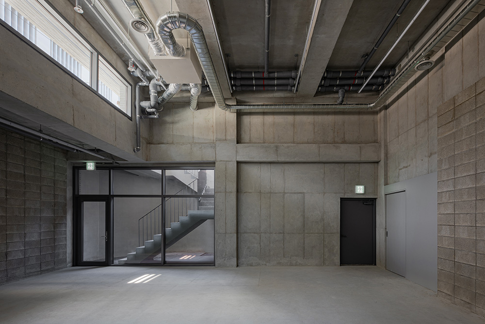 The basement floor was raised 1.2 meters above ground level, and a sunken area was planned in a corner triangular section to create a pleasant underground interior space with natural lighting and ventilation. The mass on the first floor was planned with a glass skin suitable for commercial use, allowing natural communication between the interior and exterior. The second to sixth floors are office spaces. Balconies were provided on each floor to allow for breaks during work, increasing work efficiency. The windows at the front and back provide convenient natural ventilation to create a comfortable working environment. The rooftop floor was designed to be versatile, with partition walls and beams allowing for variable roof installations for a variety of uses.