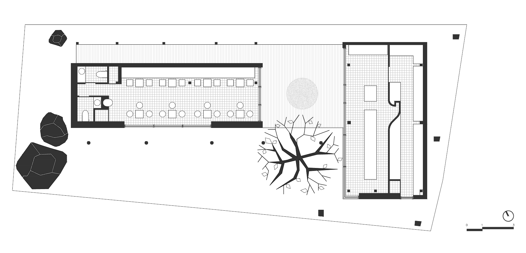 The internal walls were removed from the narrow space composed of small, single-room modules, and the old structure was reinforced to accommodate a new structure. The original building allowed entry to each room through the yard, but some walls were removed to dramatically showcase the old paulownia tree in the yard spreading its lush leaves and growing steadily, creating a new sequence that bypasses the entry path. The large stone in the entry yard occupies the space of the former entrance, naturally guiding people along the narrow entry path. The central courtyard, encountered after passing through the narrow and dark entry path, offers an open view with the roof slab removed, adding bright light and contrasting with the previously dark entry sequence, creating an unexpected and contrasting effect. The courtyard naturally separates the kitchen, counter, and cafe spaces, becoming the focal point where the flow of all spaces intersects.