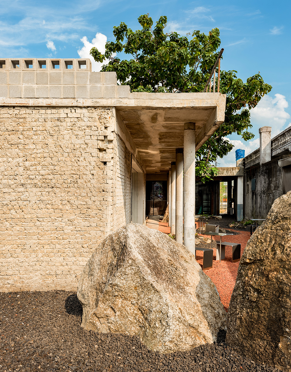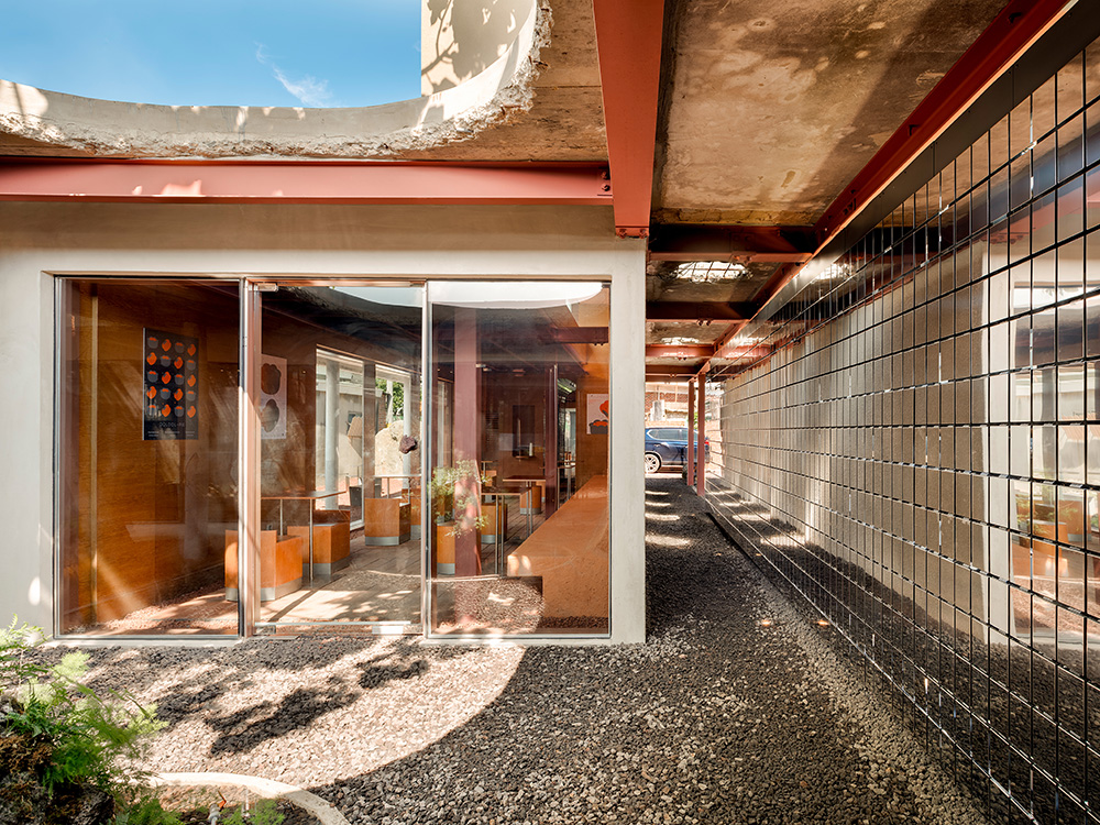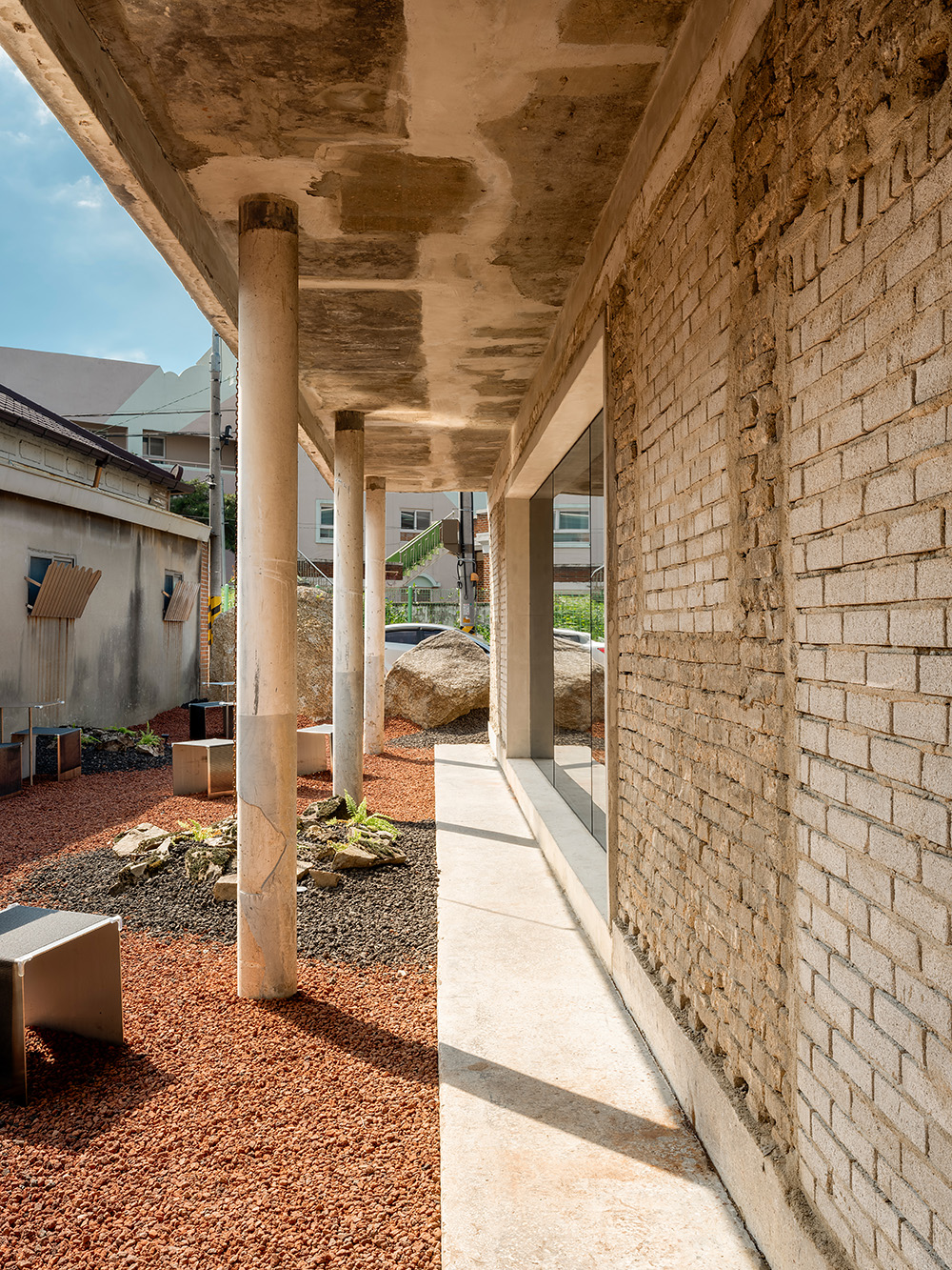 작은 단칸방의 모듈로 구성된 협소한 공간의 내벽을 철거하고, 오래된 구조는 보강하여 새로운 구조를 신설했다. 기존 건물은 마당을 통해 각 방으로 들어가는 형태였으나, 터줏대감과 같은 오동나무를 극적으로 보여주고자 일부 벽을 철거하여 진입로를 우회하는 새로운 시퀀스를 만들었다. 진입 마당 쪽으로 나앉은 거석은 기존 출입구 공간을 차지해 사람들의 발걸음을 자연스레 좁은 진입로로 방향을 틀게 한다. 좁고 어두운 진입로를 지나 마주하게 되는 중정은 지붕 슬래브를 비워내 탁 트인 시야를 제공하는데, 오동나무와 함께 밝은 빛이 더해져 기존의 어두운 진입 시퀀스와 대비되어 예상치 못한 반전의 효과를 발휘한다. 중정은 주방, 카운터와 카페 공간을 자연스럽게 분리하며, 모든 공간의 동선이 교차되는 구심점이 되었다.