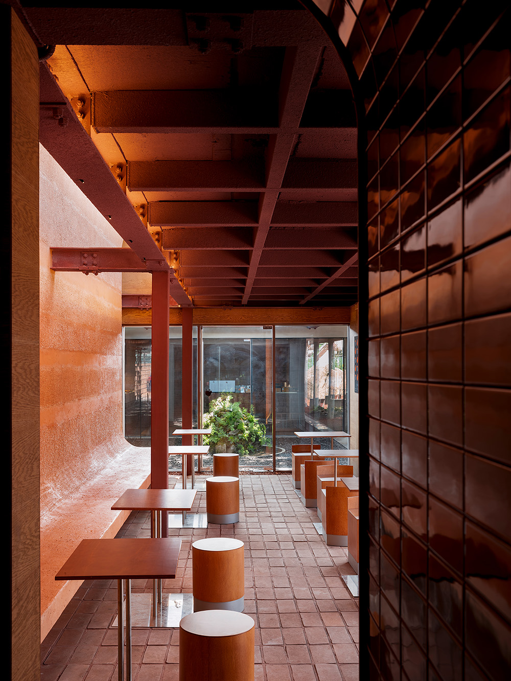 Cafe Doldol, a remodeling project, is part of an urban regeneration initiative aimed at revitalizing the village and improving the depressed alleyways. The architect refreshed a dormant space with potential, transforming it into a vibrant area that energizes the alley and village. The building, once a flat-roofed, featureless, monochrome reinforced concrete structure, now contrasts with the rusty, leaning buildings around it. The architect sought ways to preserve the old appearance and the traces of time while offering a unique spatial experience. The aim was to minimize the sense of discord with the village landscape by retaining the texture of the existing building. The warm red tones of the interior contrast with the cold, monochrome exterior, providing a variety of surprising and diverse experiences for visitors.