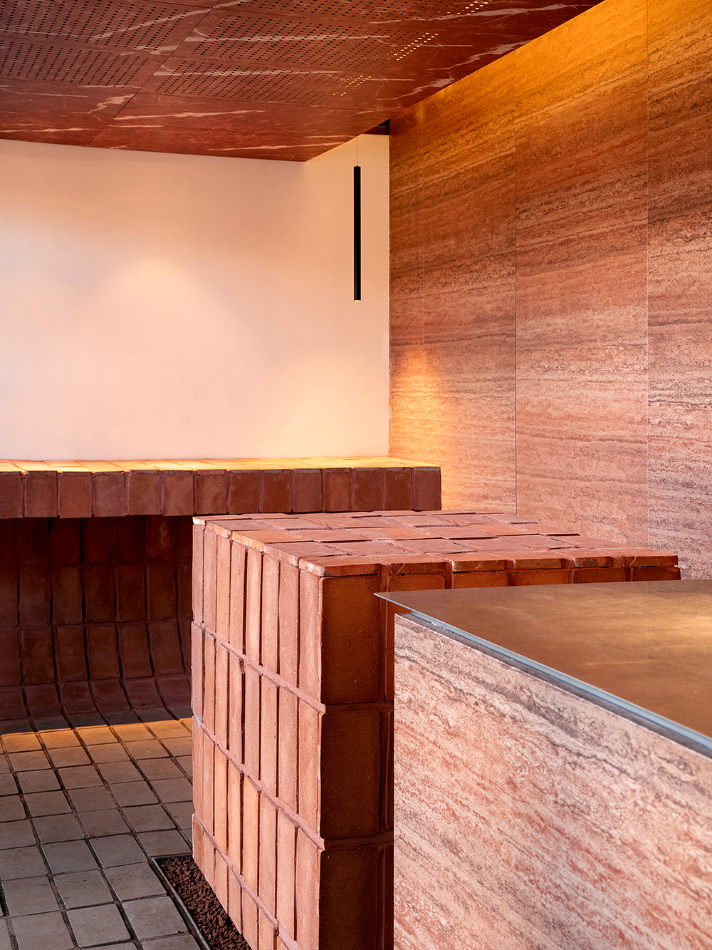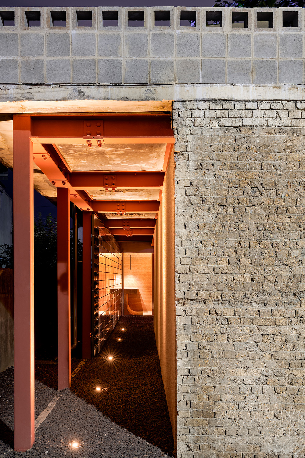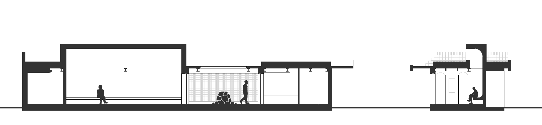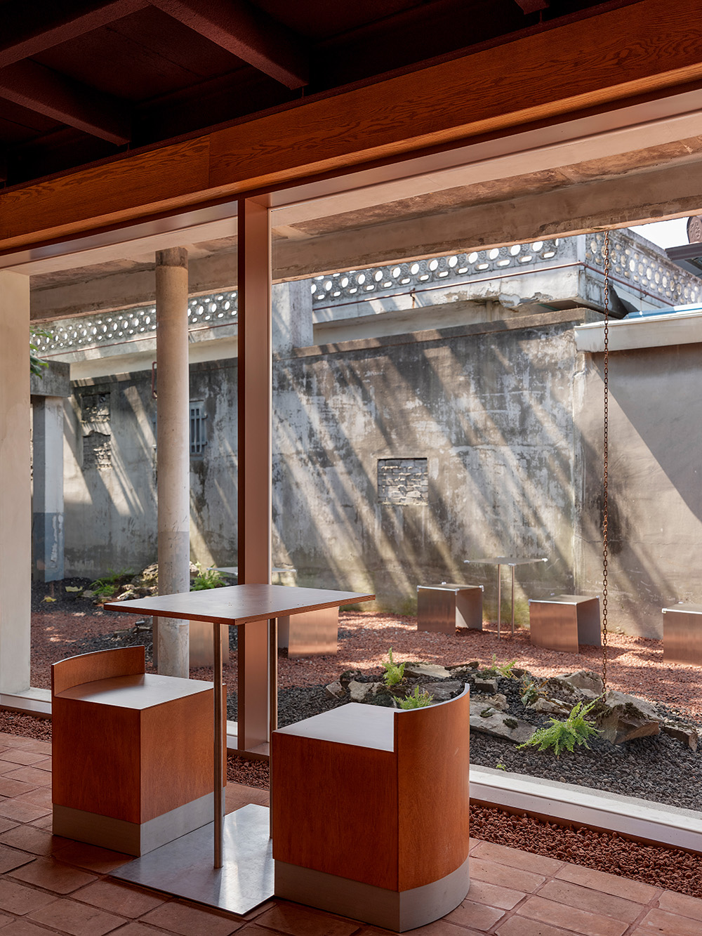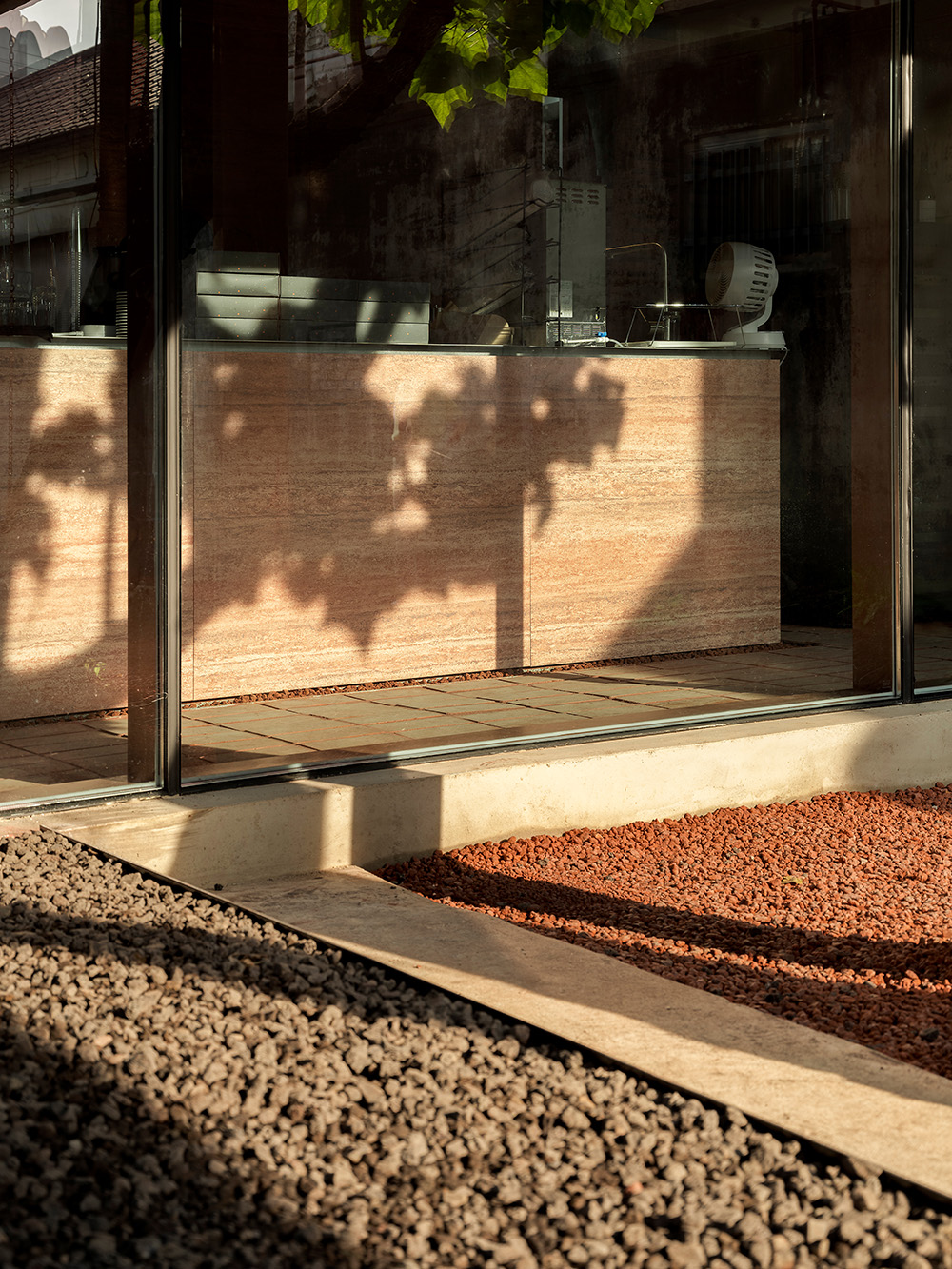 작은 단칸방의 모듈로 구성된 협소한 공간의 내벽을 철거하고, 오래된 구조는 보강하여 새로운 구조를 신설했다. 기존 건물은 마당을 통해 각 방으로 들어가는 형태였으나, 터줏대감과 같은 오동나무를 극적으로 보여주고자 일부 벽을 철거하여 진입로를 우회하는 새로운 시퀀스를 만들었다. 진입 마당 쪽으로 나앉은 거석은 기존 출입구 공간을 차지해 사람들의 발걸음을 자연스레 좁은 진입로로 방향을 틀게 한다. 좁고 어두운 진입로를 지나 마주하게 되는 중정은 지붕 슬래브를 비워내 탁 트인 시야를 제공하는데, 오동나무와 함께 밝은 빛이 더해져 기존의 어두운 진입 시퀀스와 대비되어 예상치 못한 반전의 효과를 발휘한다. 중정은 주방, 카운터와 카페 공간을 자연스럽게 분리하며, 모든 공간의 동선이 교차되는 구심점이 되었다.