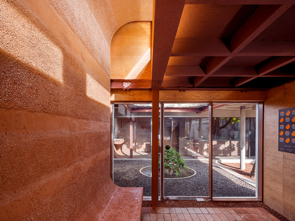 카페 돌돌은 침체된 골목을 개선하고 마을 활성화를 위한 도시재생 프로젝트의 일환으로 리모델링을 진행한 프로젝트다. 건축가는 잠재력을 갖춘 유휴 공간을 새롭게 단장하여 골목과 마을에 활기를 더한 공간으로 만들었다. 평지붕이면서 특색 없는 무채색 철근 콘크리트 건물이었는데, 녹슬고 기울어진 건물과는 대조적으로 마당의 오동나무는 풍성한 잎을 펼치며 점차 몸집을 키우고 있었다. 건축가는 마을의 옛 모습과 세월의 흔적을 최대한 유지한 채 색다른 공간을 경험할 방안을 고민했다. 기존 건물이 가지던 질감을 그대로 수용해 마을 풍경에 이질감을 줄이려 했고, 차가운 무채색의 외관과 대비되는 내부의 붉은 톤은 색 온도감의 대비를 통해 공간을 경험하는 사람에게 반전 있는 다양한 모습을 선보인다.