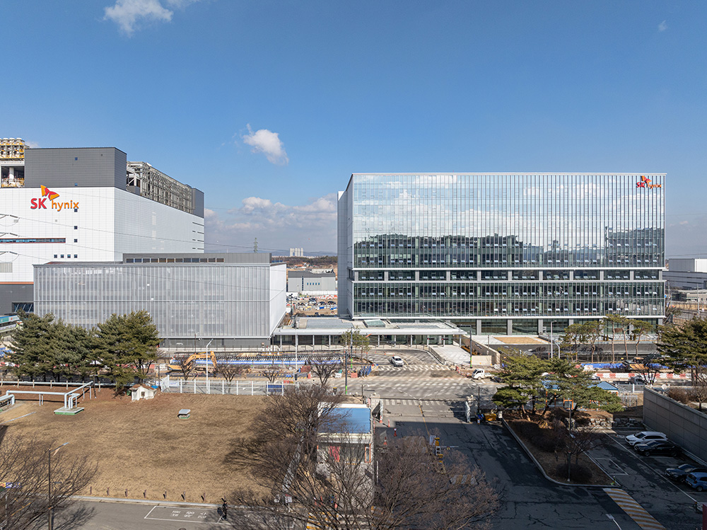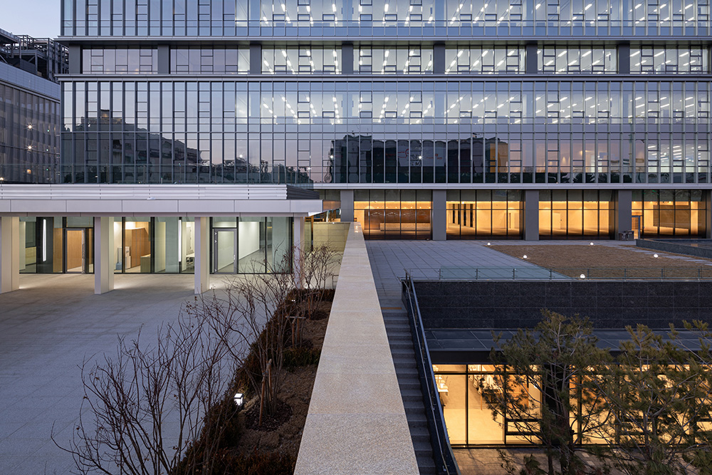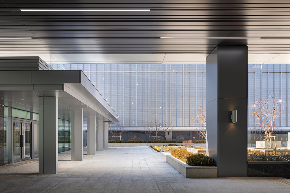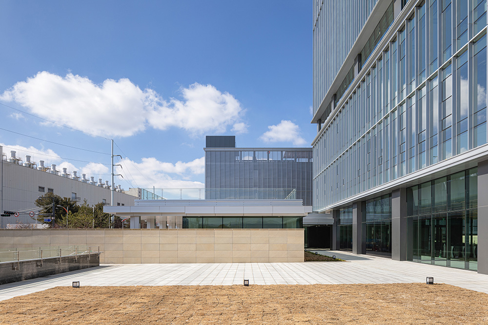 The Cheongju SUPEX Center is a newly constructed office space for SK Hynix M15 complex employees. The architect designed the space to enhance functionality and provide a comfortable and pleasant experience for workers. The SUPEX Center is situated at the level difference between the southern and northern sites, with a podium housing a cafeteria, fitness center, and mechanical rooms, topped by organically connected office buildings, parking buildings, and a guard house. The office and parking buildings, which have different functions, share a unified design language with similar colors, textures, and patterns. The guard house, with its columns and roof, acts as the main gateway of the SUPEX Center, strongly connecting the two distinct spaces. This unity ties the complex together, making the entire campus appear as a single architectural entity while respecting the individuality of each building. There is also a rest area for employees. The expanse between the office and parking buildings is one that all members pass through at least once. The architect envisioned this area as a place where employees could find rhythm and recovery time amidst their busy work schedules, as well as a space that naturally connects the interior and exterior through landscaping. Additionally, the Cheongju SUPEX Center is an environmentally friendly building that has achieved a Silver certification in LEED (Leadership in Energy and Environmental Design). Emphasizing sustainable resource management and energy efficiency is directly linked to creating a comfortable working environment. Using eco-friendly materials and providing an excellent indoor environment, the Cheongju SUPEX Center can significantly boost employee productivity.