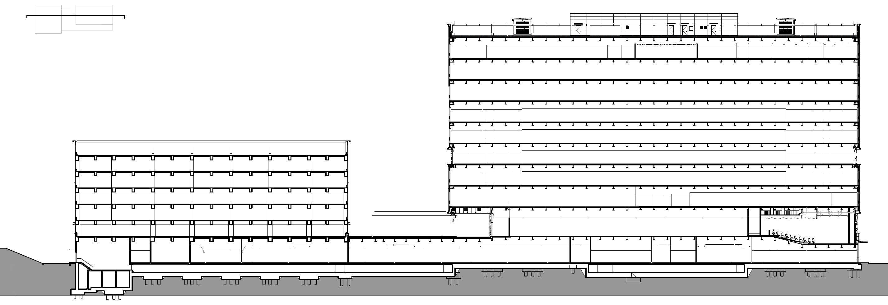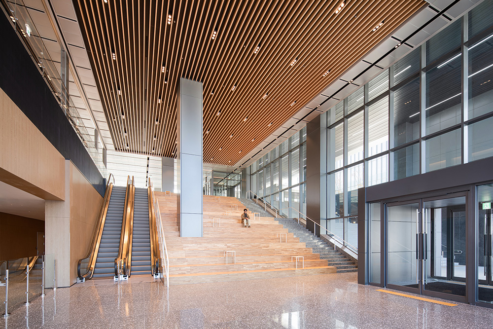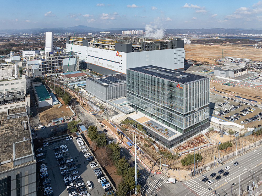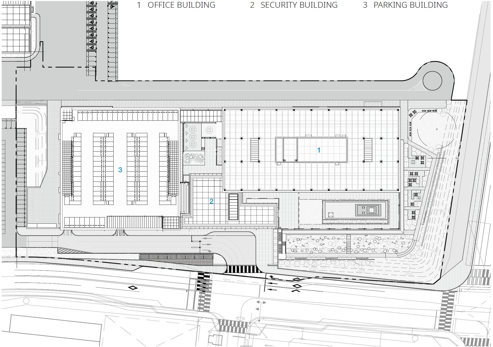 The Cheongju SUPEX Center is a newly constructed office space for SK Hynix M15 complex employees. The architect designed the space to enhance functionality and provide a comfortable and pleasant experience for workers. The SUPEX Center is situated at the level difference between the southern and northern sites, with a podium housing a cafeteria, fitness center, and mechanical rooms, topped by organically connected office buildings, parking buildings, and a guard house. The office and parking buildings, which have different functions, share a unified design language with similar colors, textures, and patterns. The guard house, with its columns and roof, acts as the main gateway of the SUPEX Center, strongly connecting the two distinct spaces. This unity ties the complex together, making the entire campus appear as a single architectural entity while respecting the individuality of each building. There is also a rest area for employees. The expanse between the office and parking buildings is one that all members pass through at least once. The architect envisioned this area as a place where employees could find rhythm and recovery time amidst their busy work schedules, as well as a space that naturally connects the interior and exterior through landscaping. Additionally, the Cheongju SUPEX Center is an environmentally friendly building that has achieved a Silver certification in LEED (Leadership in Energy and Environmental Design). Emphasizing sustainable resource management and energy efficiency is directly linked to creating a comfortable working environment. Using eco-friendly materials and providing an excellent indoor environment, the Cheongju SUPEX Center can significantly boost employee productivity.
