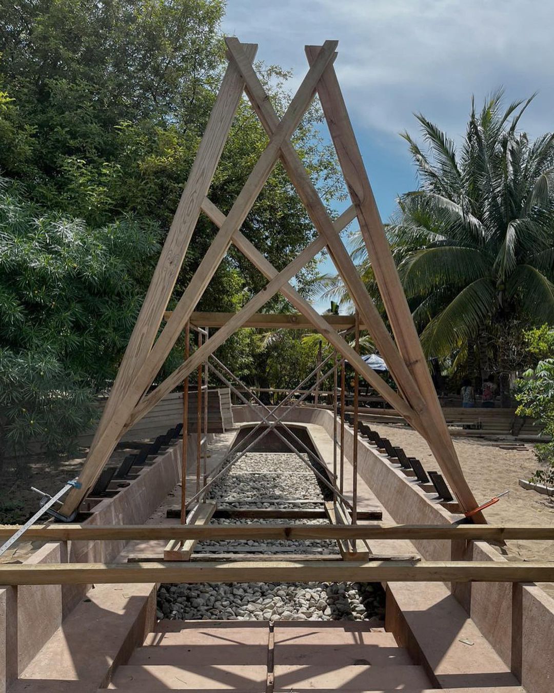 Secondly, the pavilion employs simple construction materials and techniques, including locally sourced wood and custom-made concrete ceramic pieces baked in high-temperature kilns.