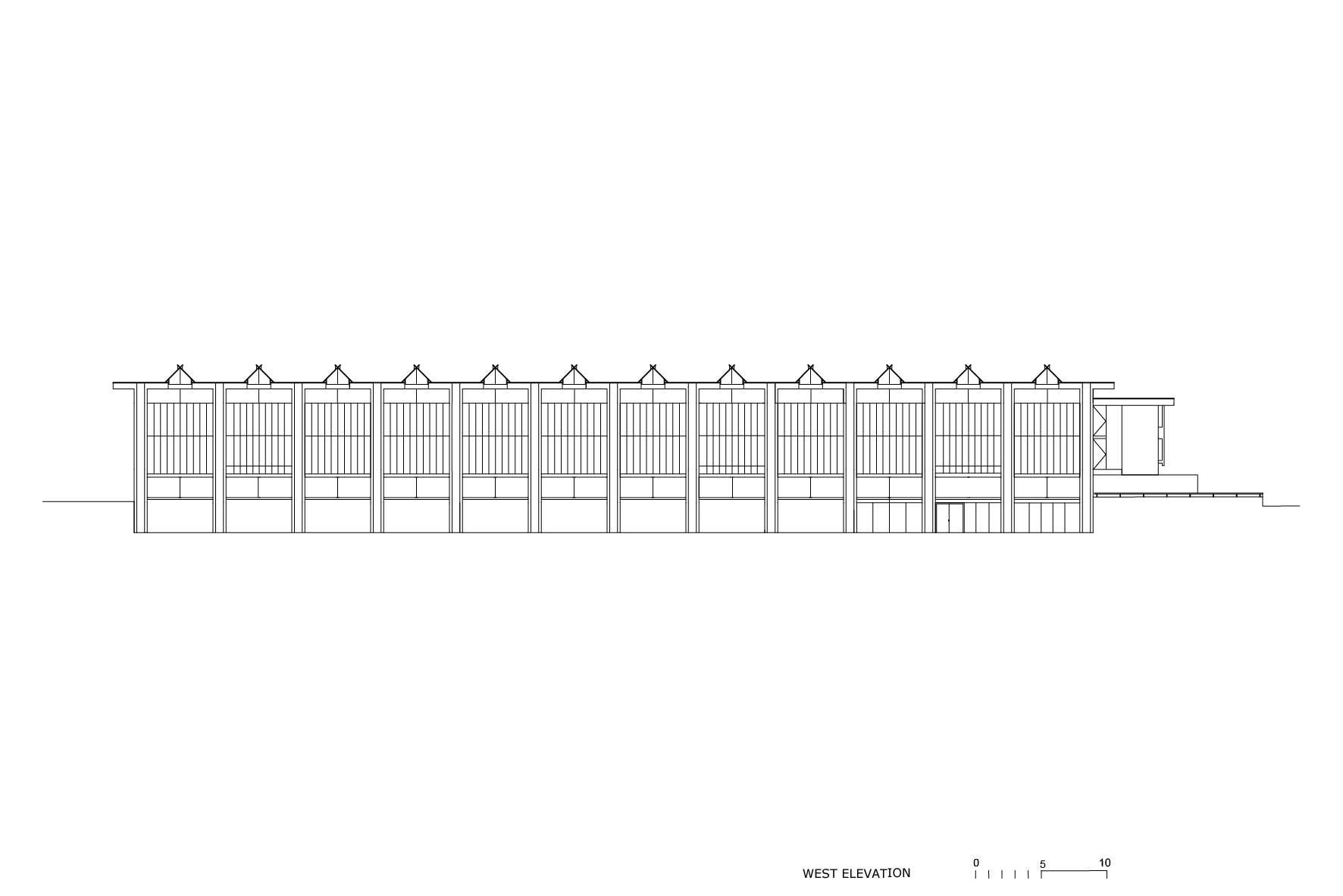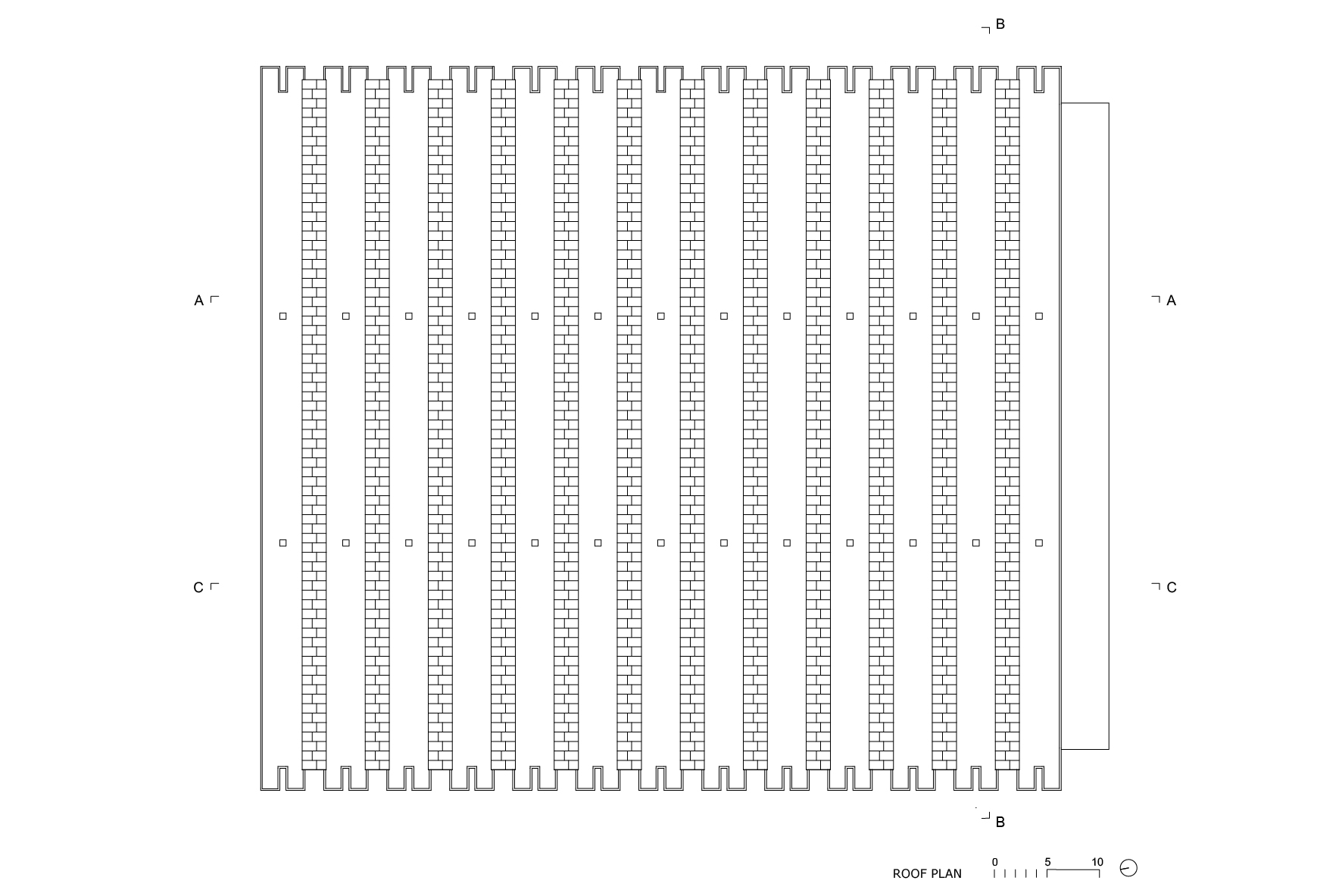 The new owner decided to refurbish it in 2022. The existing construction was protected, and, in any case, was so interesting as an expression of Sever’s exceptional architectural approach, that it would have been inconceivable to demolish it. The structure had been dimensioned for heavy machinery, and therefore a wide variety of modern applications could be considered without additional reinforcements. The biggest challenge was presented by the thermal insulation of the building. How to ensure modern climatic conditions in a building that was built with the reverse logic? The thin structure, full of thermal bridges, had originally served to remove excess heat generated by the printing presses. Now the principle had to be reversed. The visible concrete structures needed preserved and a new thermal insulation envelope added. The architects addressed this challenge with thermal insulation inside the building and additional glazing, which allowed the original glass prisms on the roof to remain intact. Glass prisms placed between the concrete elements provide natural light throughout the depth of the building. The renovation of the façade was based on Sever’s original plans that were not realized when the building was erected. He had wanted cement panels but they were too expensive, and so the façade was instead made with modular bricks. Reinstating Sever’s original idea provided a solution for the technical upgrade of the building.