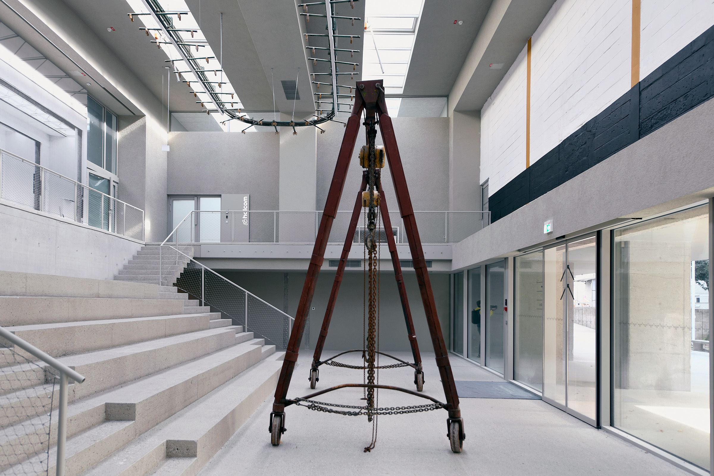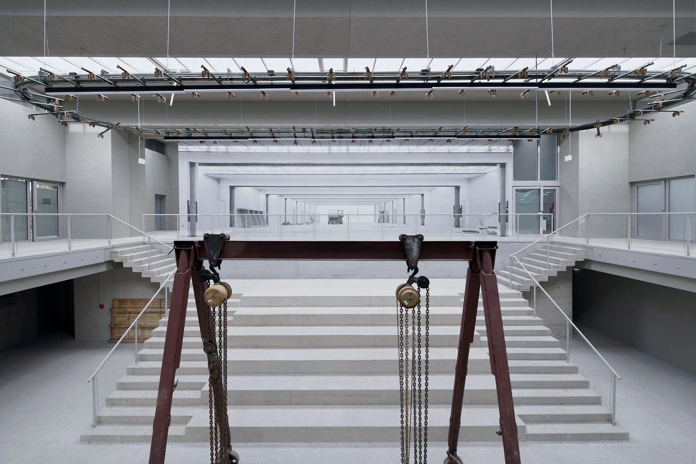 The only significant change to the original structure of the building was a new entrance. Originally, the workers of the printing house entered the building through the dressing rooms in the office wing. This was not suitable for the purposes of the renovated building. A new monumental entrance was introduced on the south side. The amphitheatrical staircase creates a sort of urban square within the building, welcoming people who enter, and serving as a meeting point. It also provides a venue where events and performances can take place. It contains a segment of the printing machinery from the original building, thus presenting and preserving in memory its former use.