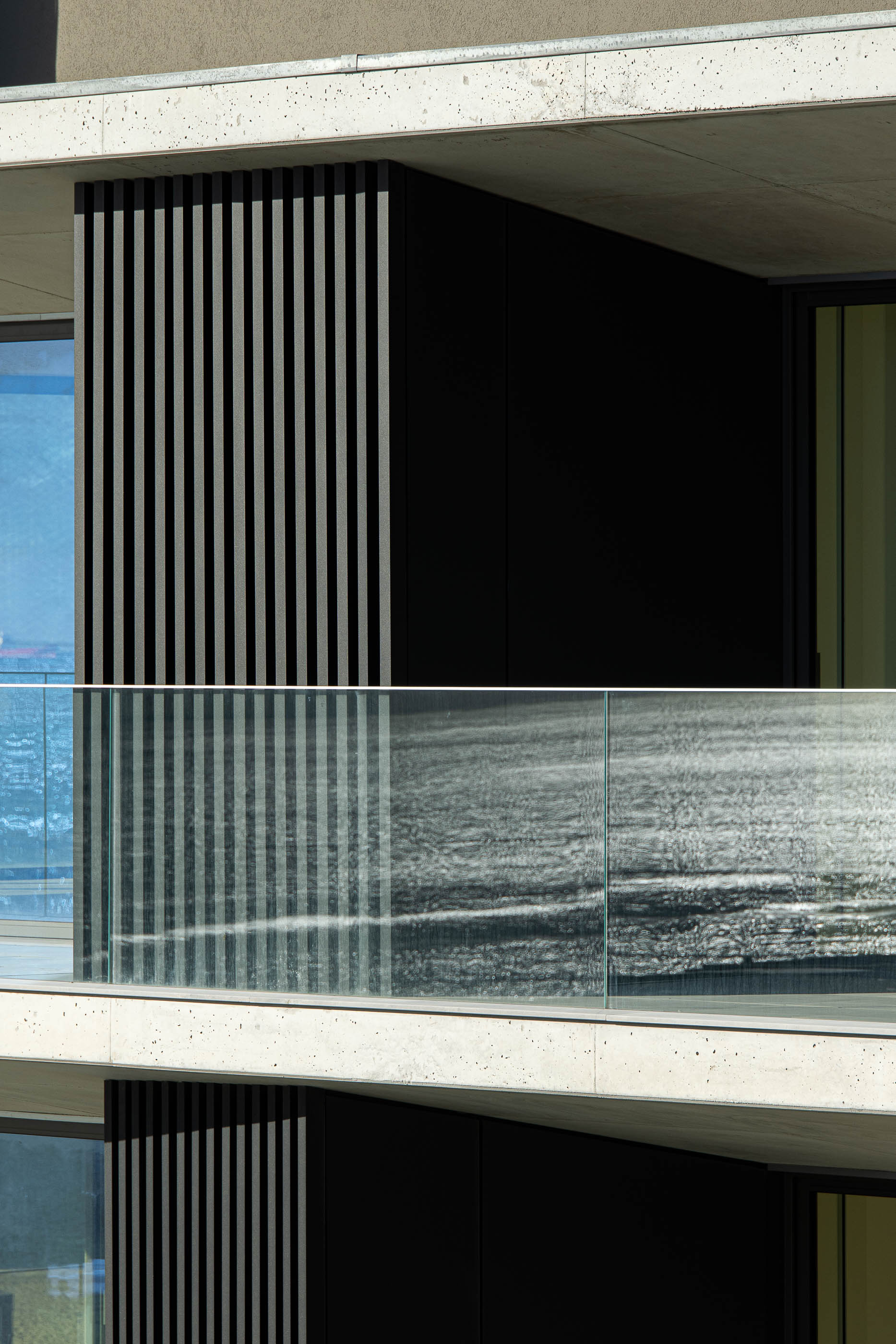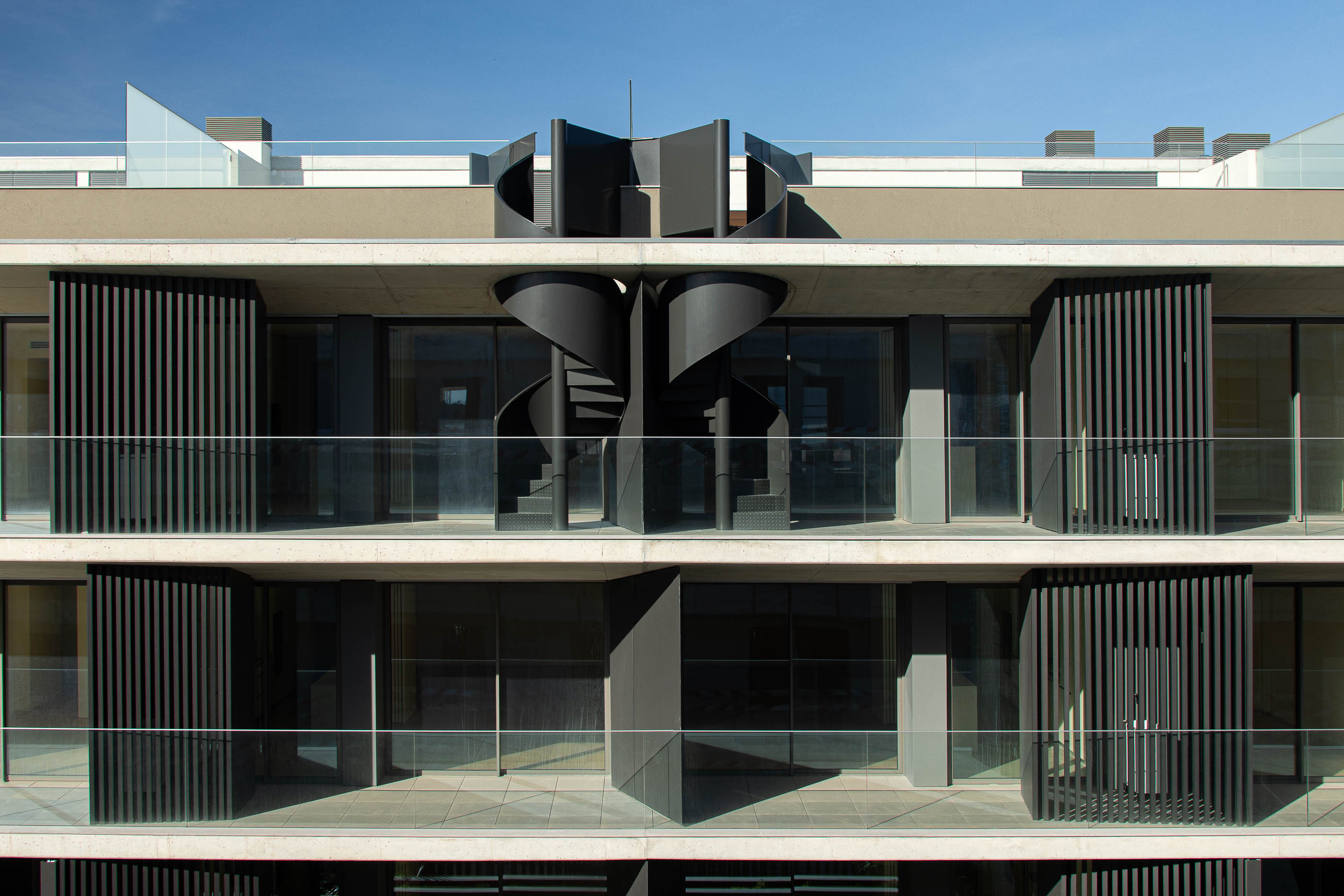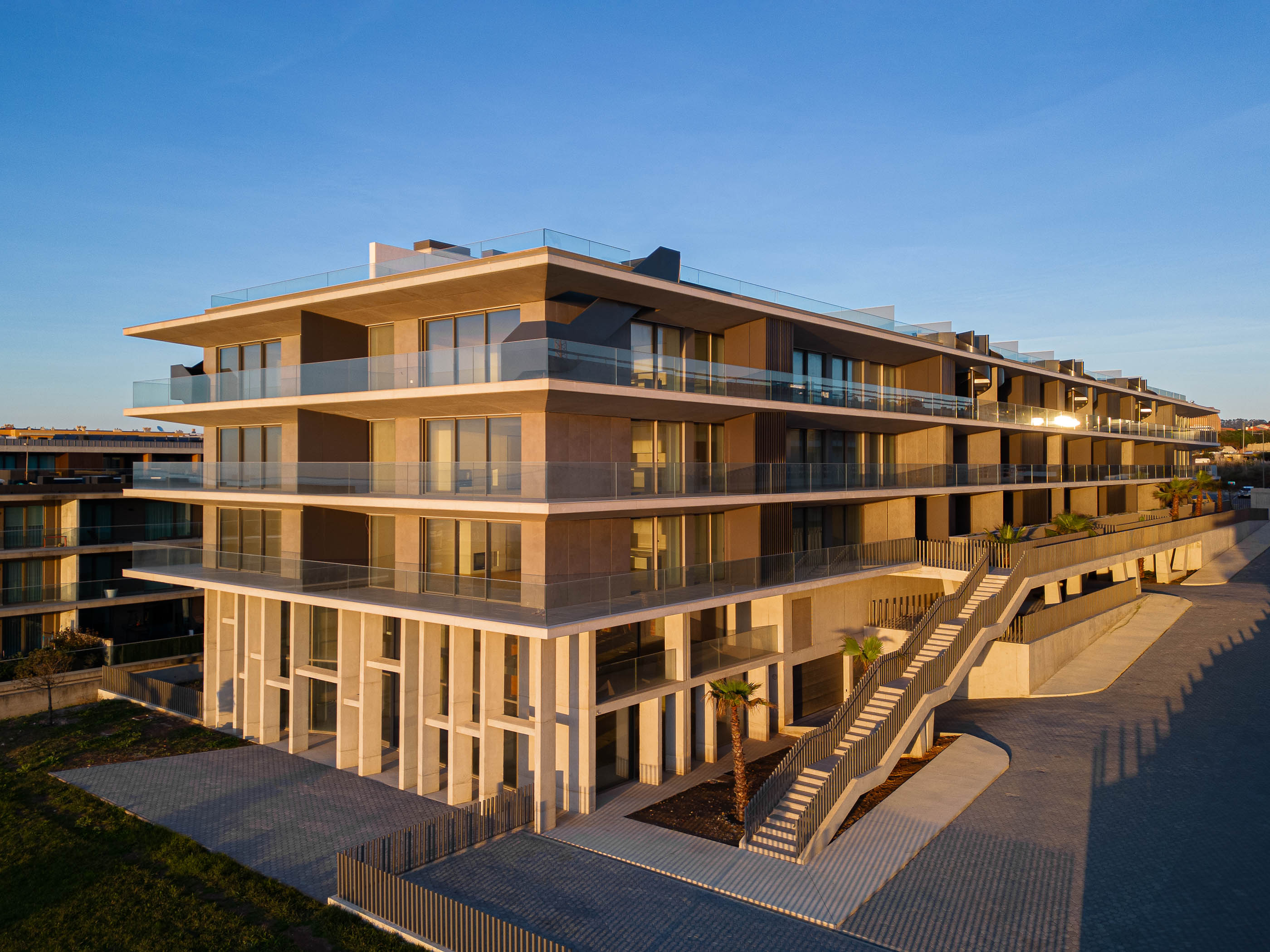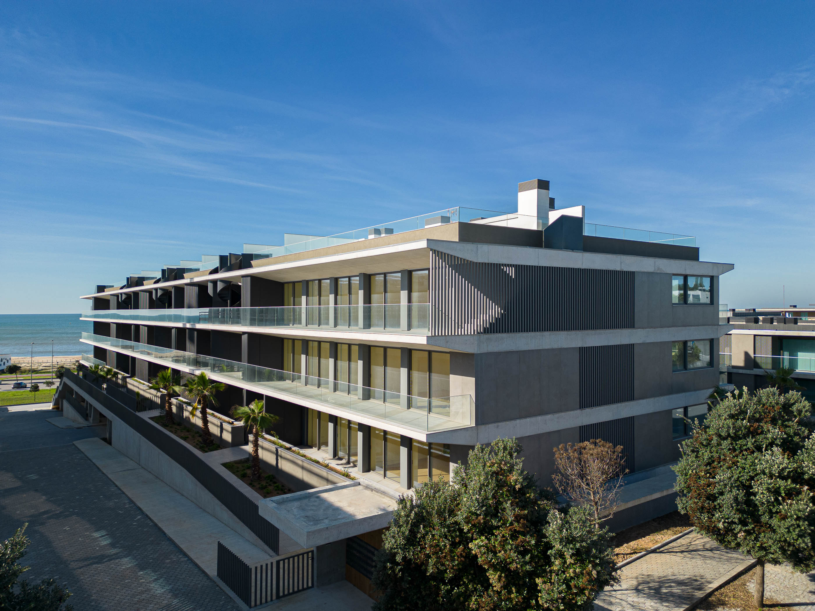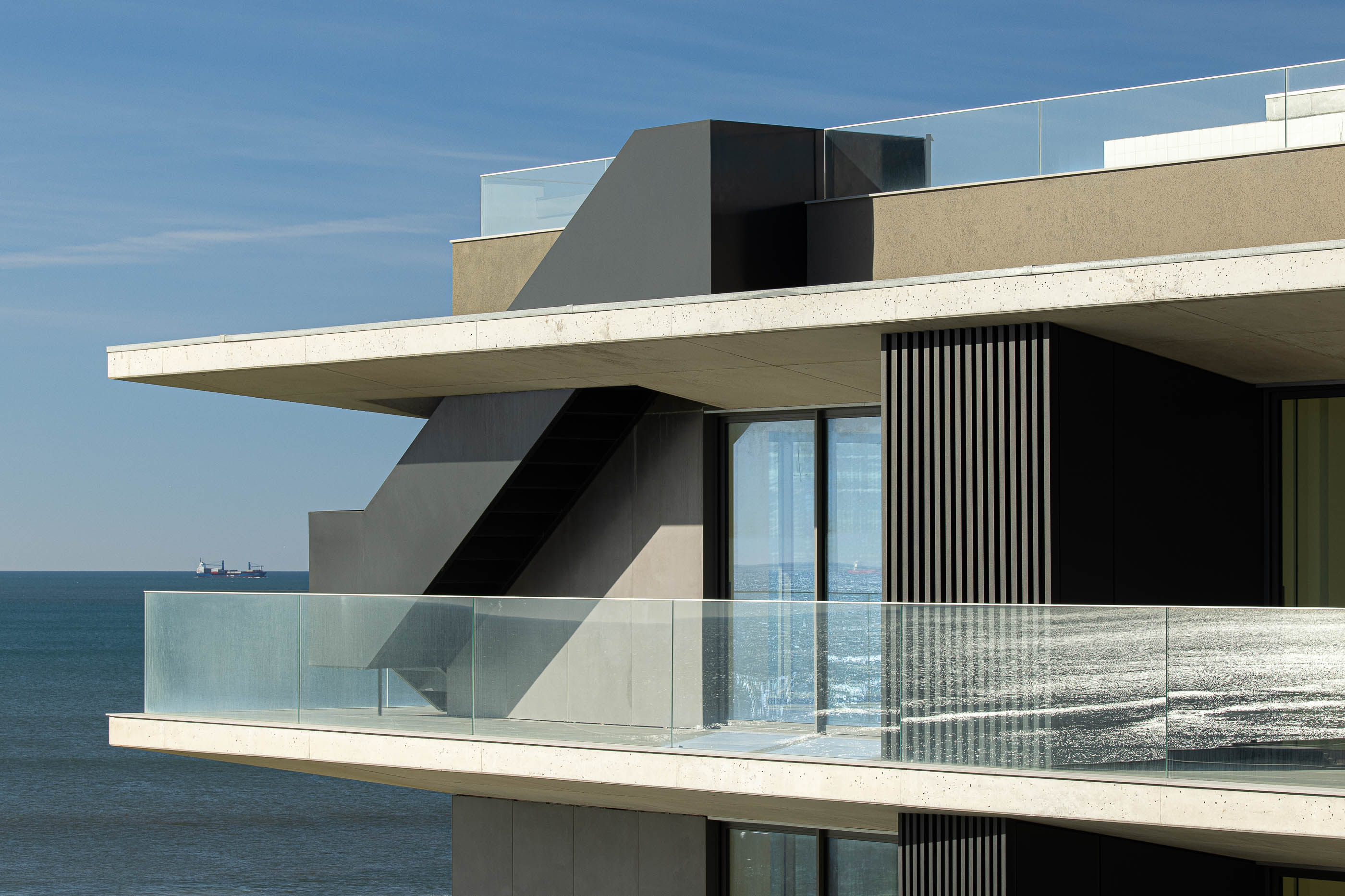Sunlight exposure and the advantage of sea views were crucial factors in determining the functional organization of the apartments. Every room in Edificio Seashore offers views of the surrounding sea. Most bedrooms are positioned on the north side, while living rooms and kitchens open toward the balconies. Vertical slates animate the building and open transparently toward the south. In contrast, the north side features special aluminum-coated windows facing the sea, providing privacy while offering splendid views. The external stairs leading to the roof connect to outdoor leisure and living spaces, including small swimming pools and jacuzzis.