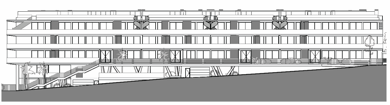 The Edificio Seashore is located on a rectangular site with a steep yet consistent slope running from east to west. This topographical feature enhances accessibility to the beach and provides exceptional views of the coastline and the sea. The architect designed a horizontal mass apartment building on this site, which is three stories above ground, and extends to five stories as it follows the steep slope. The reinforced concrete slabs emphasize horizontality and simplicity throughout. This choice of materials was made to prevent the building from aging and to facilitate easy maintenance.