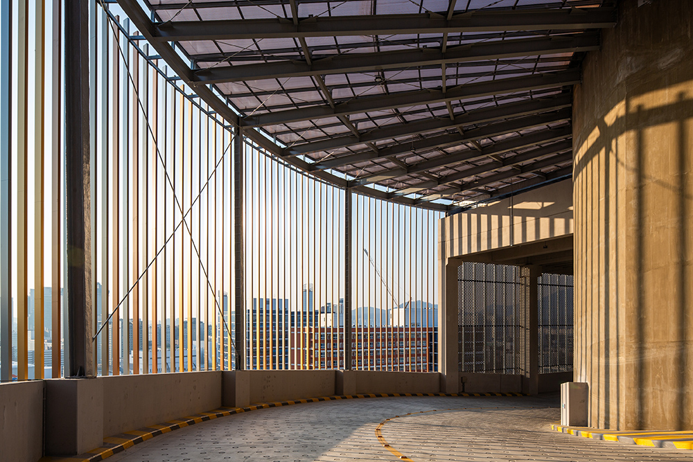 The logistics center was segmented by function: a piloti structure on the ground floor for vehicle access, a massive single-volume low-temperature cold storage facility from the second to sixth floors, a setback ambient temperature warehouse on the seventh floor, and facilities for employees, including a spacious rooftop parking lot and roof garden on the eighth floor. By using different colors and breaking up the mass, the building was transformed into a construction resembling a gallery rather than a simple box. The large ramp at the entrance of the site could generate noise and light pollution from trucks, potentially causing conflicts with local residents. To mitigate this, the entire ramp was enclosed with vertically angled aluminum louvers, which not only control the noise and light but also turn the structure into a large, artistic object within the city. During the day, the vertical fins of various colors create a visually appealing effect, and at night, the ramp becomes a giant lantern that illuminates the city as a landmark.