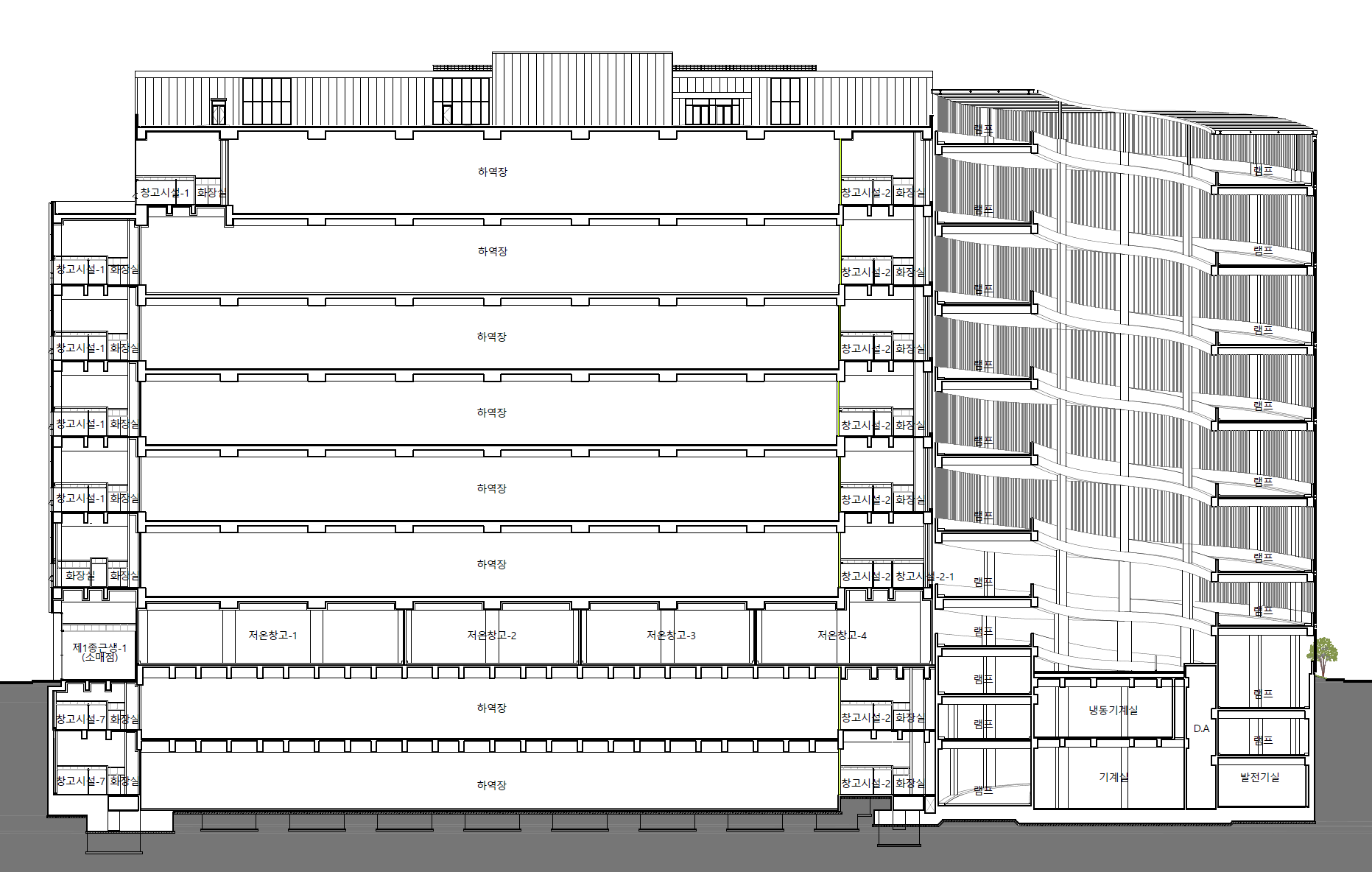 차량 접안을 위한 지상층의 필로티, 2~6층의 거대한 단일 볼륨의 저온 냉동창고, 7층의 셋백된 상온 물류창고, 8층의 넓은 옥상 주차장과 지붕정원을 가진 근무자들을 위한 시설 등, 용도별로 매스를 분절하고 색채 활용을 통하여 단순한 박스 형태가 아닌 갤러리와 같은 형태를 연출했다. 대지 초입에 자리잡은 거대한 램프는 화물차 소음과 차량 불빛이 발생하여 지역 주민들과의 갈등으로 이어질 수 있다. 따라서 각도를 조절한 수직 알루미늄 루버 핀으로 램프 전체를 둘러싸서 자동차 불빛과 소음을 조절함과 동시에 도심 속의 커다란 예술적인 오브제가 되도록 하였다. 이렇게 램프는 주간에는 다채로운 색상의 수직핀으로 시각적인 즐거움을 주고, 야간에는 거대한 랜턴으로 도심을 밝히는 랜드마크가 되었다.