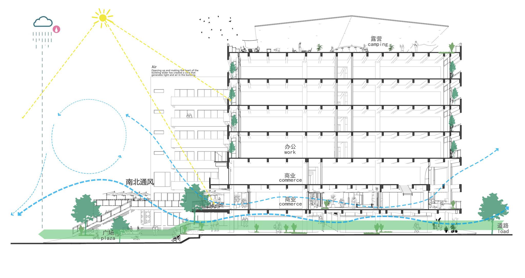 The first floor enhances the sense of space with its high ceilings which creates a unique wind corridor. The second and third floors are opened up, adopting a multi-level town layout that accommodates various tenant stores, offering street-like scenery reminiscent of intersections. The first-floor park employs strategies such as terraces, pedestrian stairs, and vegetation preservation to create a microclimate and reduce reliance on cooling systems.