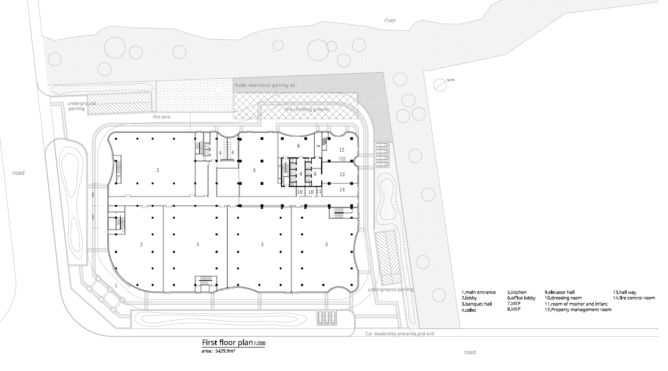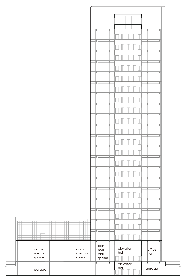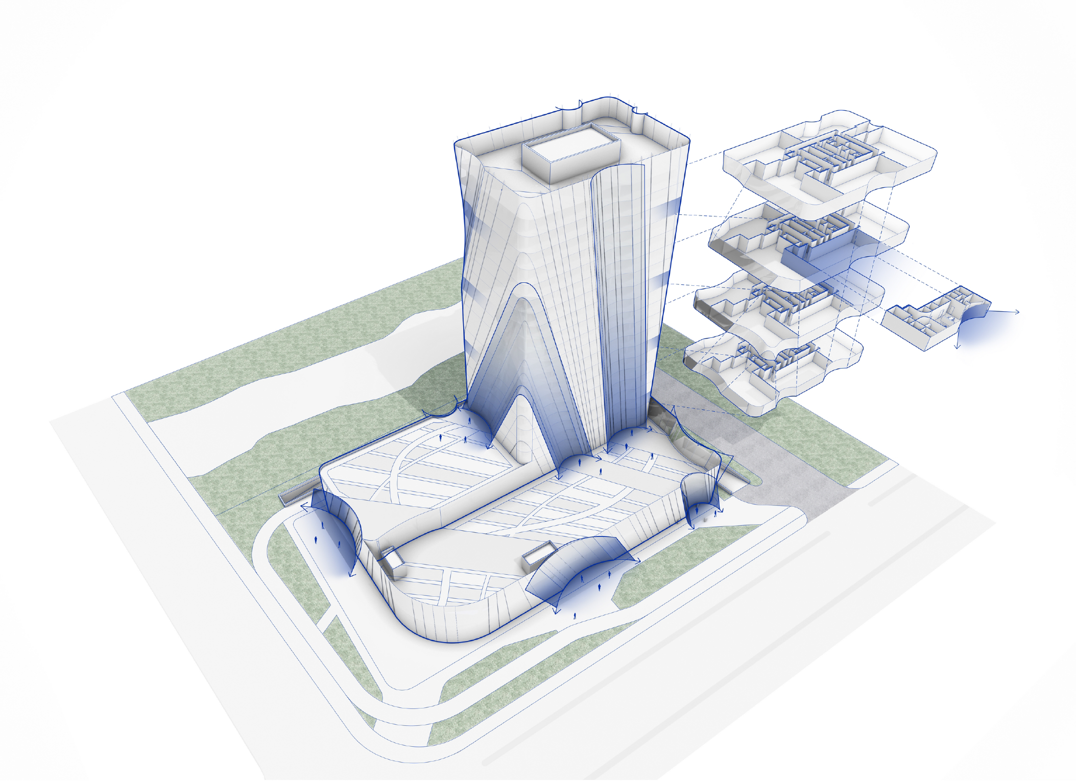 The Ruian Qiaomao Tower is composed of three parts: a plaza at the front of the first floor, a podium, and the tower itself. The podium includes commercial spaces and an auditorium, while the tower mainly consists of office spaces. Although these functional modules are separated without direct connectivity, a large ribbon-shaped concave form crosses the areas, connecting the exterior and interior. Additionally, the interior allows for a cohesive urban image, offering views of the flow of the entire city from the first-floor entrance and plaza.