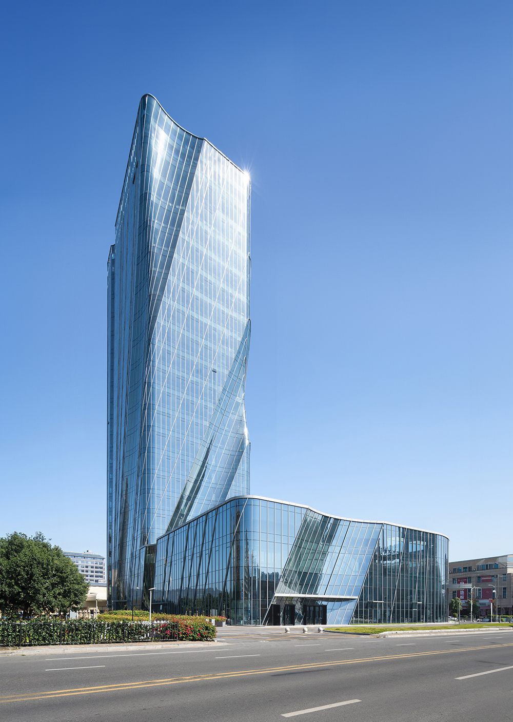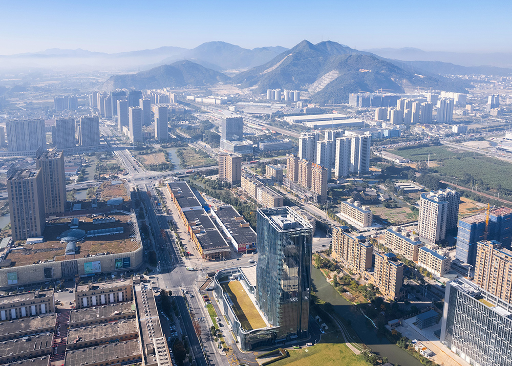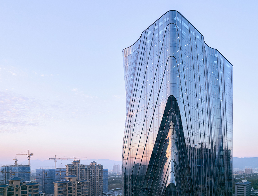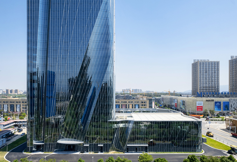 Ruian is a region globally recognized for its electric vehicle components and plays a crucial role in the automotive industry using new energy. The architect reflected the themes of “speed” and “future” from the rapidly developing city and the new energy automotive industry in the building. The sense of power generated by the drive to move forward is expressed through architectural language, resulting in large, powerful lines in the building's mass and structure. Ribbon-shaped reflectors embedded in the glass curtain wall insert the city's landscape into the building's volume in a surreal manner, and the reflective surface adds a futuristic image. The form of the building, which conveys a sense of speed, strengthens the urban character in a form of architectural language on both material and abstract levels.