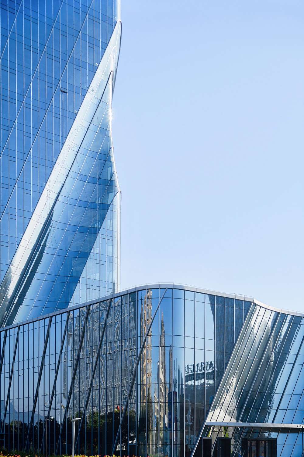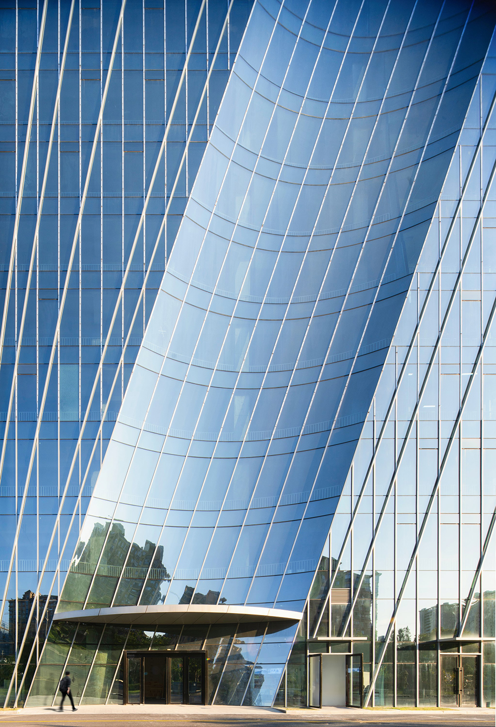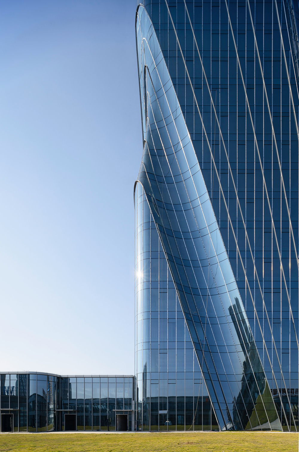 Ruian is a region globally recognized for its electric vehicle components and plays a crucial role in the automotive industry using new energy. The architect reflected the themes of “speed” and “future” from the rapidly developing city and the new energy automotive industry in the building. The sense of power generated by the drive to move forward is expressed through architectural language, resulting in large, powerful lines in the building's mass and structure. Ribbon-shaped reflectors embedded in the glass curtain wall insert the city's landscape into the building's volume in a surreal manner, and the reflective surface adds a futuristic image. The form of the building, which conveys a sense of speed, strengthens the urban character in a form of architectural language on both material and abstract levels.