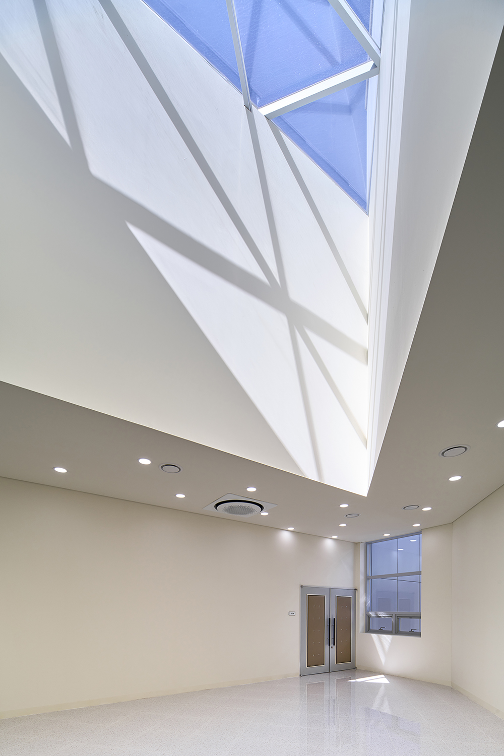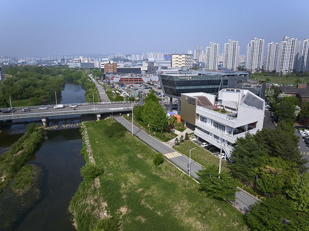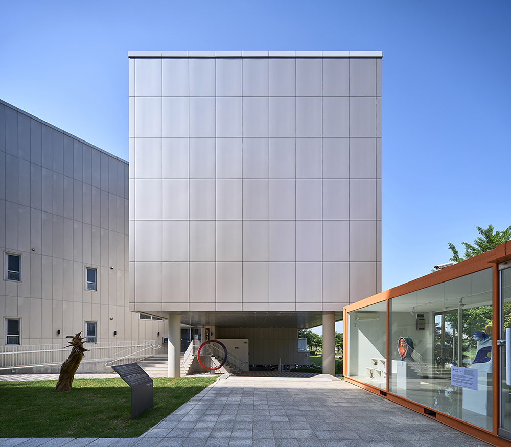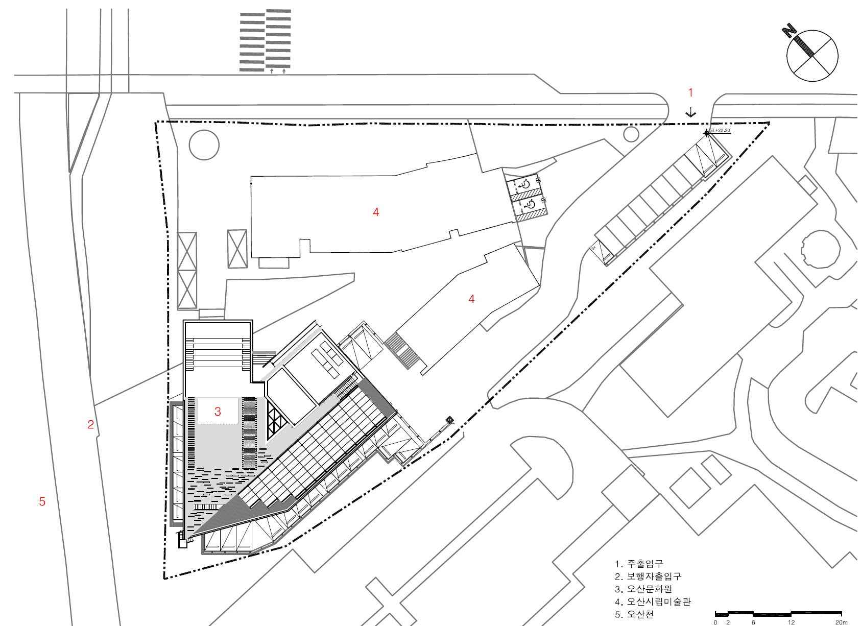 The Osan Cultural Center is a project that involves the construction of a new cultural center building on a triangular site that includes an art museum. To the northwest of the site flows the Osan Stream, and to the east is the Osan City Art Museum. The architect designed the center to bring the beautiful natural scenery of the Osan Stream into the architectural space without disrupting the various existing pedestrian pathways leading to the site. To achieve this, the architect minimized changes to the current access routes to the museum and adapted to the system that the museum had in place. As multiple entry points were created, the building can be viewed from various angles, offering a diverse encounter in terms of form and façade. A garden and a performance venue were planned for the rooftop, providing spaces for relaxation and hosting various cultural events.