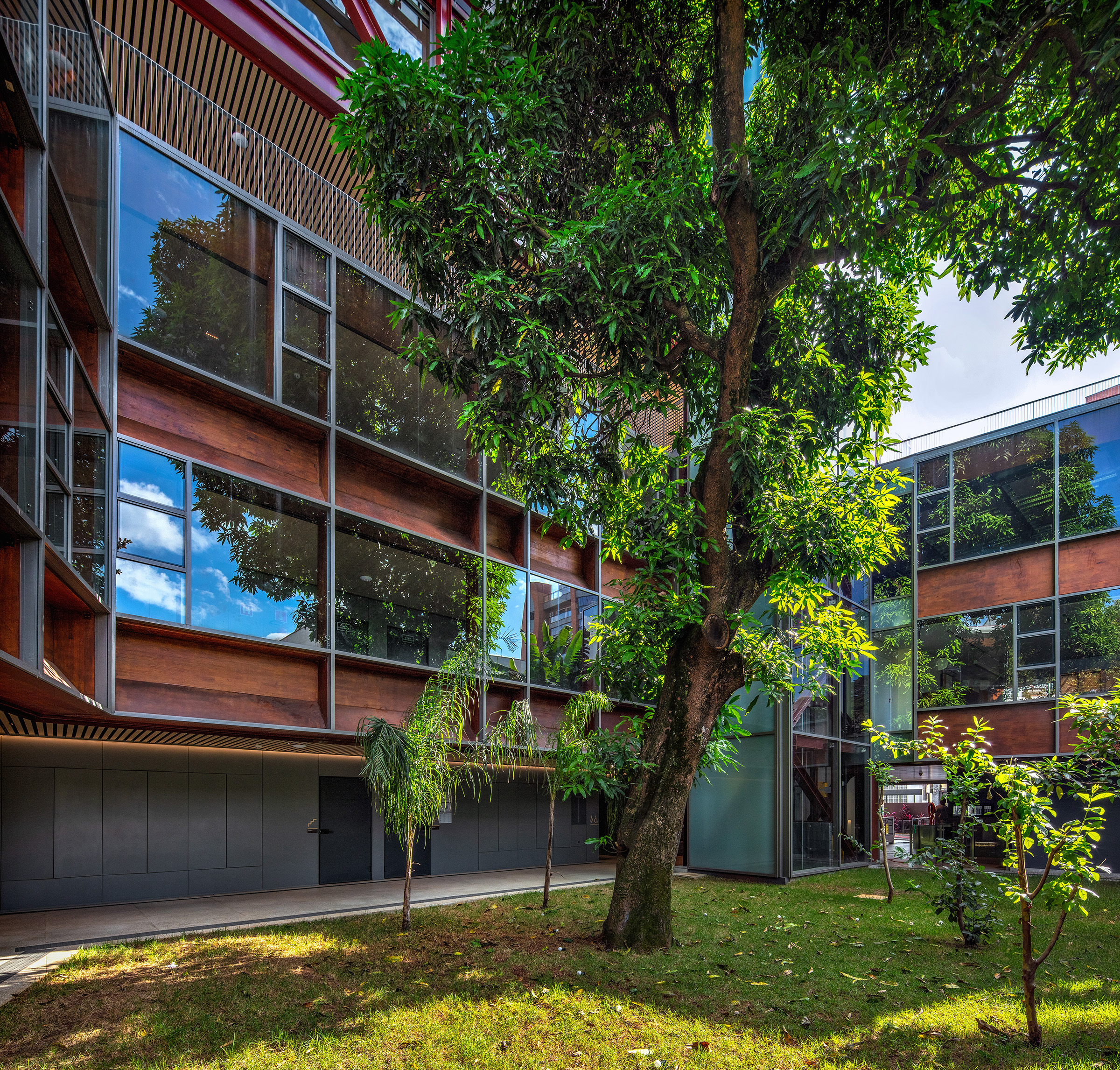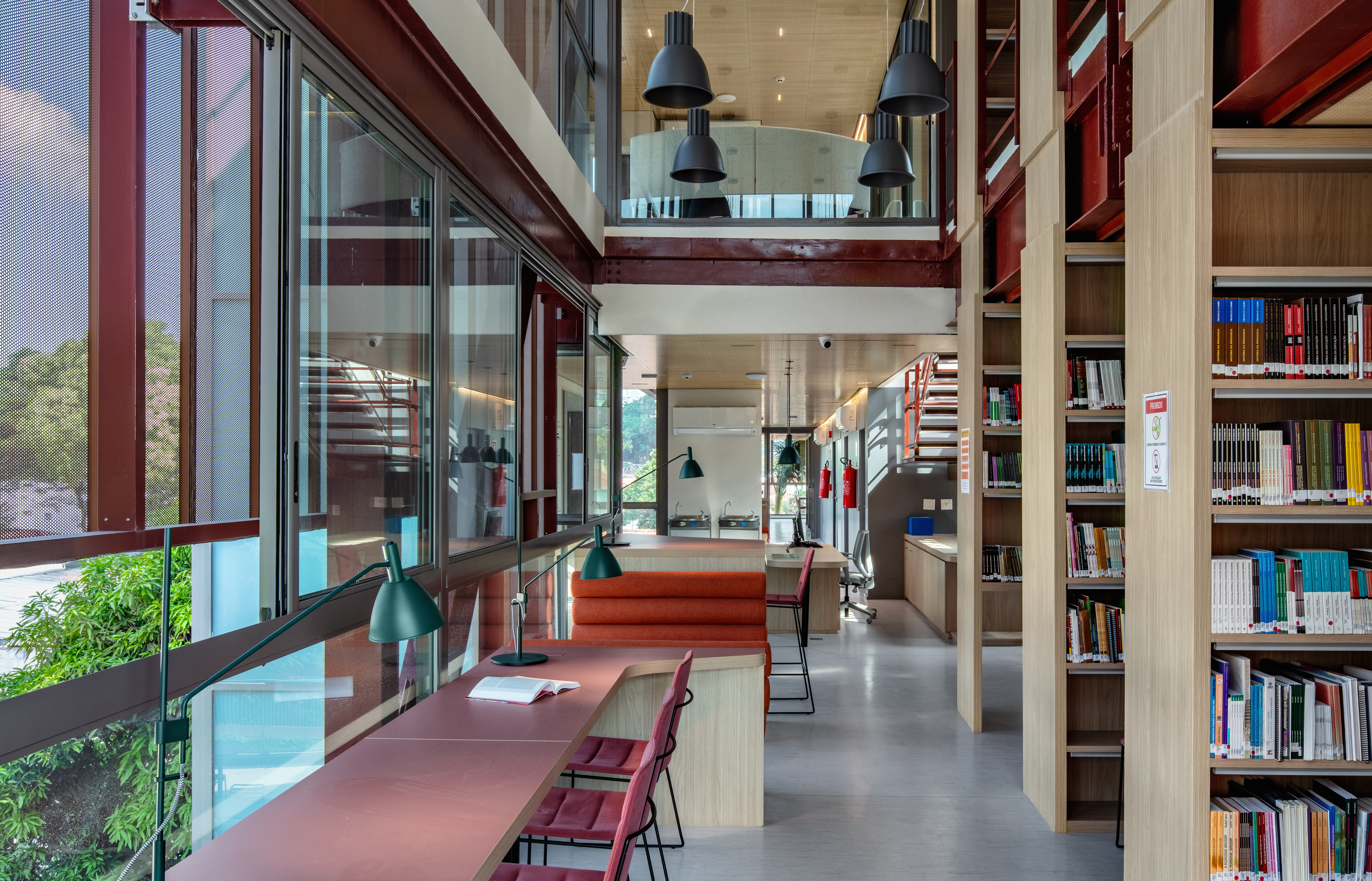 To connect the floors externally, two glass-enclosed panoramic elevators were installed in the central courtyard, offering views of the mango tree and the surroundings of the headquarters. On the rooftop, a suspended block was implemented to house administrative uses, and the library was installed in the highest position of the building, like a lighthouse, as an allegory of the importance and commitment to the pursuit of knowledge.