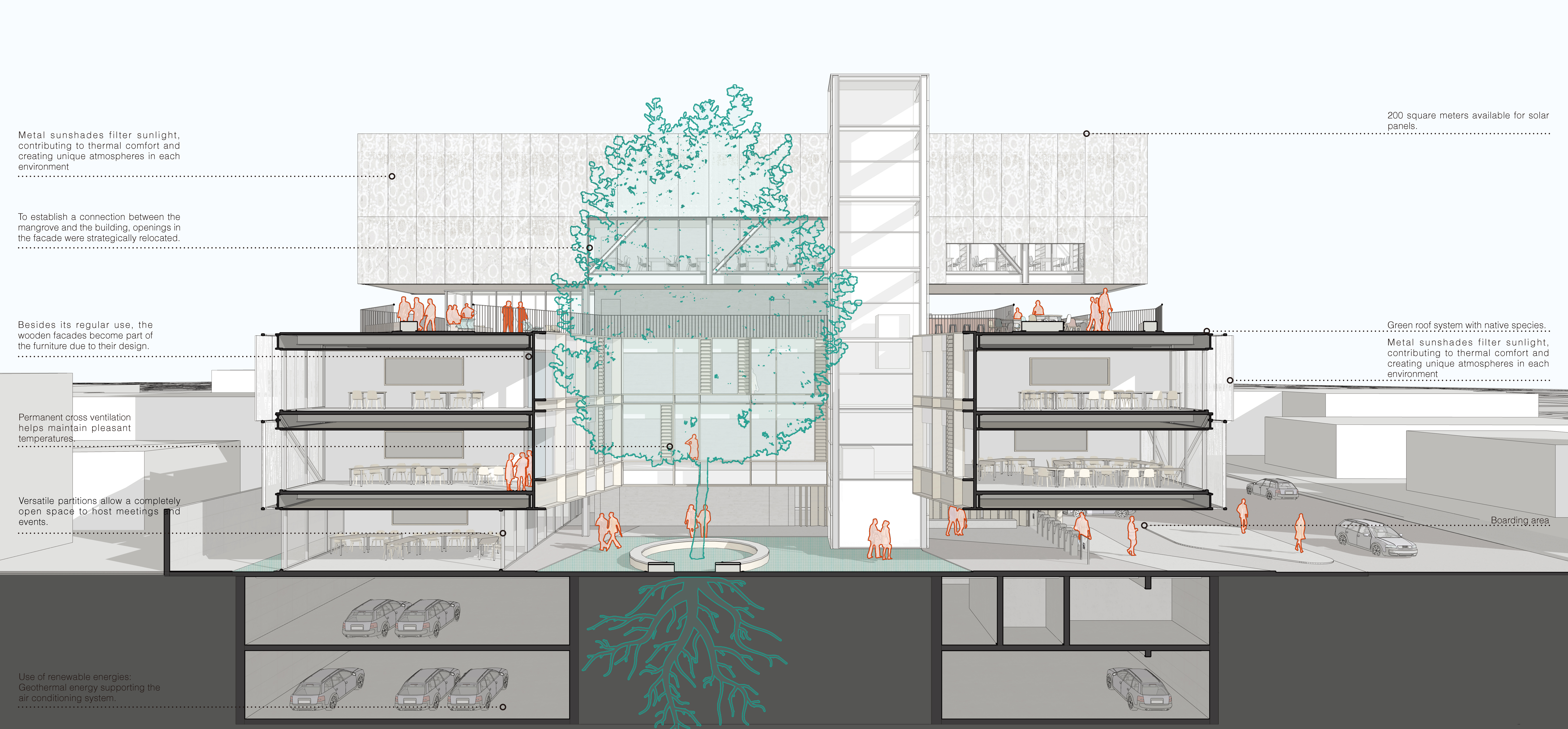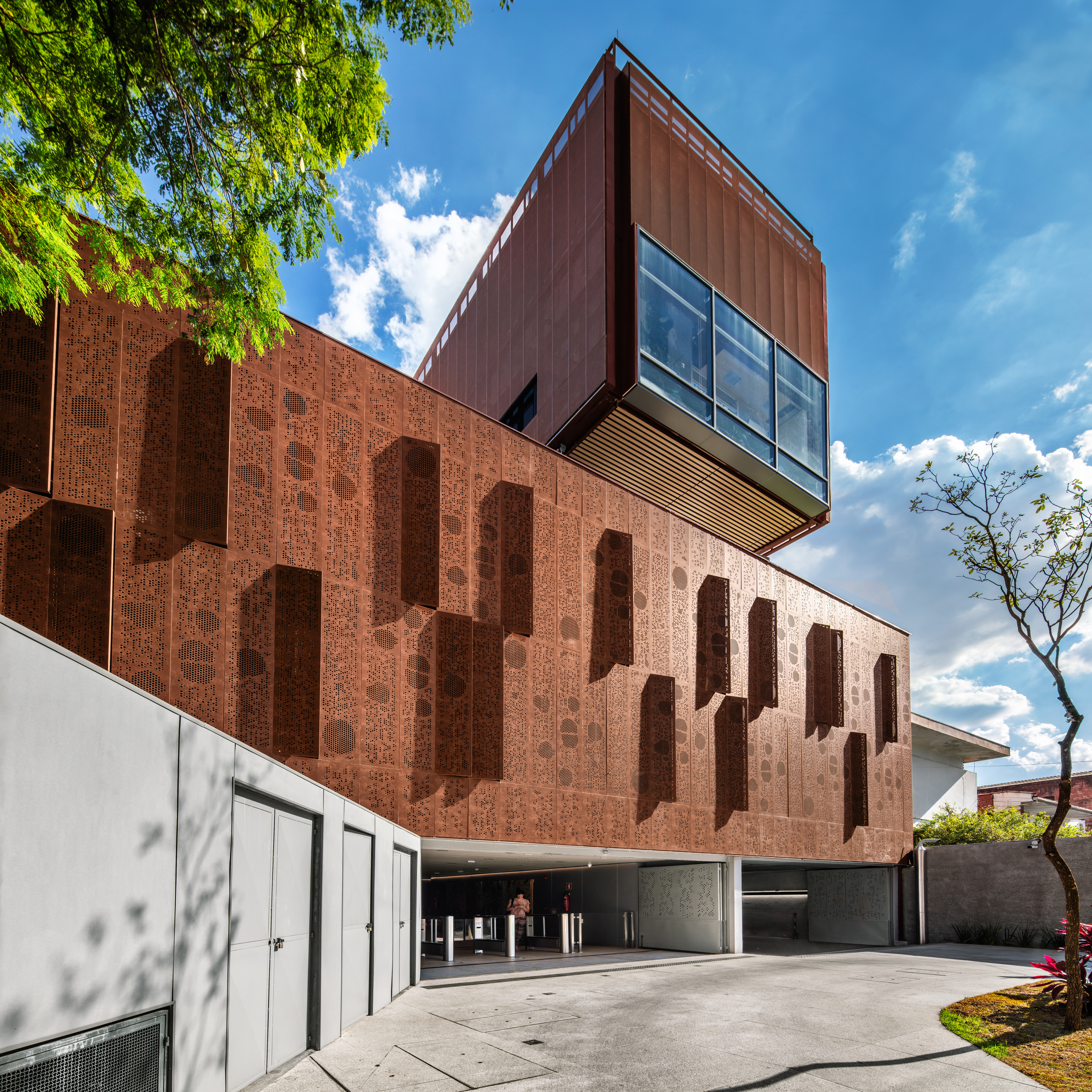 Second, symbolically, with the visual application of the organic patterns of wood seen on a microscopic scale on the metallic surfaces of the cladding and shading devices. "It's a reference to wood without using the material, " highlights architect Mario Biselli, managing partner of Biselli Katchborian.